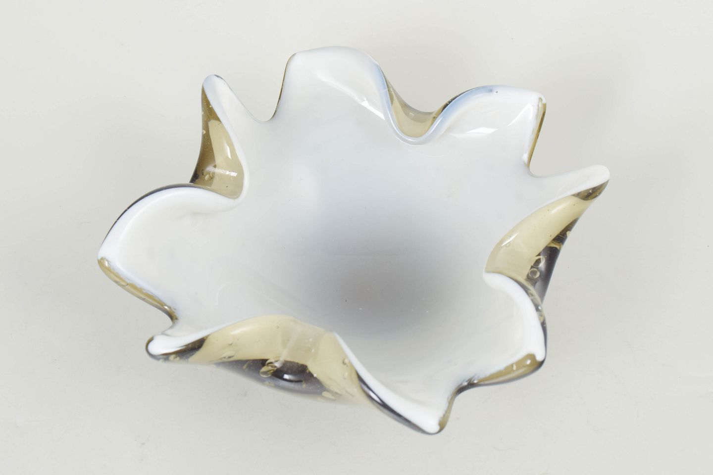 Murano glasskål i organisk form.Dekorativ mundblæst skål med bølgende kant og indfangede luftbobler i klart og gyldent glas.