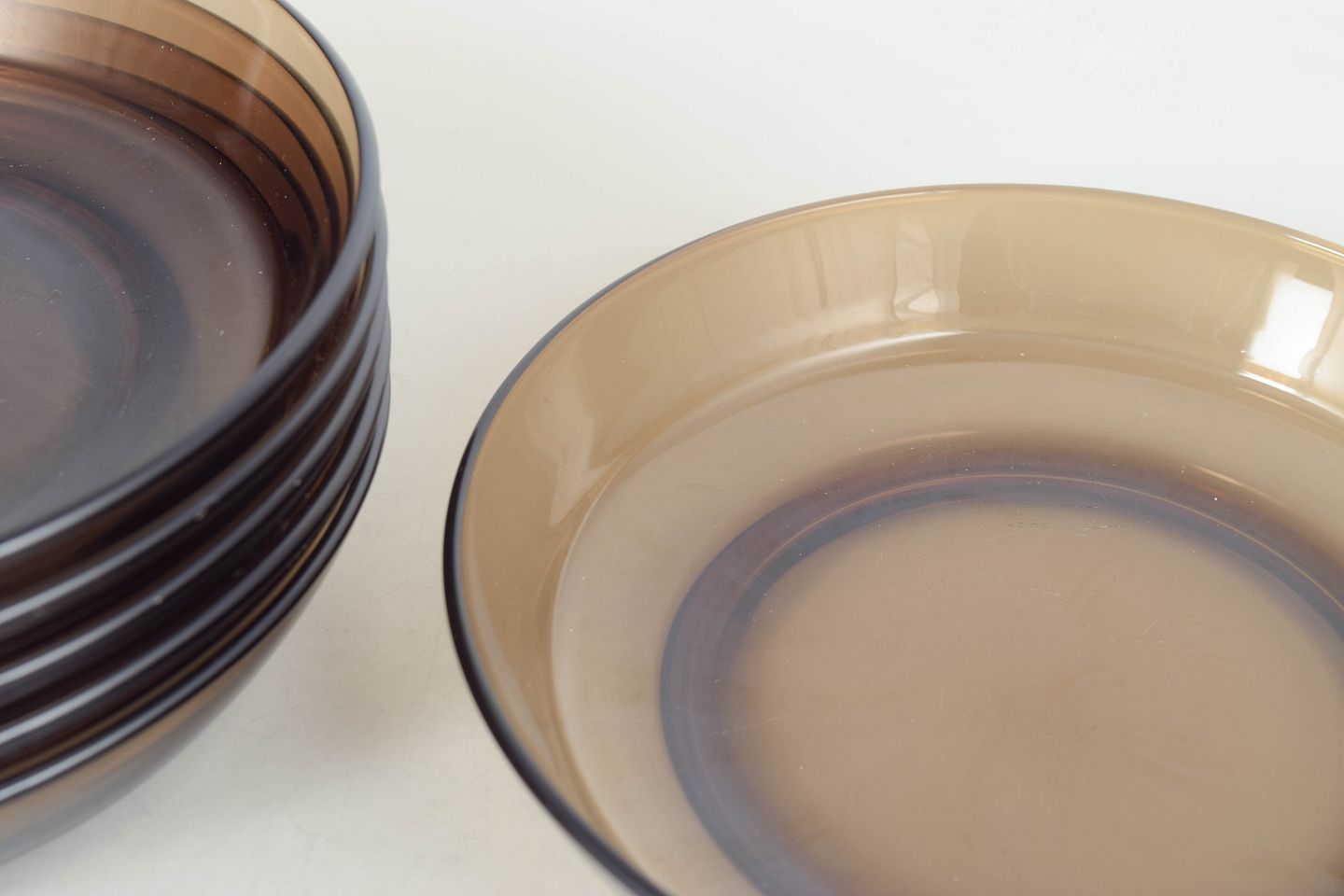 Vereco, sæt af seks .Seks dybe tallerkener i presset glas med lav, bred form og røgfarvet toning, fremstillet i Frankrig og mærket fra producenten.