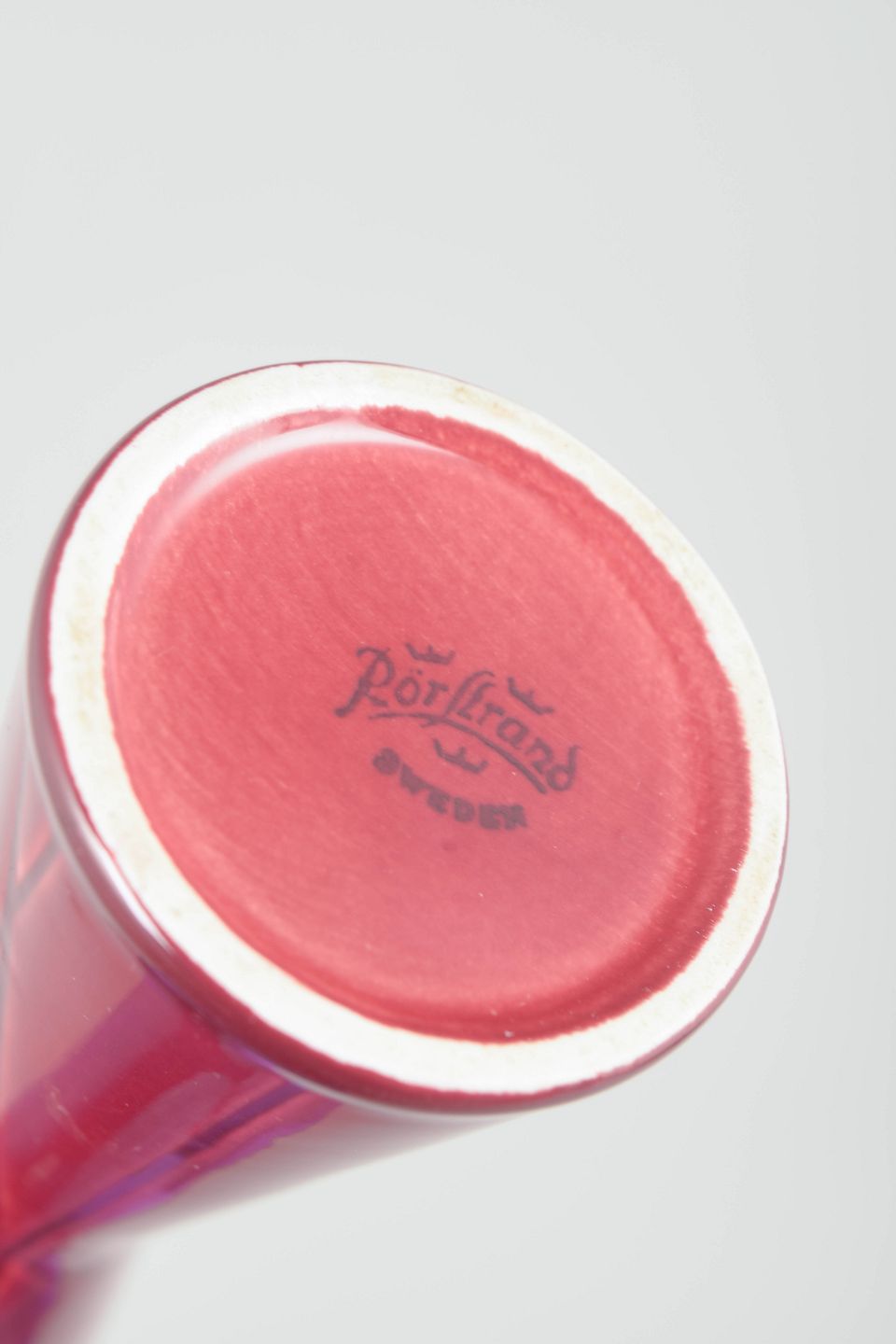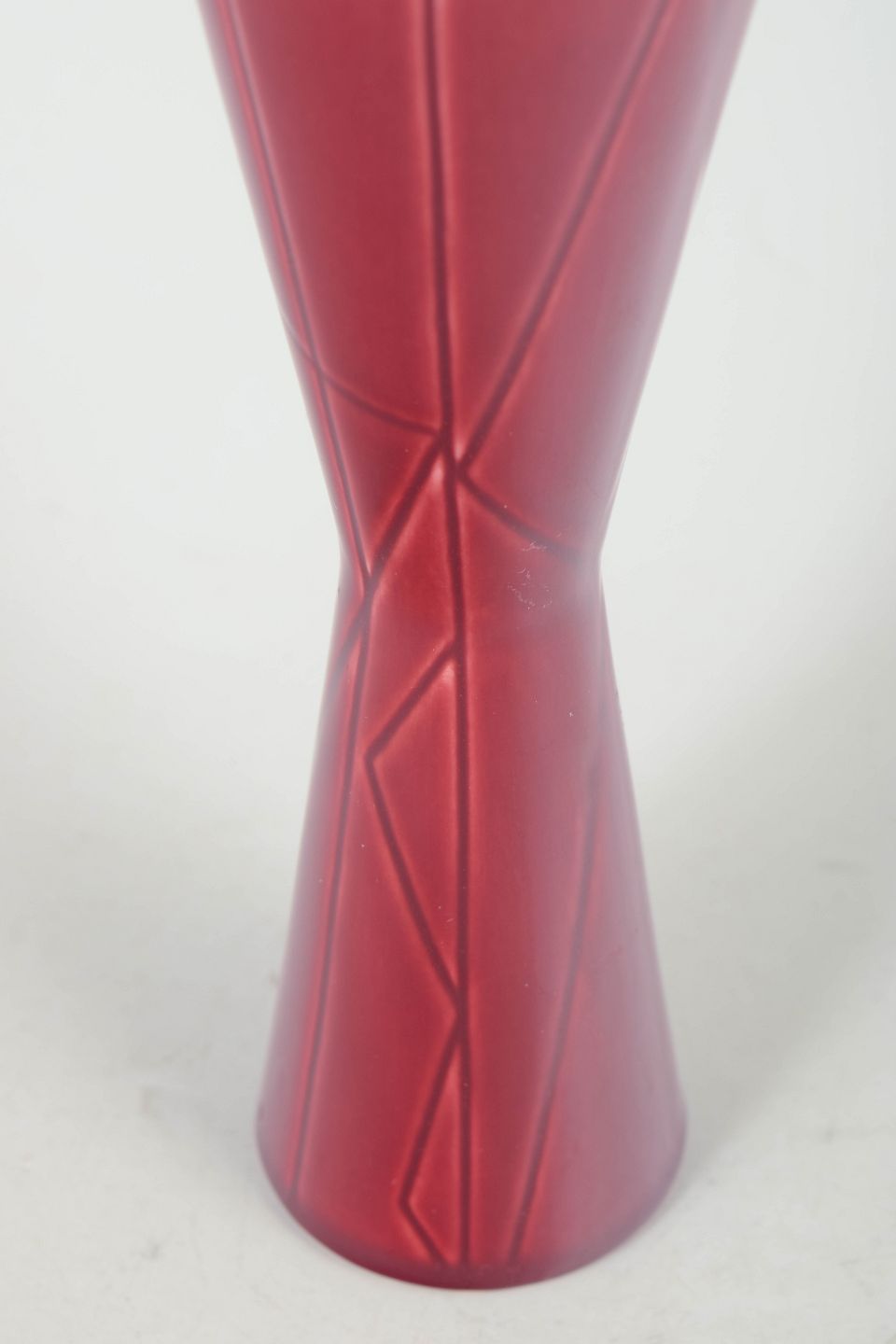 Carl-Harry Stålhane for Rörstrand, California vase.Slank timeglasformet vase i glaseret stentøj med dyb rød glasur og indridset dekor. Modellen "California" er et karakteristisk eksempel på Stålhane’s elegante og stramt formgivne keramik fra perioden.