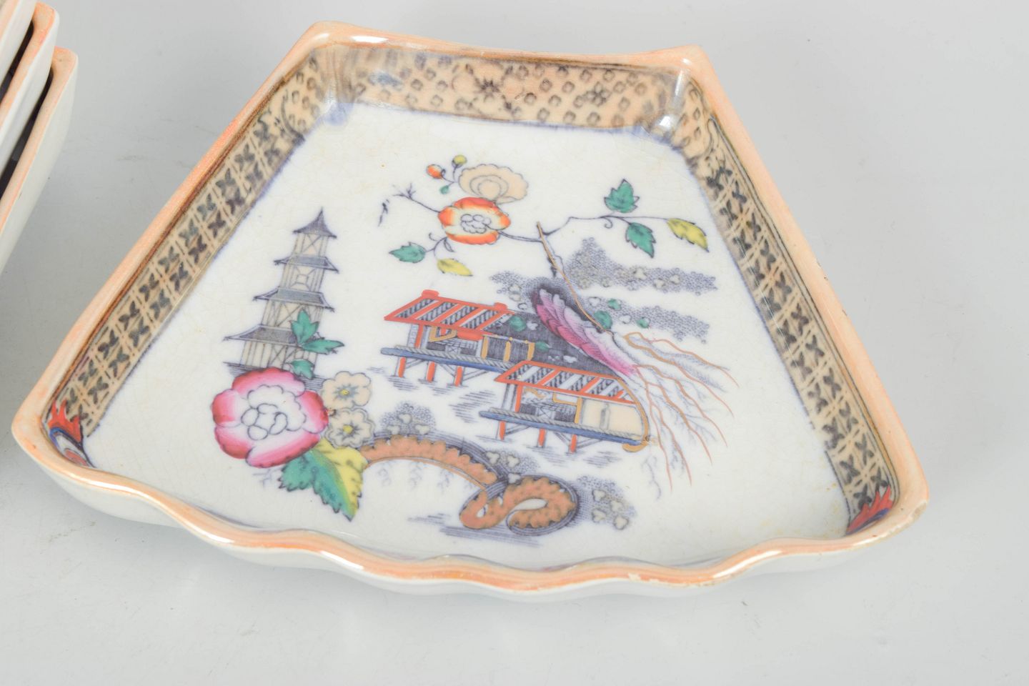 Rörstrand Japan, sæt af fire fade.Dekorative firkantede fade i fajance med polykrom dekoration i orientalistisk japansk stil med pagodemotiv, fugl og blomster. Model Japan, produceret i perioden 1866–1925 og dateret til 1880’erne.