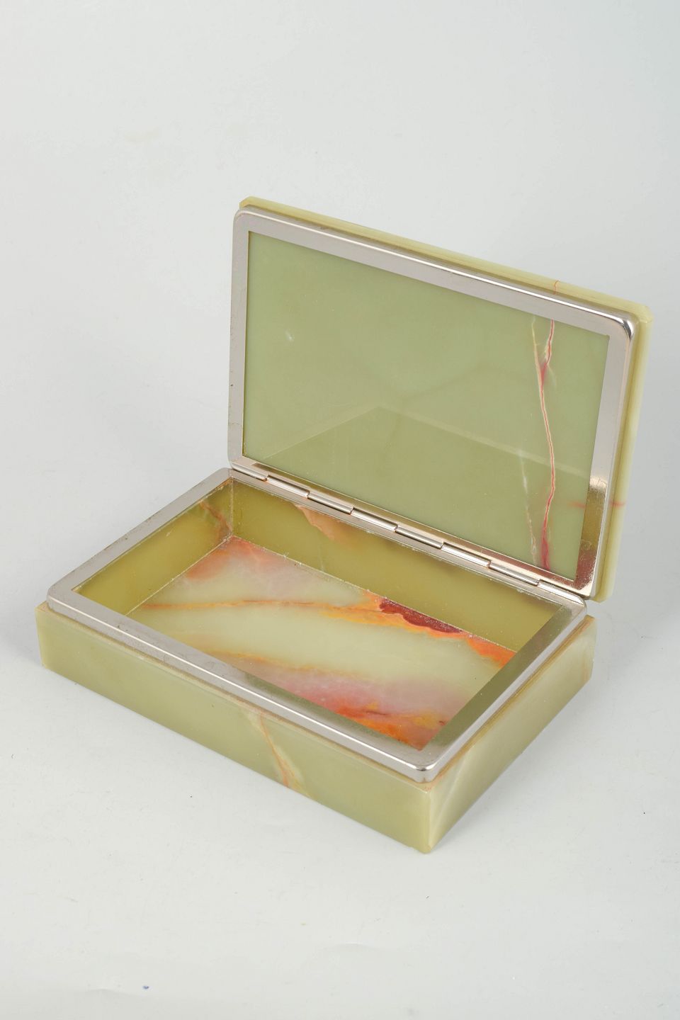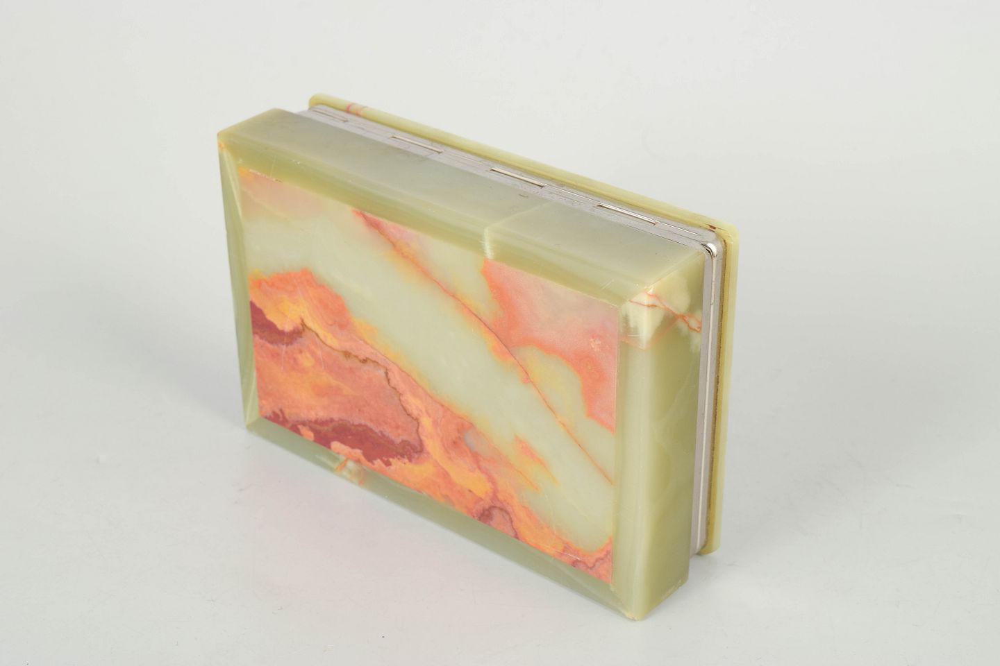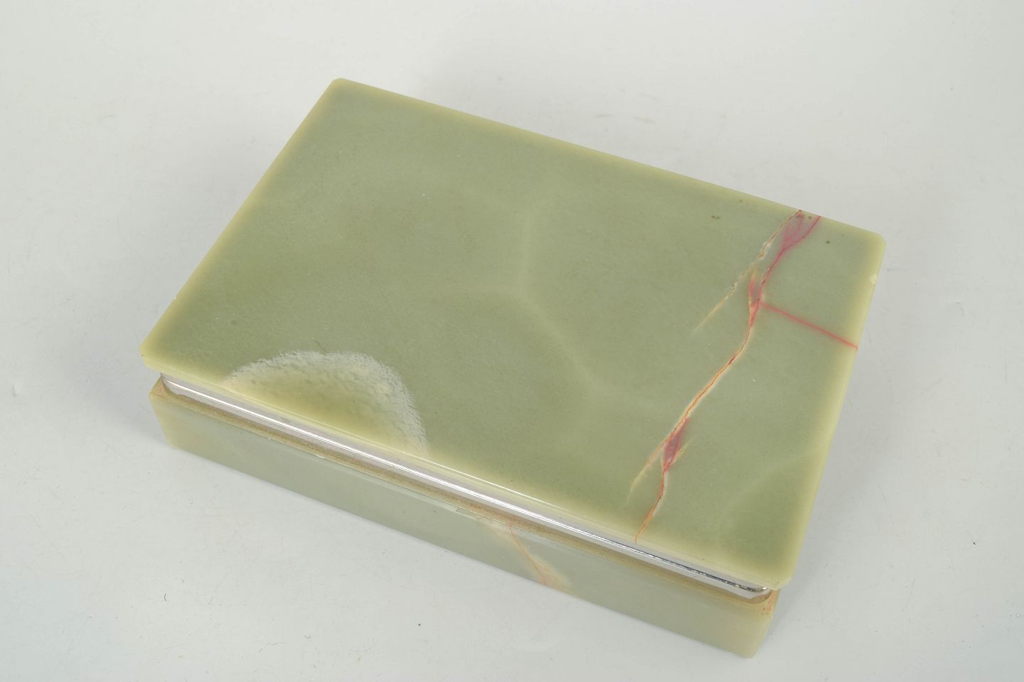 Italiensk onyx, æske fra 1940’erne.Rektangulær æske med låg udført i lys grøn alabast med fine naturlige åretegninger. Afsluttet med et diskret metalbånd, der understreger det elegante og stringente art deco formsprog.