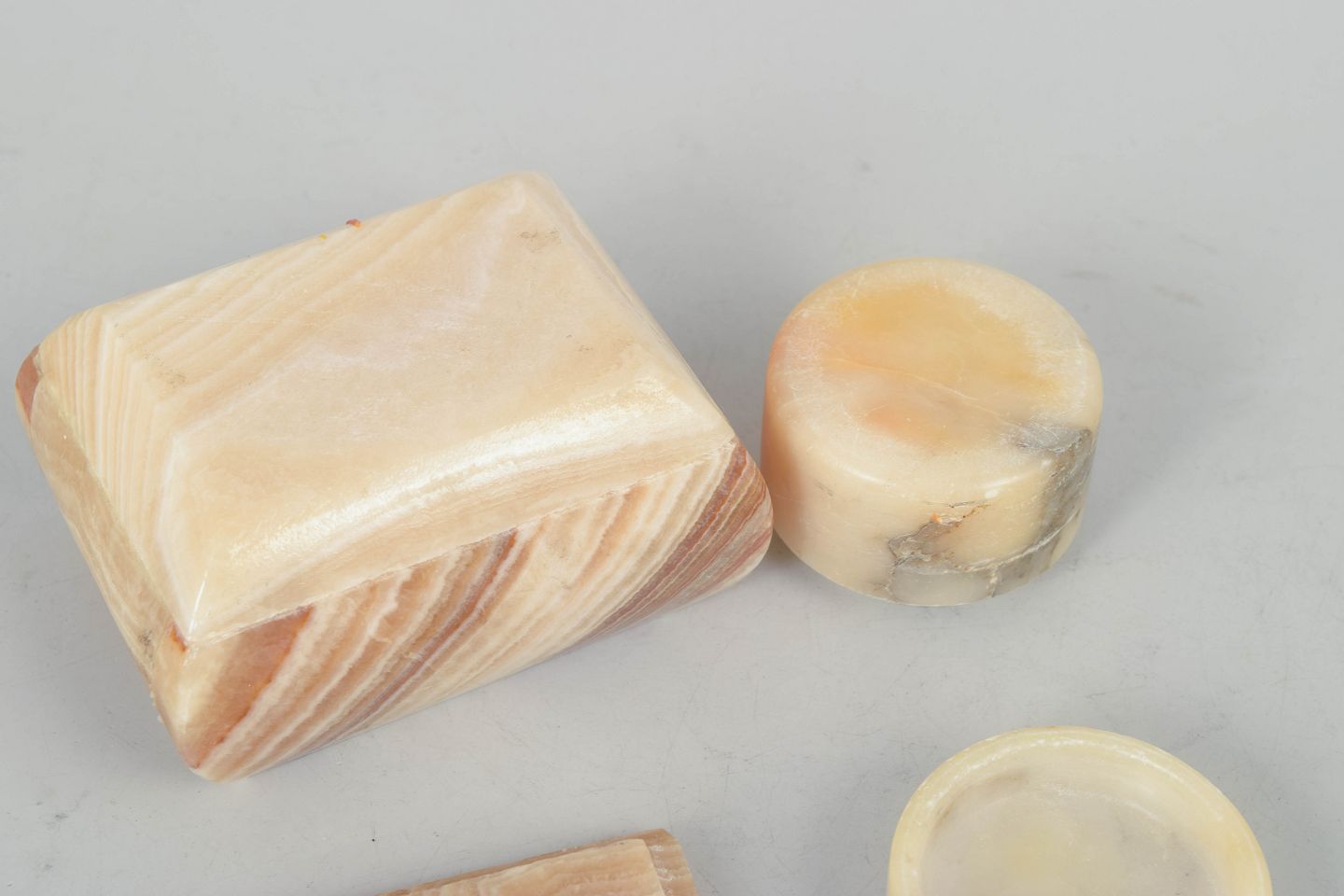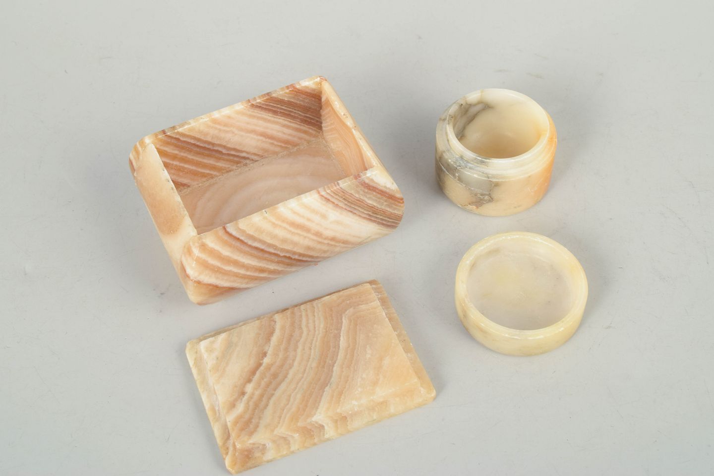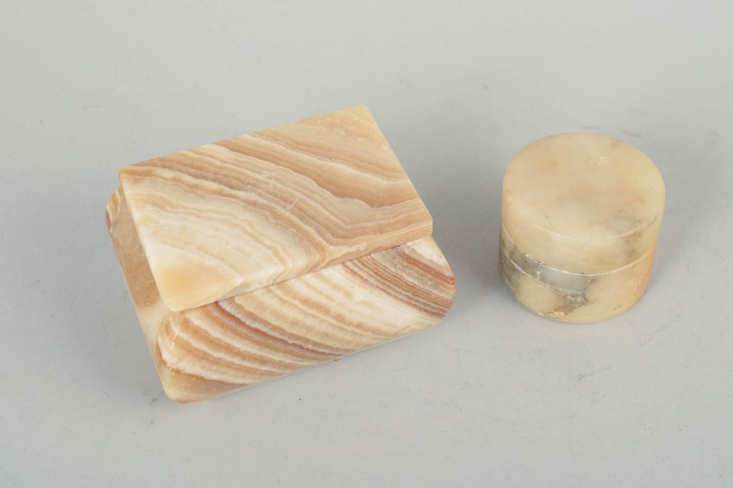 Italiensk alabast, æsker fra 1940’erne.To dekorative æsker udført i poleret alabast med naturlig åretegning i varme beige og honningfarvede nuancer. Består af én kvadratisk æske med låg og én rund æske, begge med karakteristisk art deco formsprog.