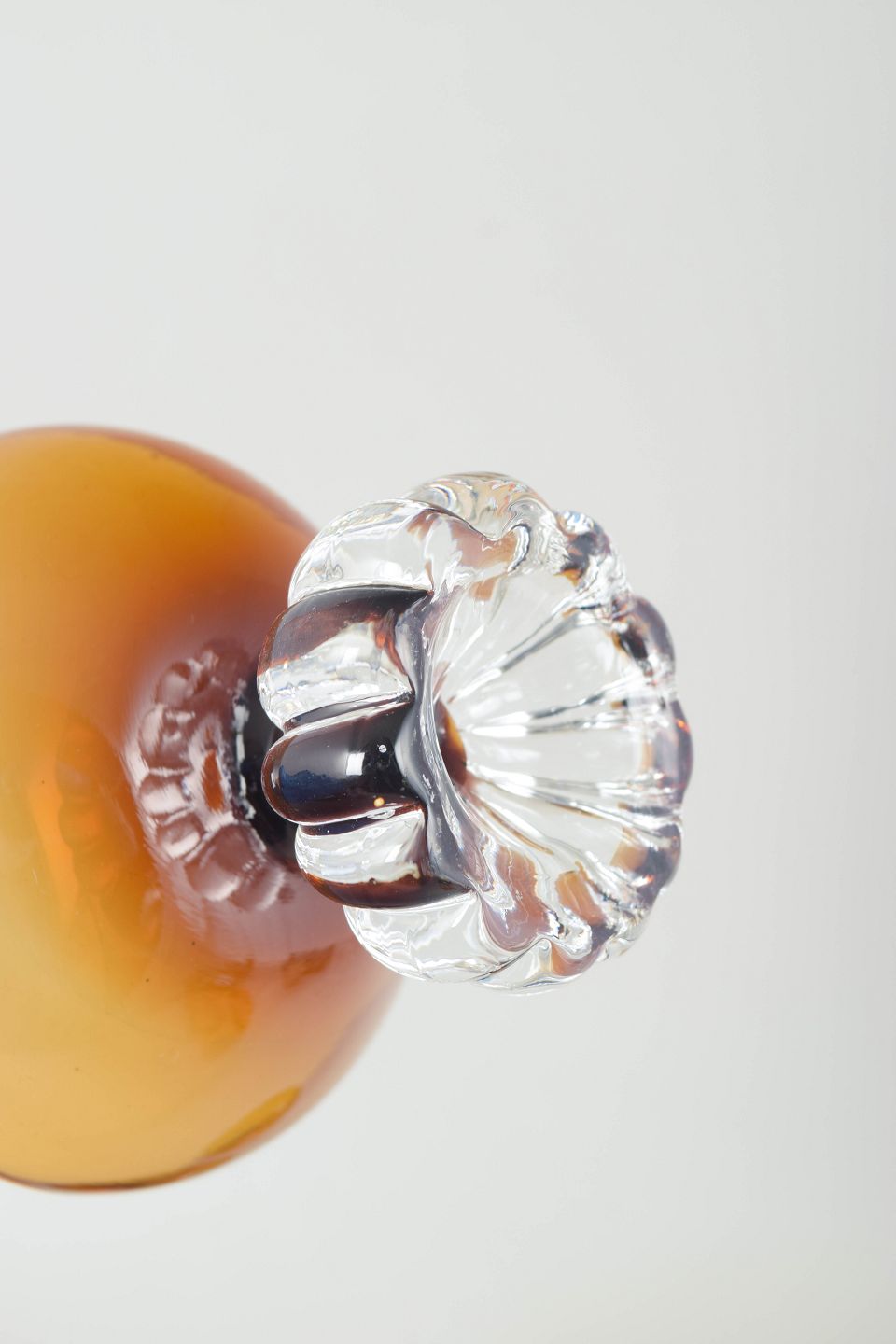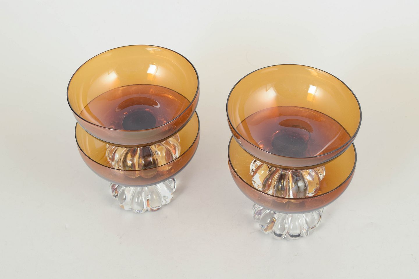 Bo Borgström for Åseda glasbruk, sæt af fire dessertskåle.Elegante dessertskåle i mundblæst glas med ravfarvet kumme og dekorativ fod i klart glas med rillet struktur, typisk for svensk glasdesign fra perioden.