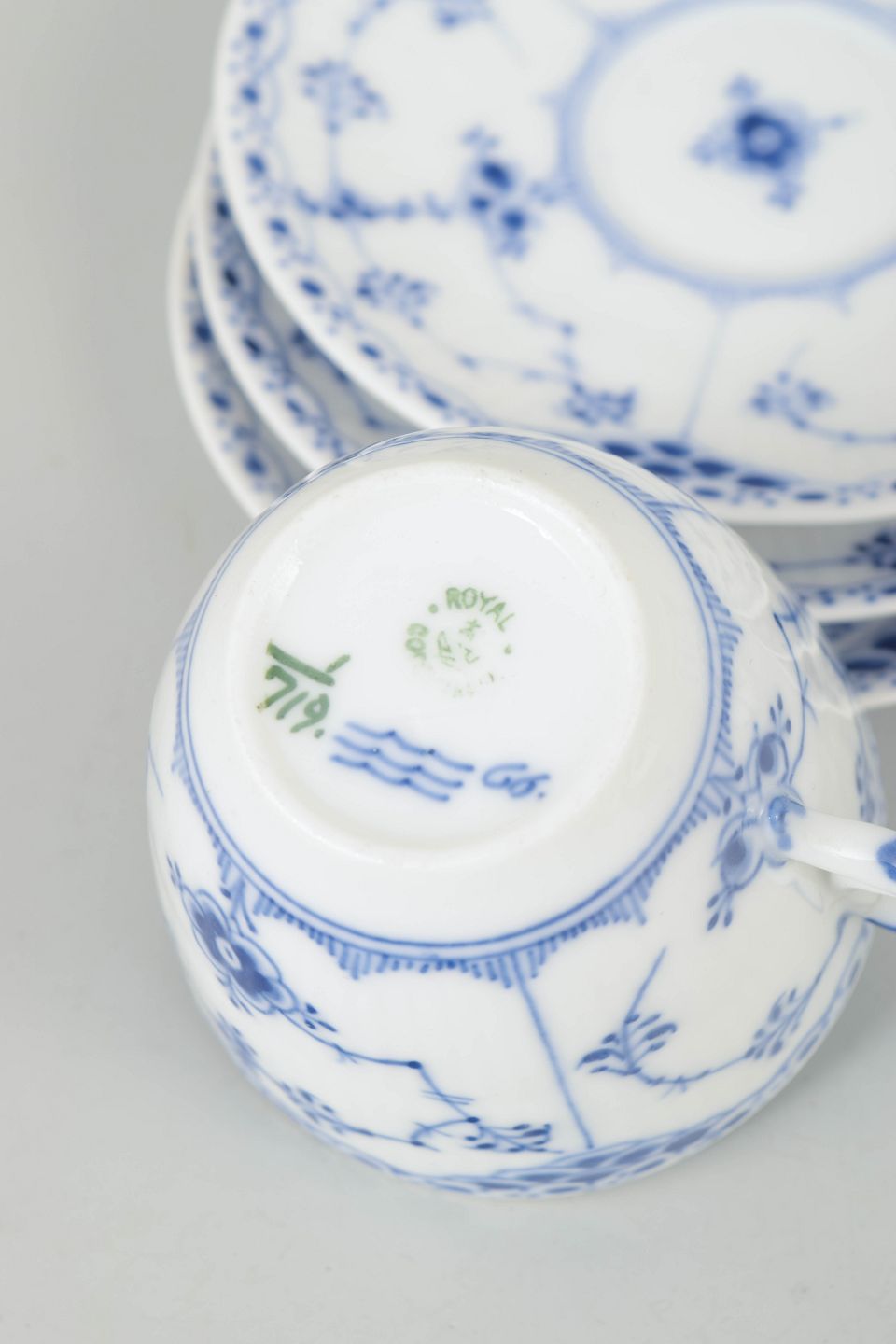 Håndmalet porcelæn i musselmalet halvblonde dekoration, model 1/719, første sortering. Kopper med tilhørende underkopper i klassisk riflet form.