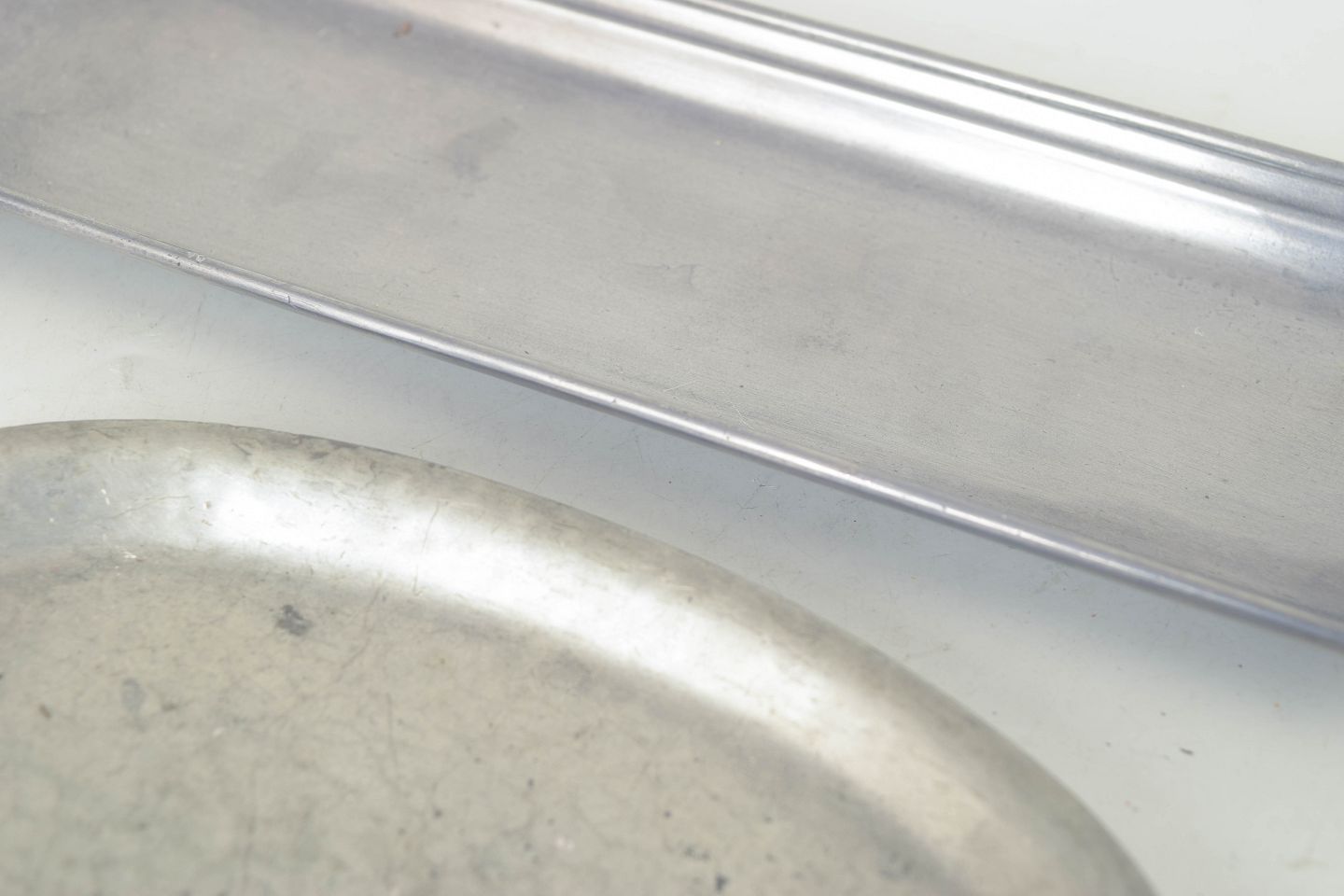 Just Andersen, to fade i tin.To elegante fade i tin, model 1826, udført i enkle og funktionelle former med let opadbøjede kanter. Klassisk dansk design fra mellemkrigstiden med en diskret patineret overflade.
