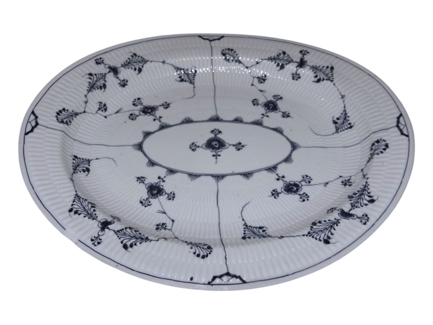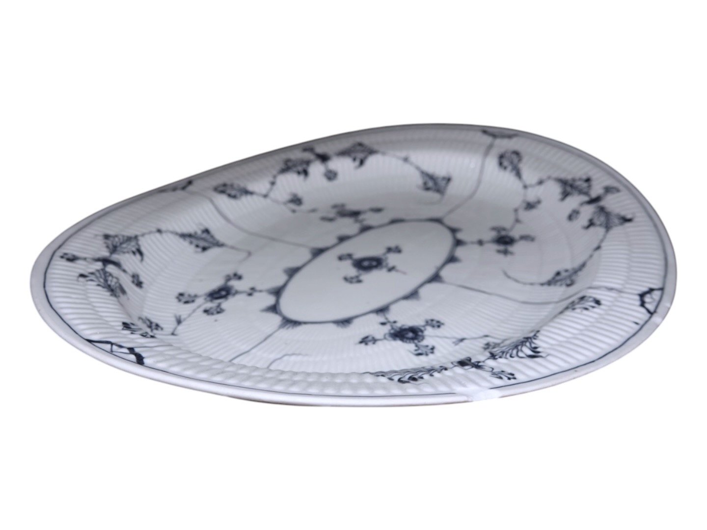 Royal Copenhagen Musselmalet Riflet, stegefad i gråt porcelæn.Fabriksmærket viser, at denne er produceret omkring 1790 til 1810.