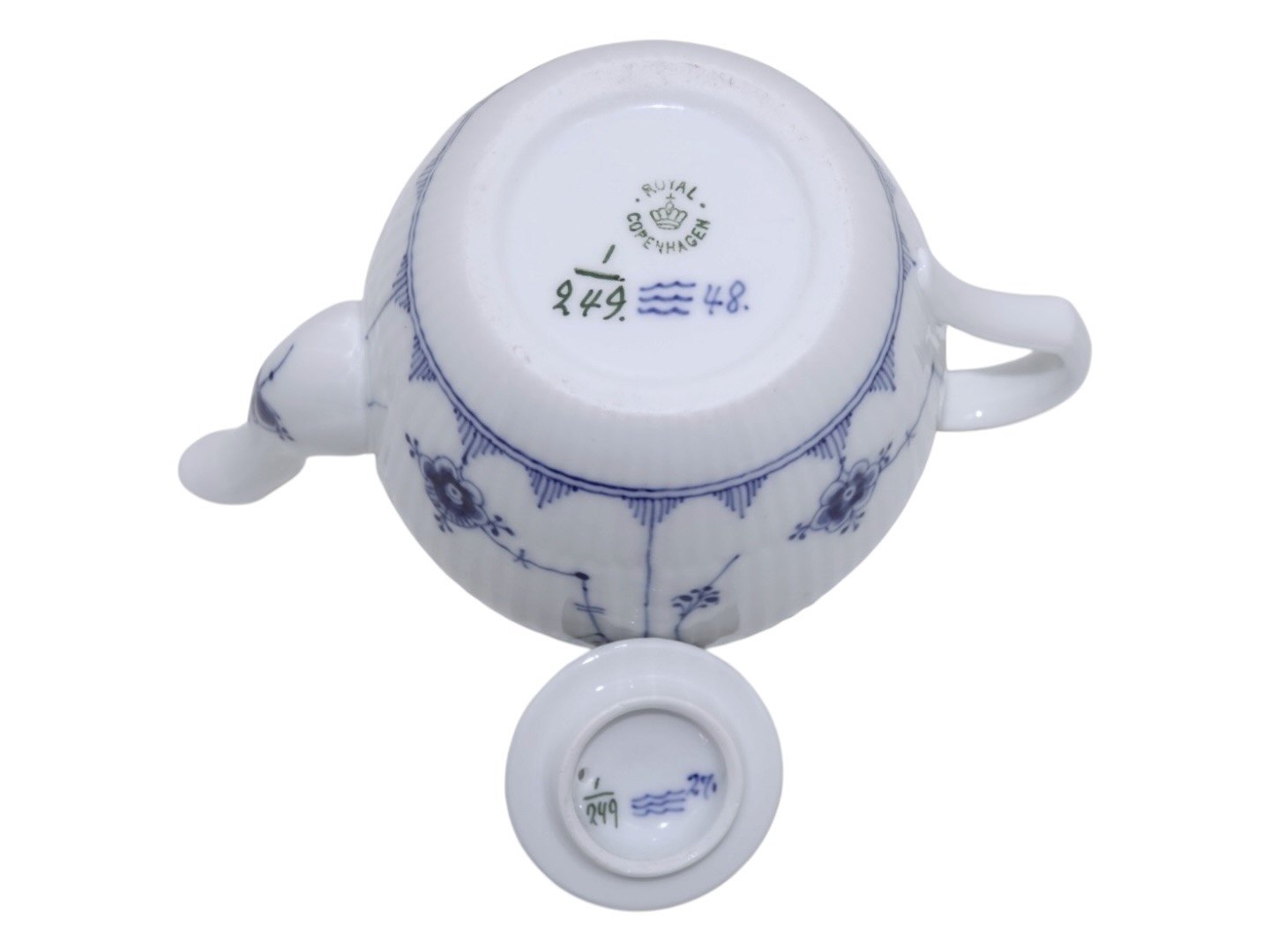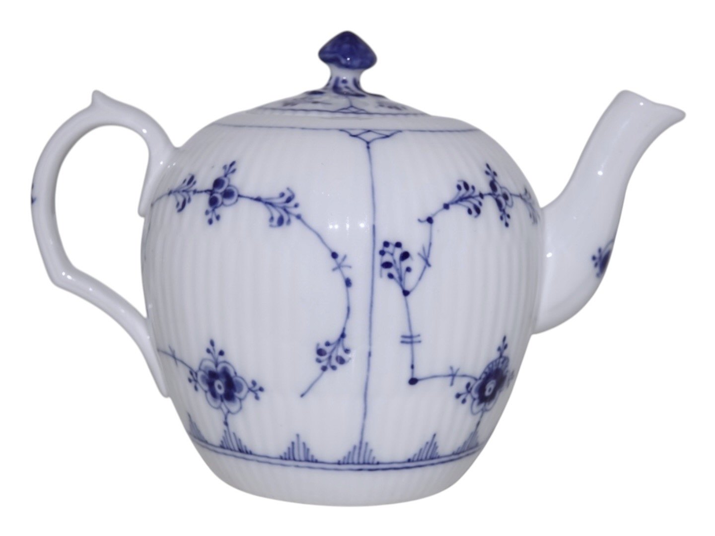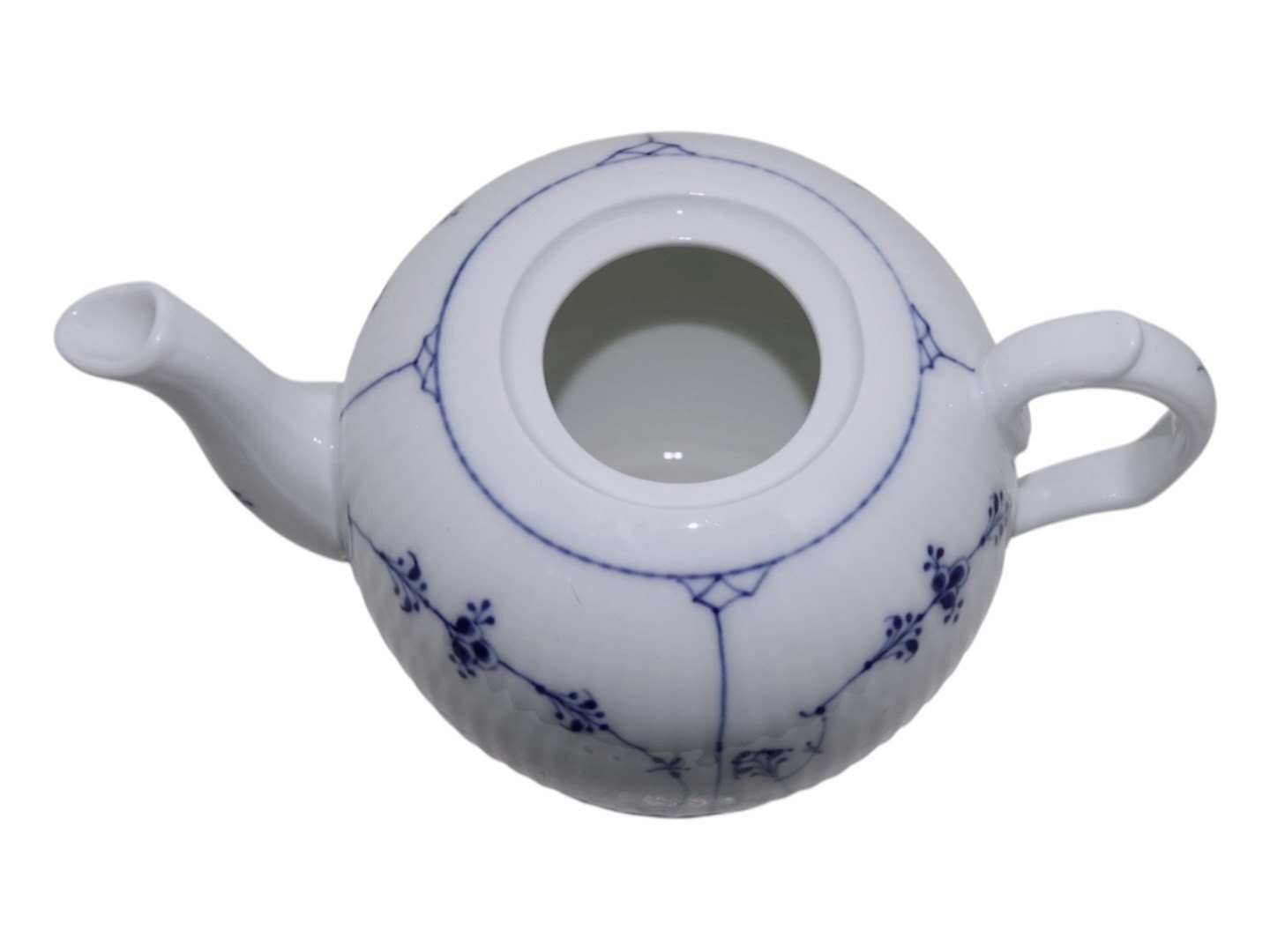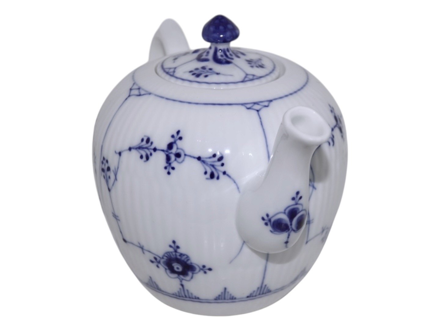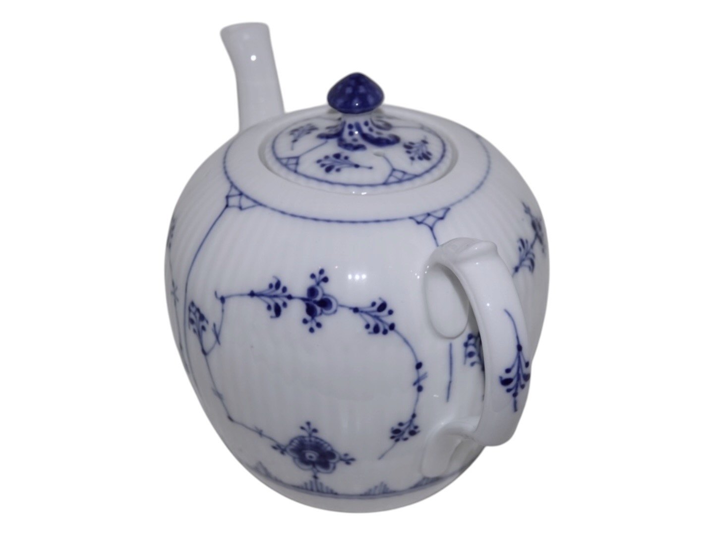 Royal Copenhagen Musselmalet Riflet, lille og sjælden tekande.Af fabriksmærket ses det, at denne er produceret mellem 1898 og 1923.