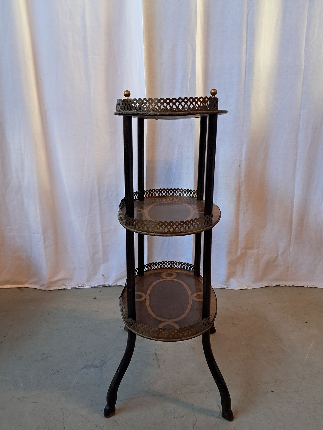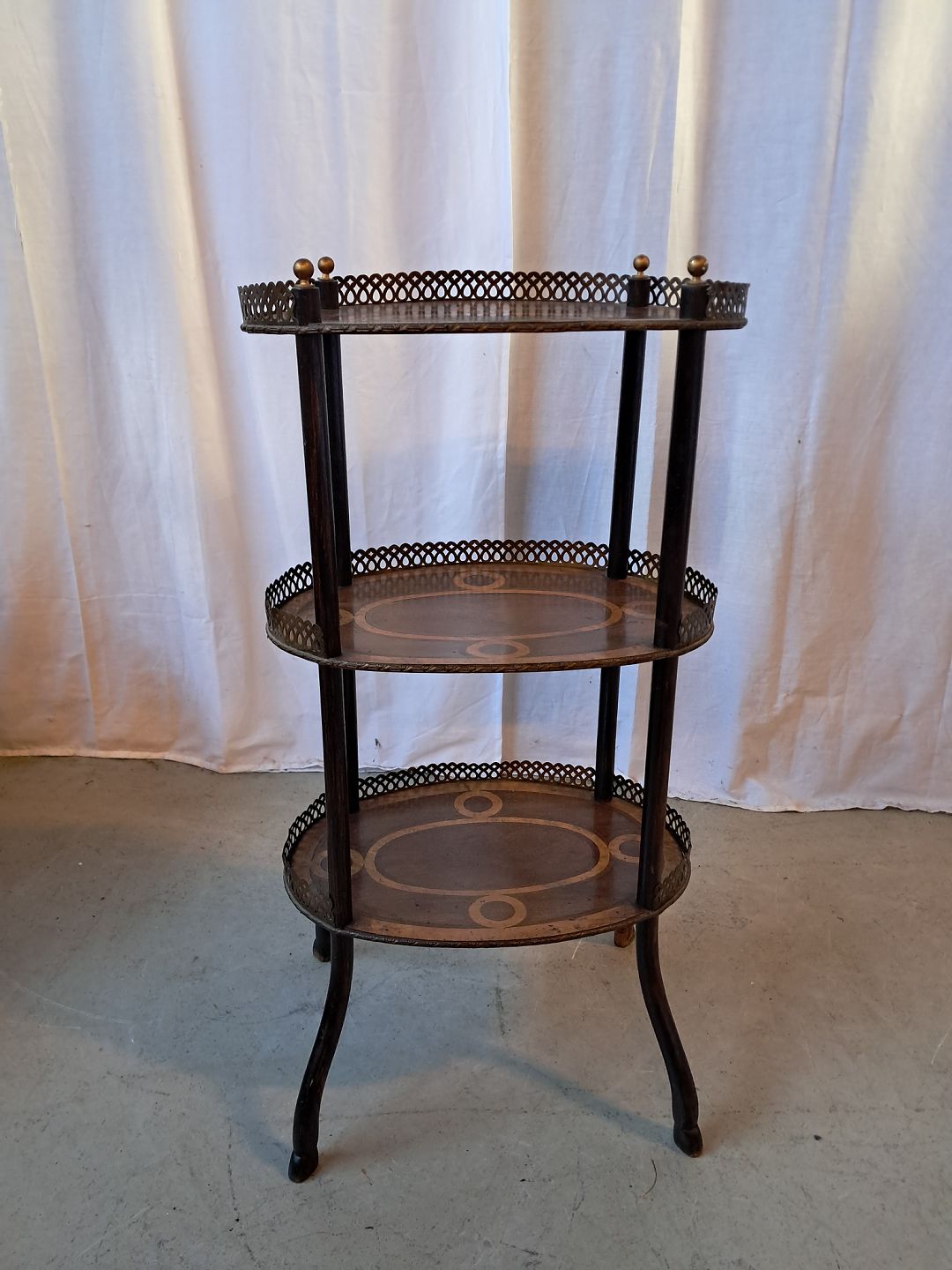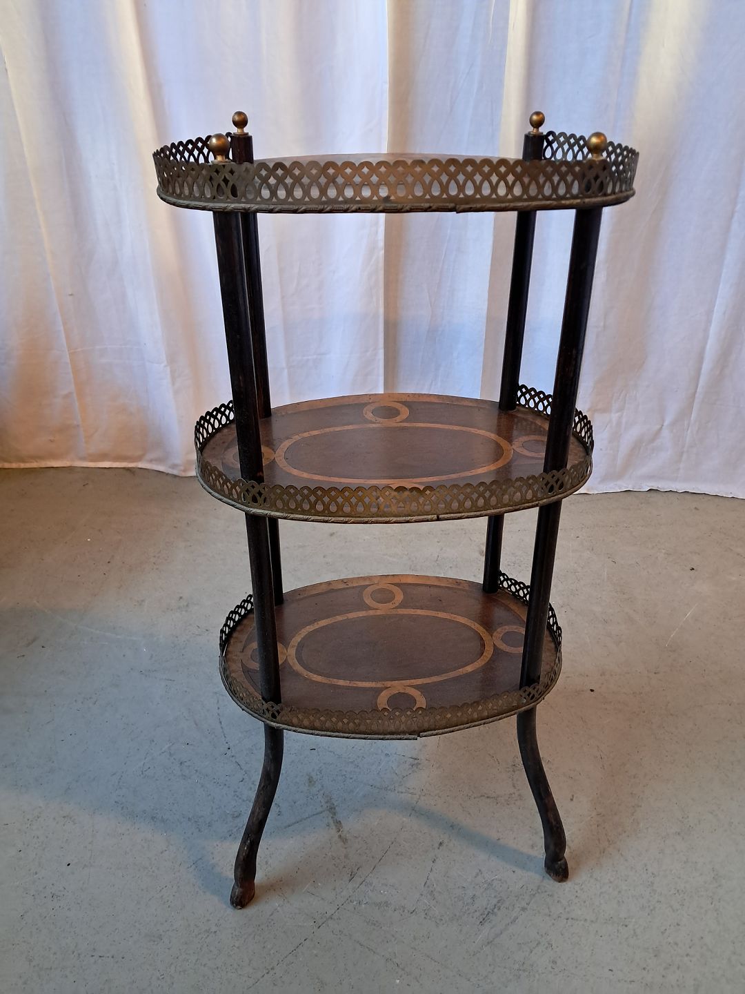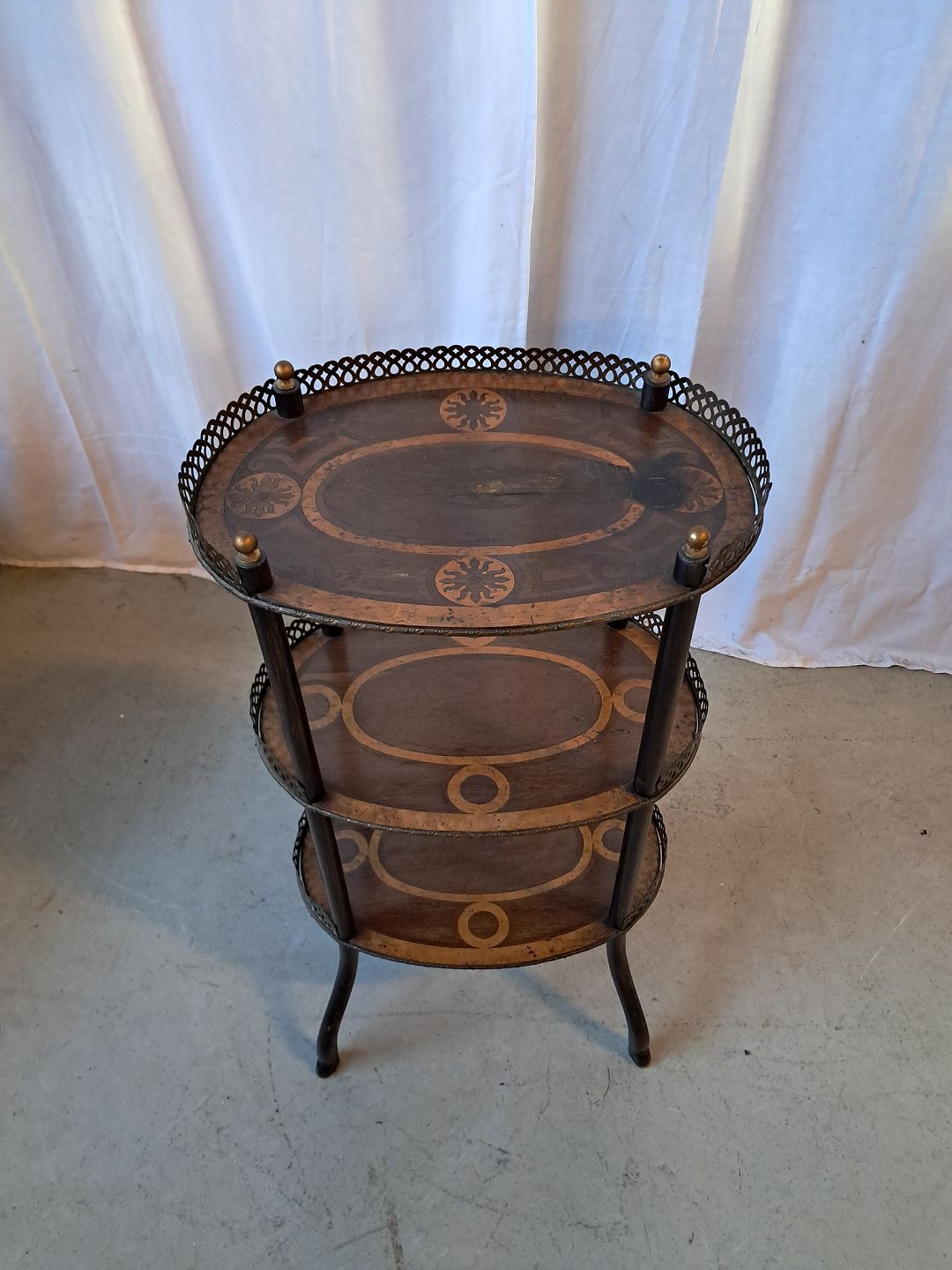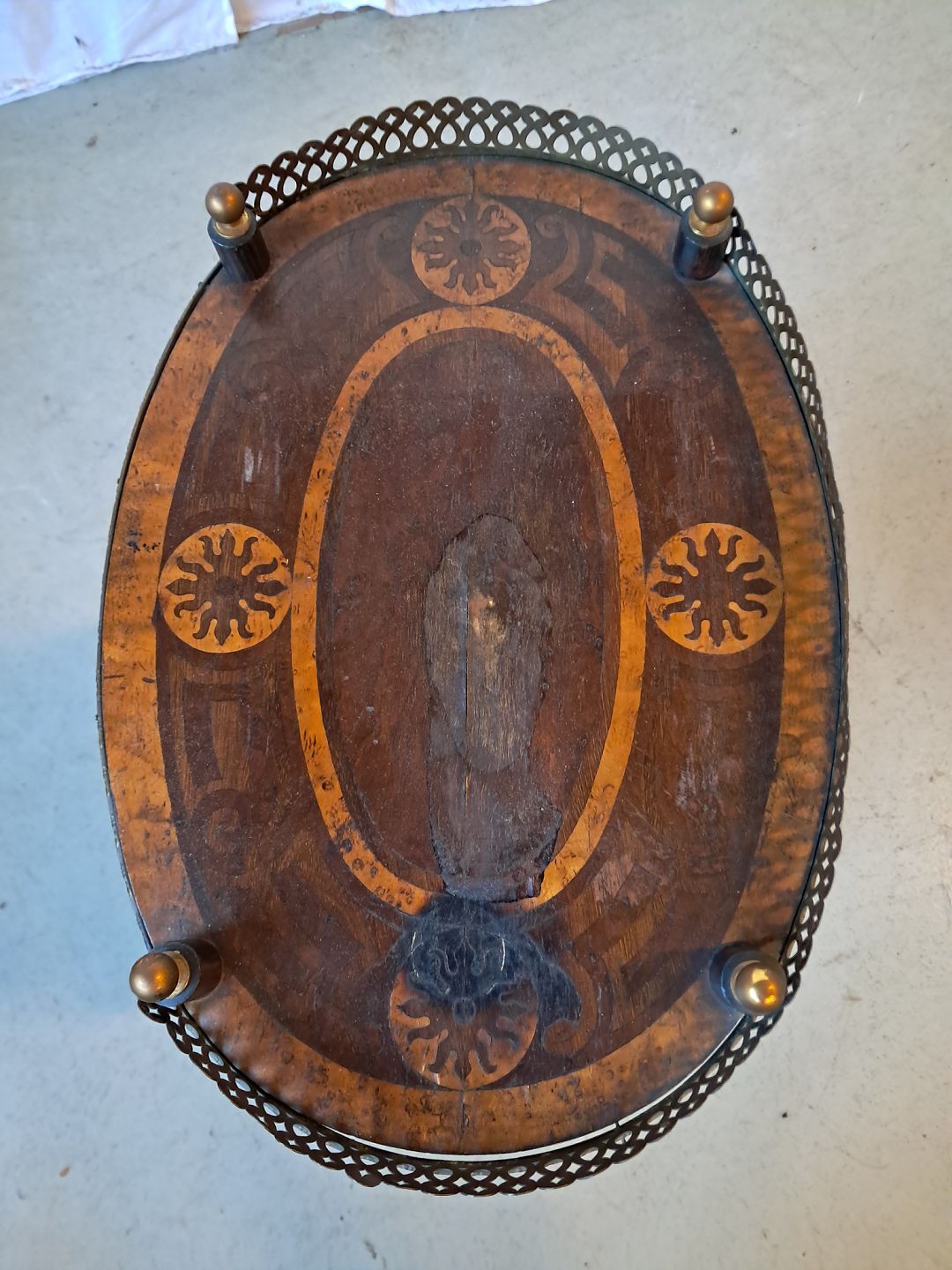 Sidebord i fineret mahogni og nødetræ med metalkant, fra 1980erne.Det har brugsspor.