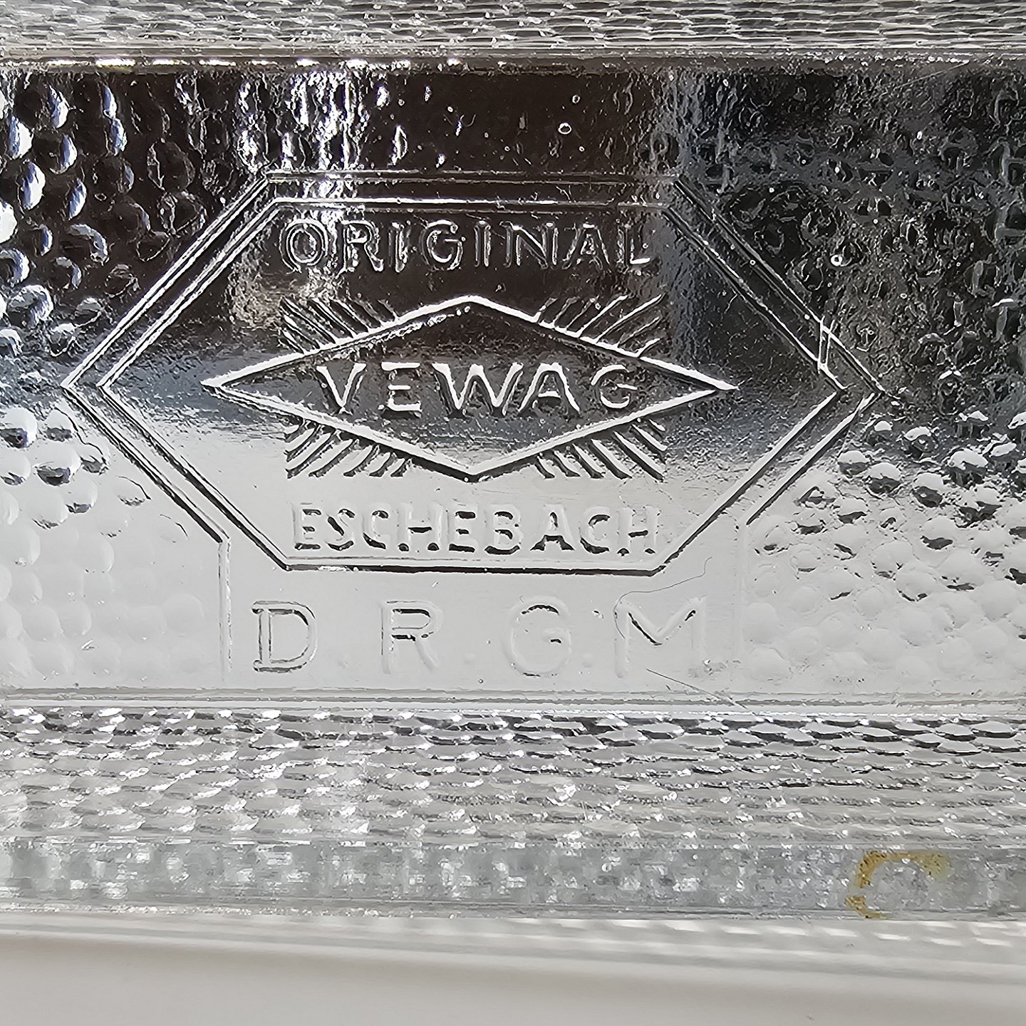 Fremstår med brugsspor på malingen på begge sider, små mærker på glas skufferne og et afslag på bagsiden af den ene skuffe