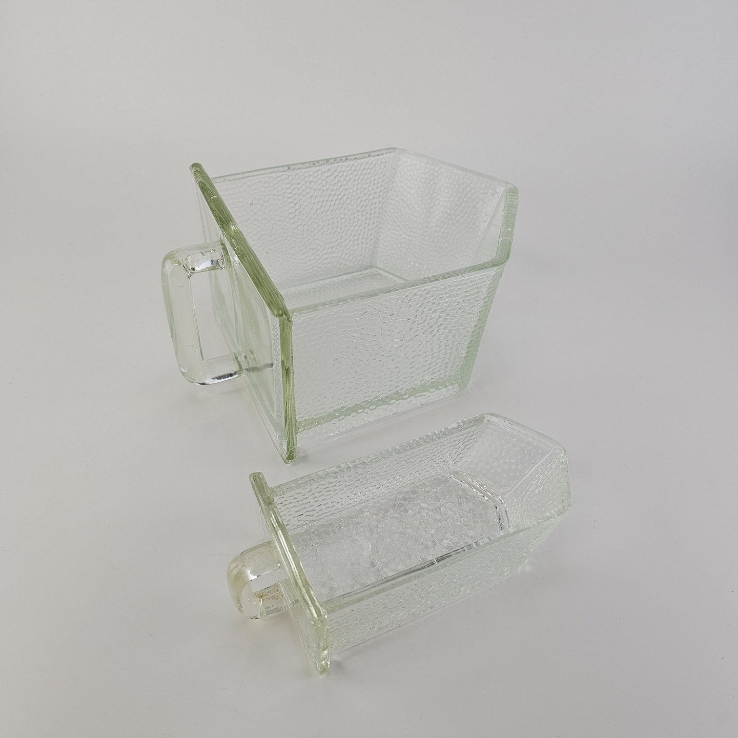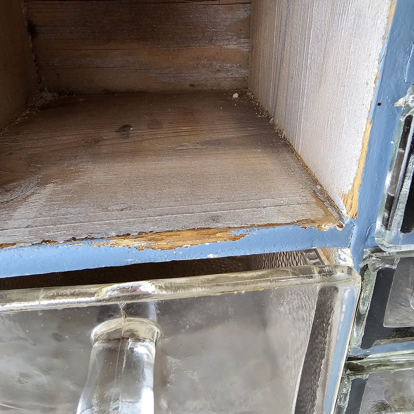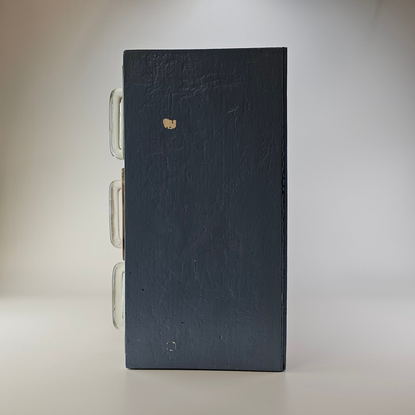 Flot patineret krydderihylde i blåmalet træ med skuffer af glas og to træskeer. Har 6 store skuffer og 6 små skufferProducent af nogle af glasskufferne VEWAG Eschebach. Formentlig dansk produceret.