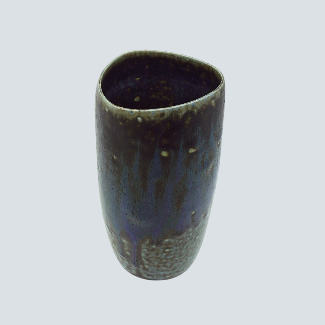 Arne Bang; Vase af stentøj, trekantet. Med sort og blå glasur. Nr. 3. I god stand.