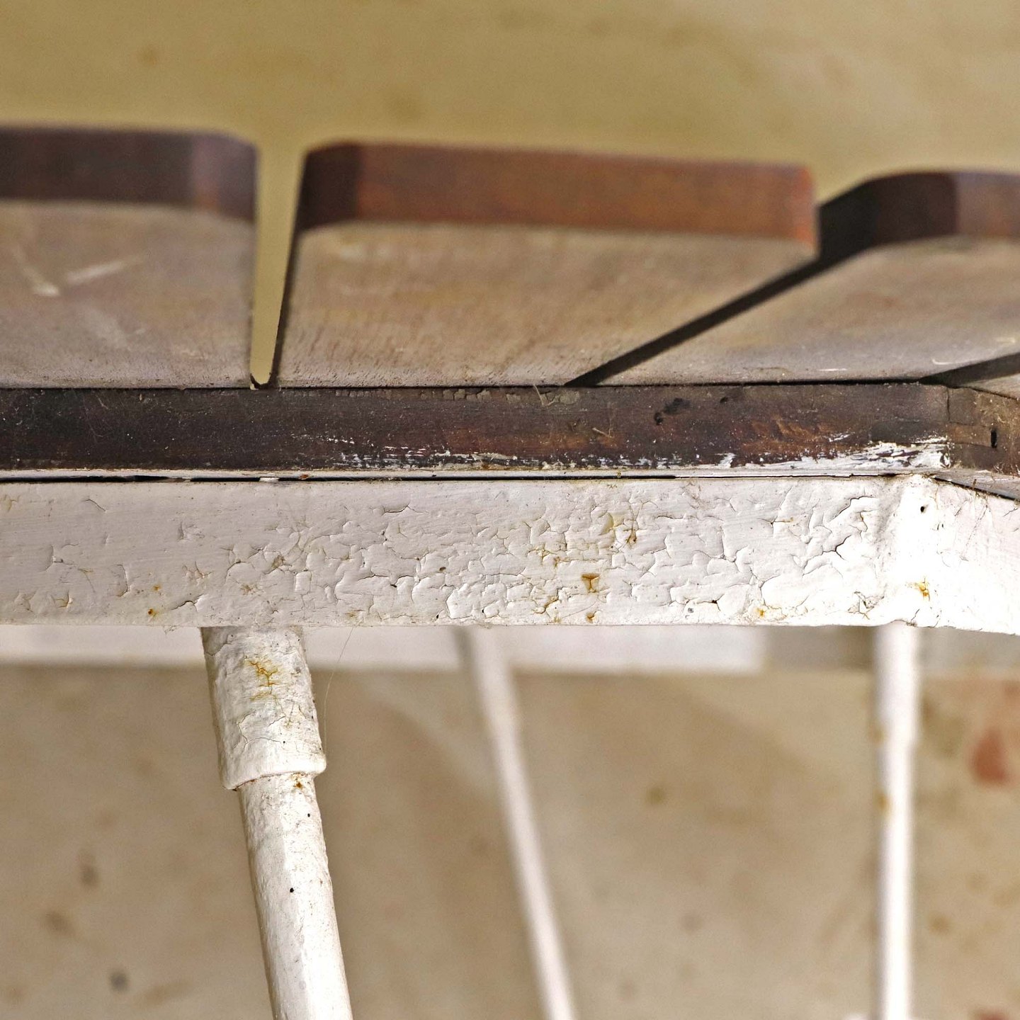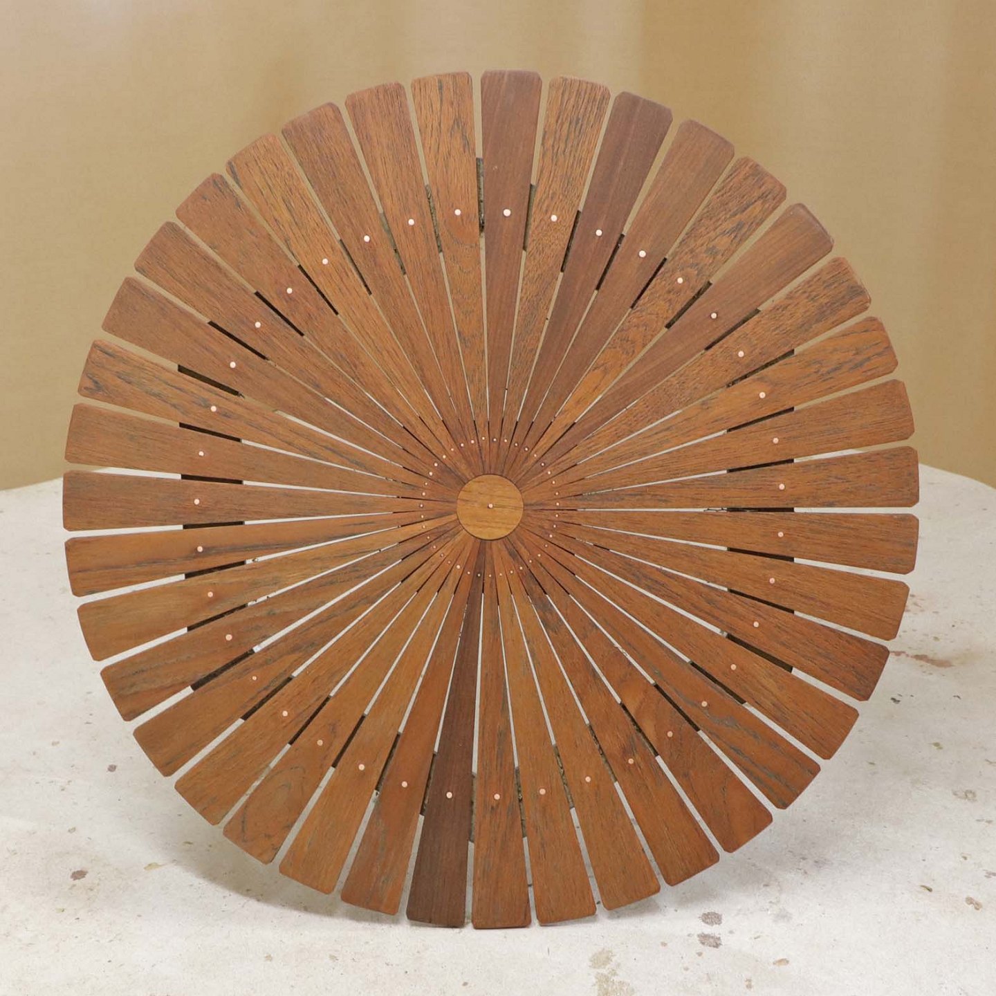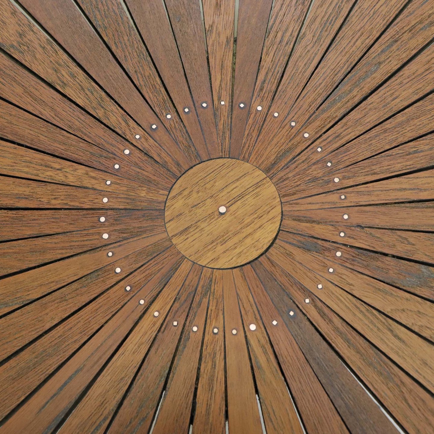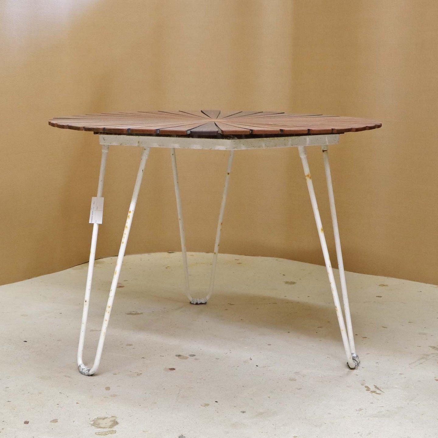 Rundt havebord fra år 1950-60 med nyrenoverede lameller i teaktræ med messingpynt på stel af hvidlakeret stålrør. Benene er ikke renoveret.Model Marguerit