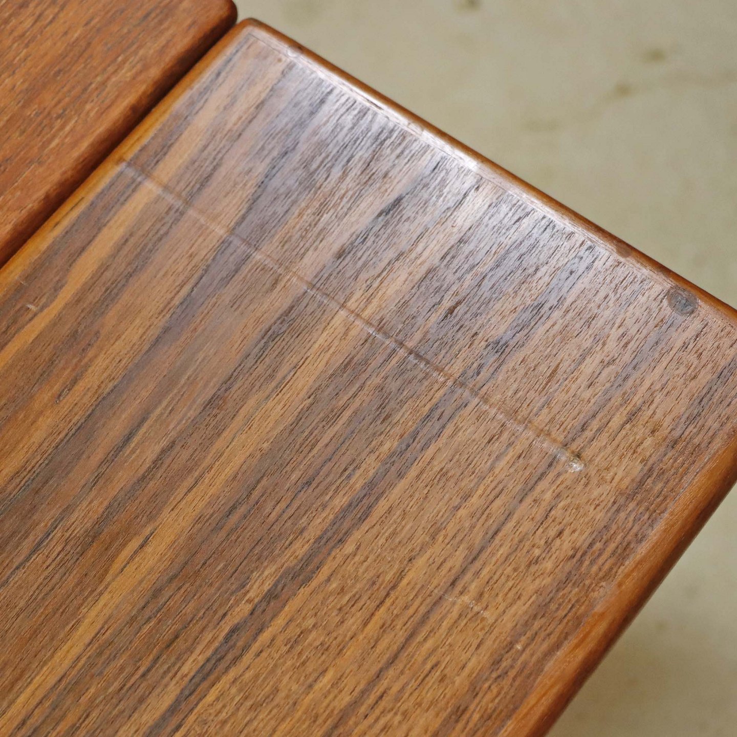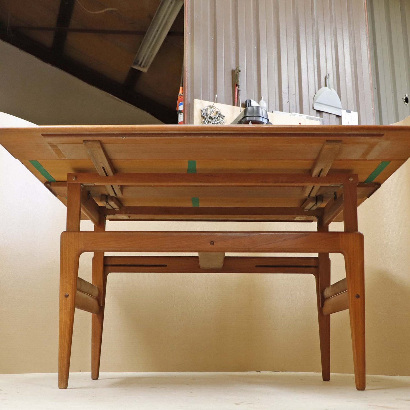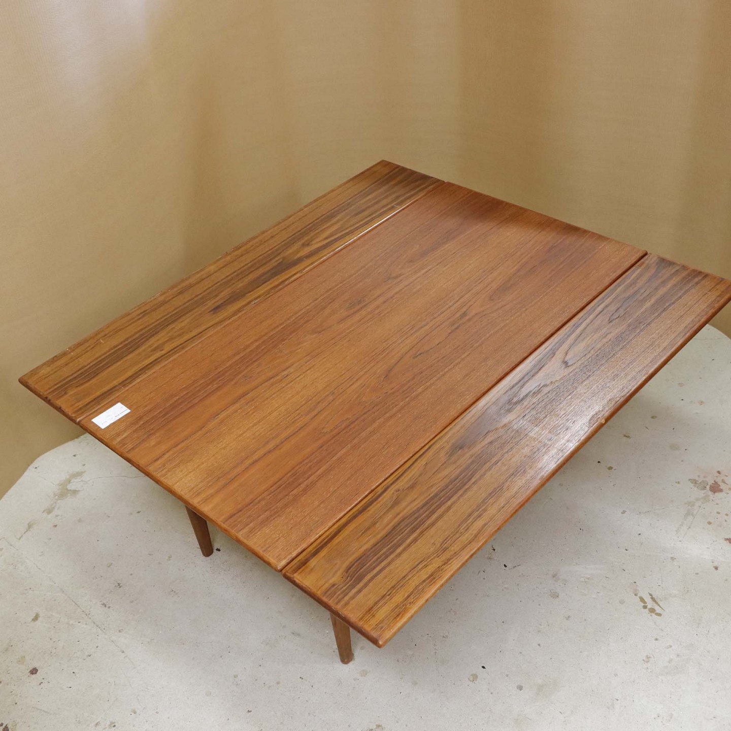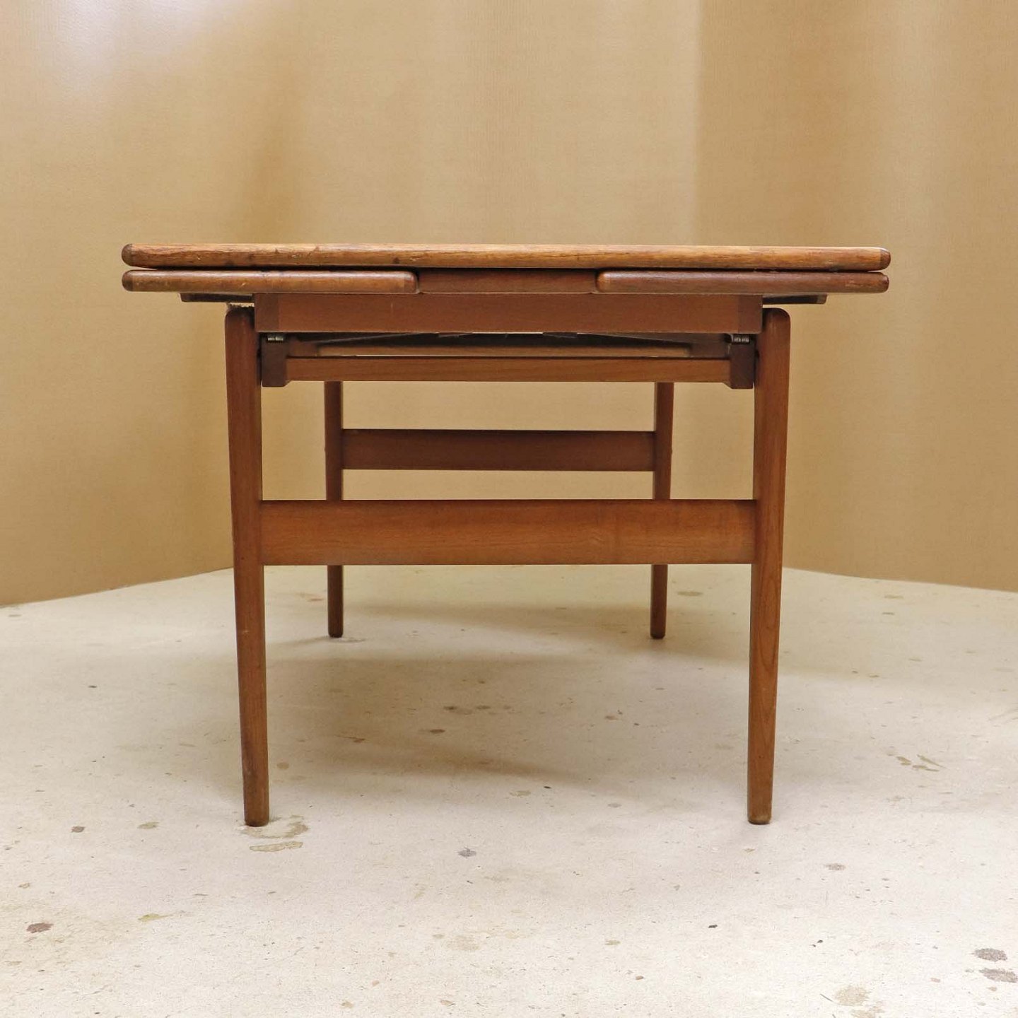 Sofa- og spisebord i samme møbel. Bordet er fremstillet i teaktræ og har to underliggende udtræksplader, som befinder sig på hver af bordets lang-sider.Dansk producent