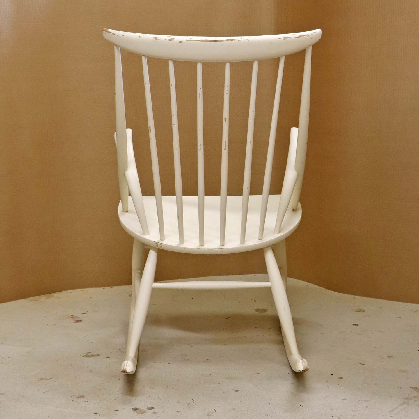 Tremme gyngestol formgivet år 1958 i hvidlakeret træ. Model IW3Design Illum Wikkelsø (1919-1999)