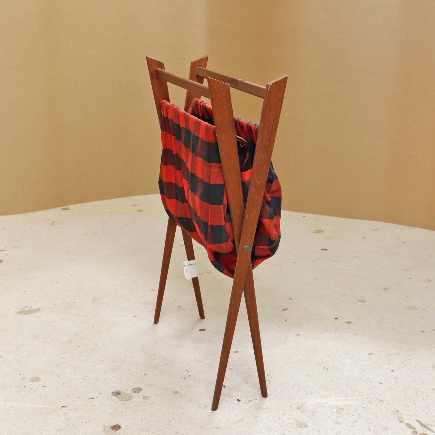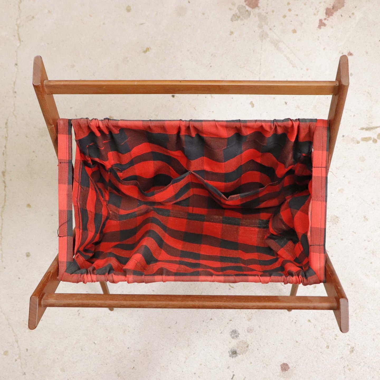 Magasinholder med stel i teaktræ med påmonteret bomuldsstof med mønster af røde og sorte tern. Holderen har to indvendige lommer langs den ene side. Kan også bruges til garn. Holderen kan klappes sammen.Producent ukendt