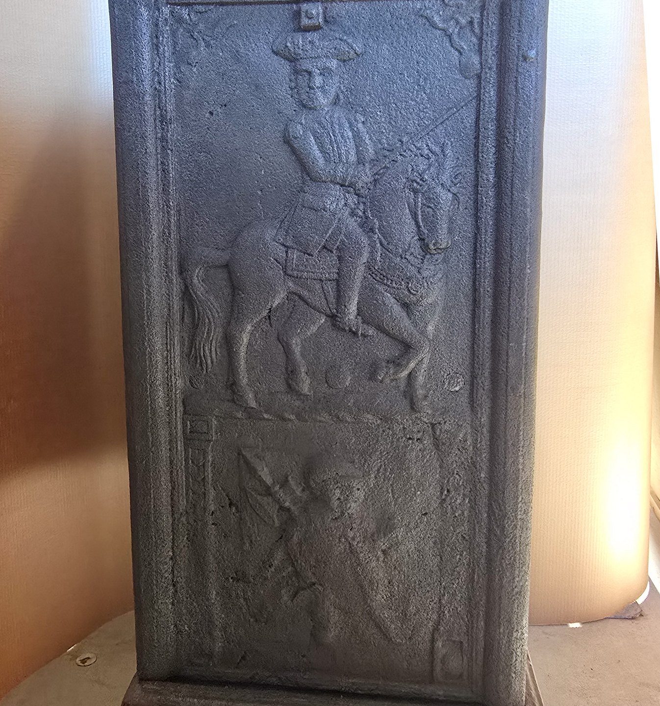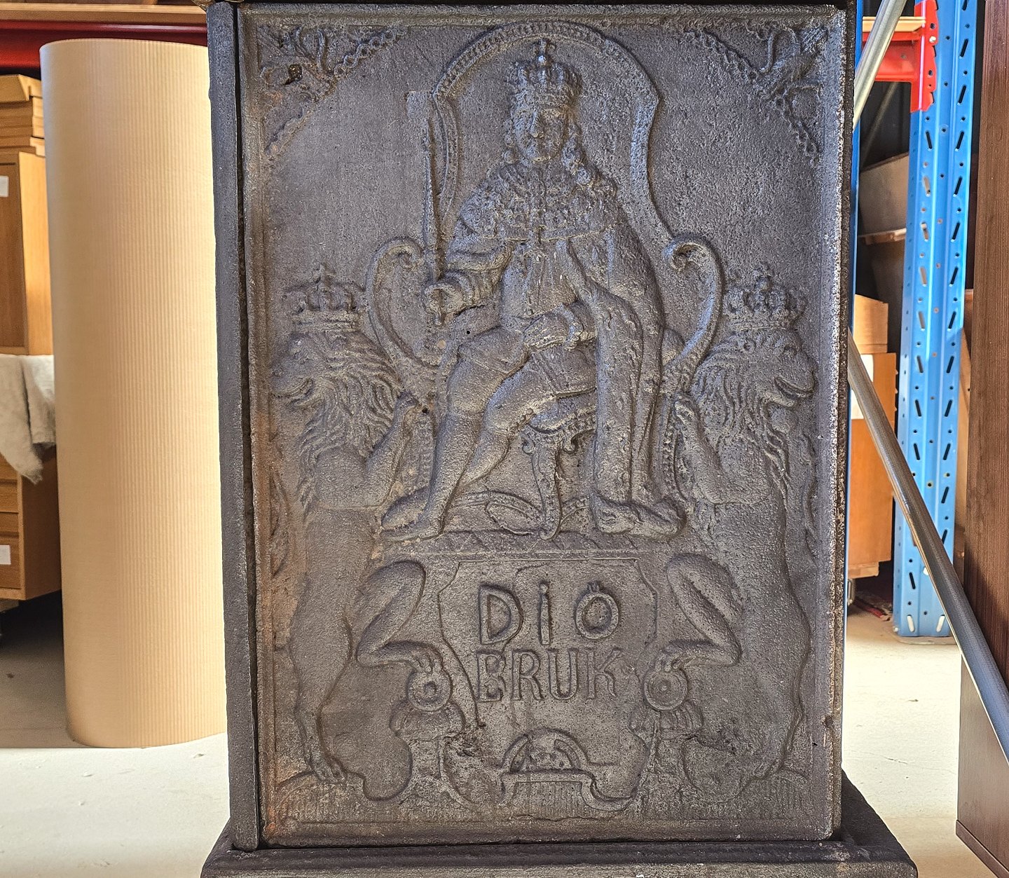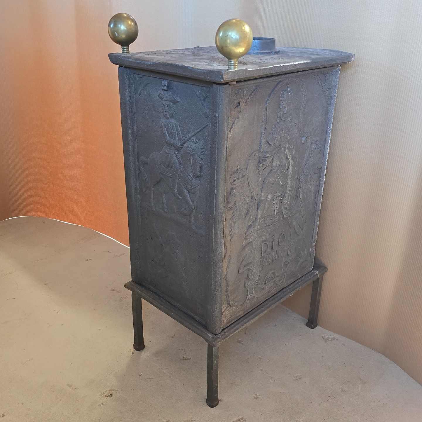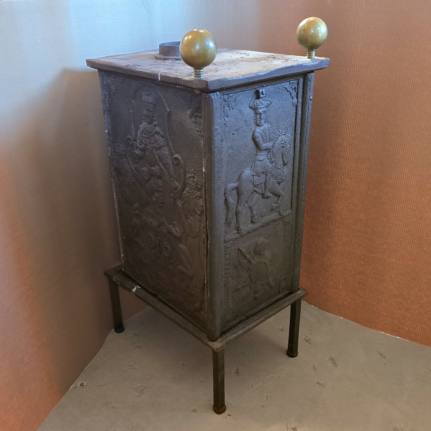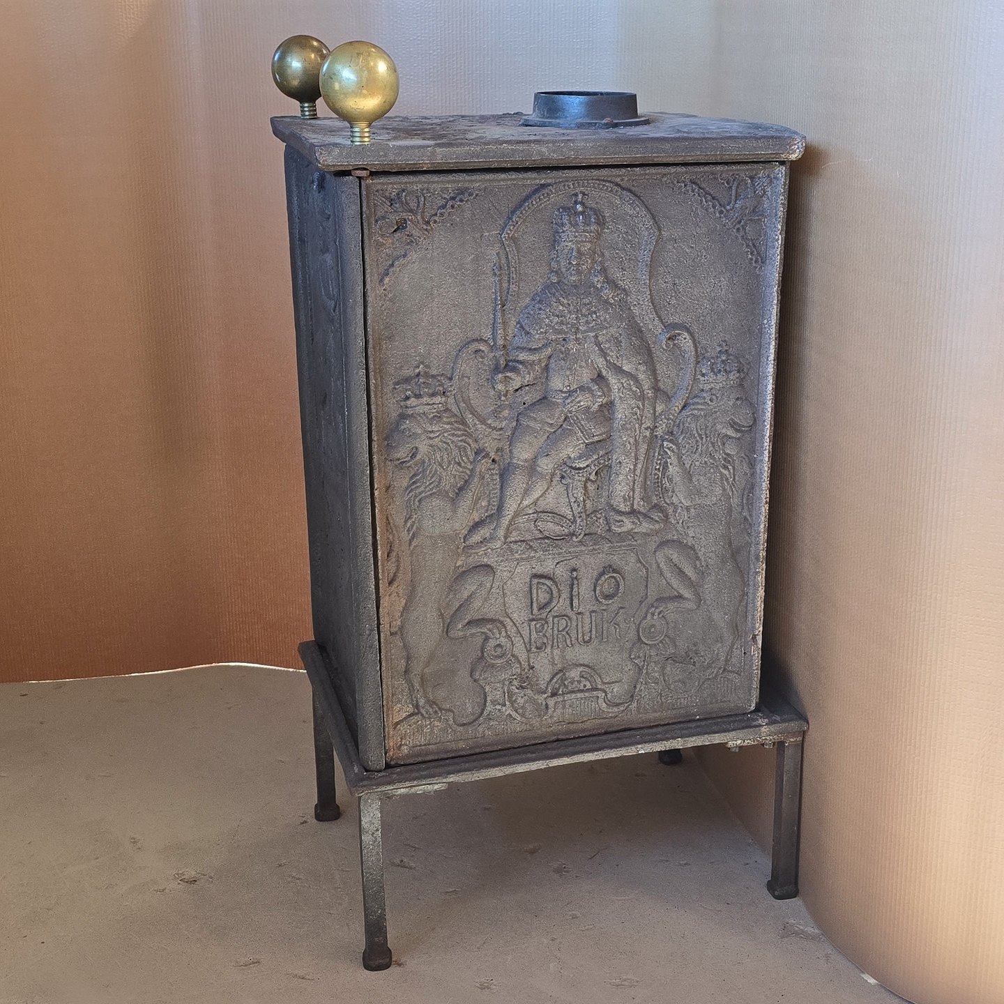 Antik svensk bilæggerovn i støbejern fremstillet i perioden år 1750-1800. Ovnen er dekoreret med motiv af den svenske konge siddende på tronen omgivet af to løver samt den svenske konge til hest. Ovnen har monteret to kugler i messing på toppladen.Producent Diö Bruk jernstøberi, Småland