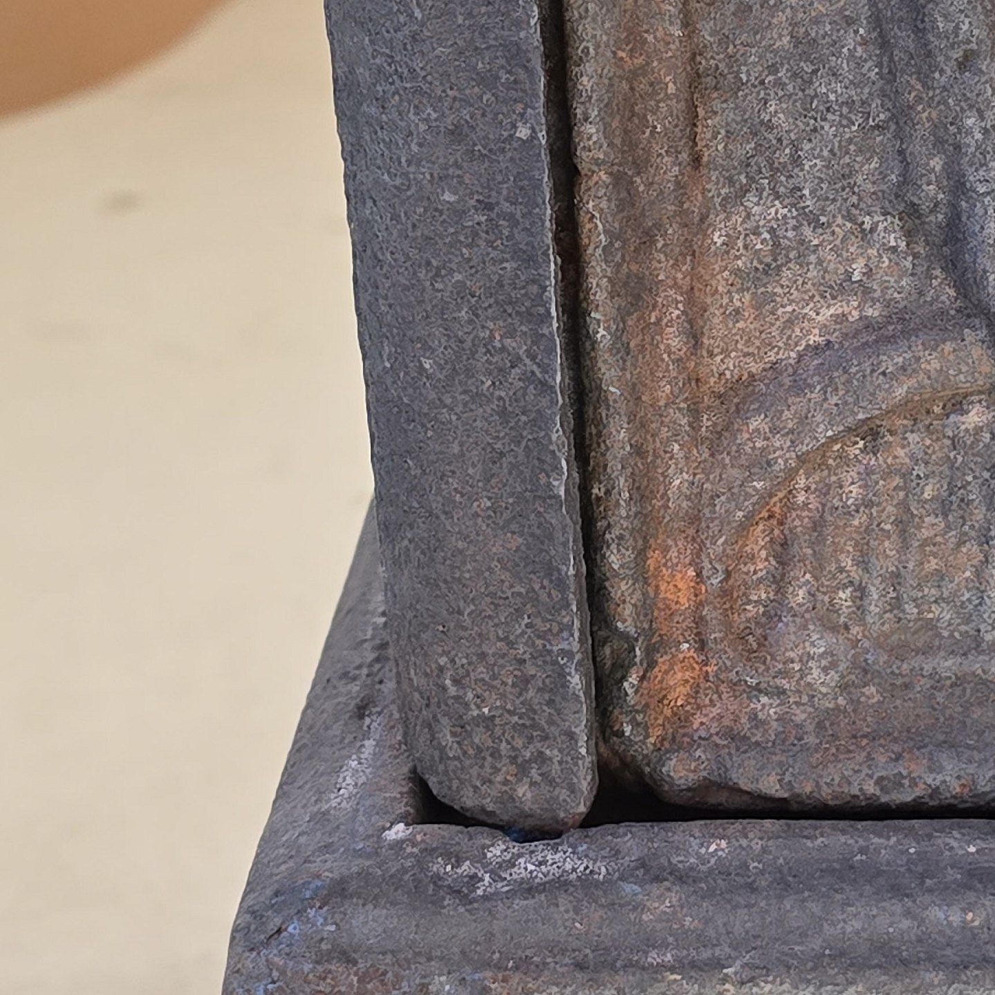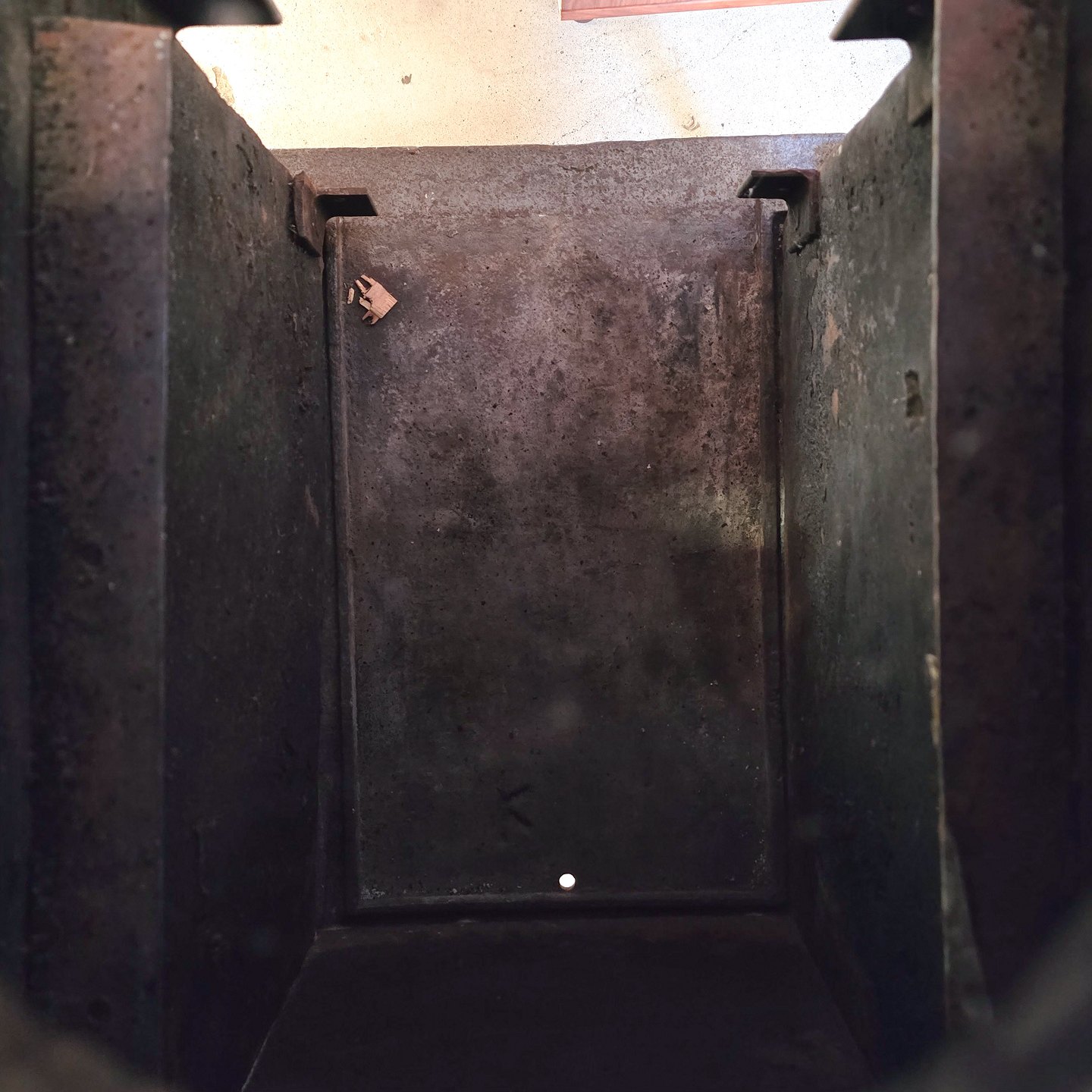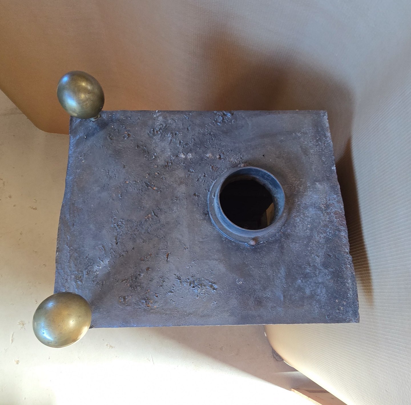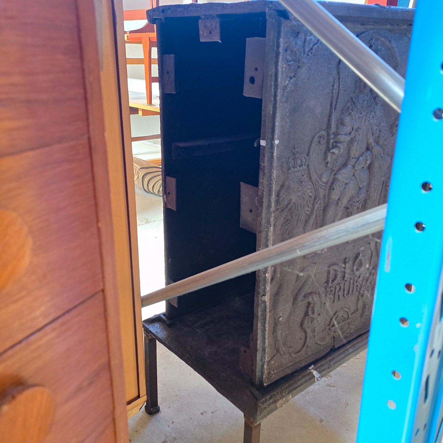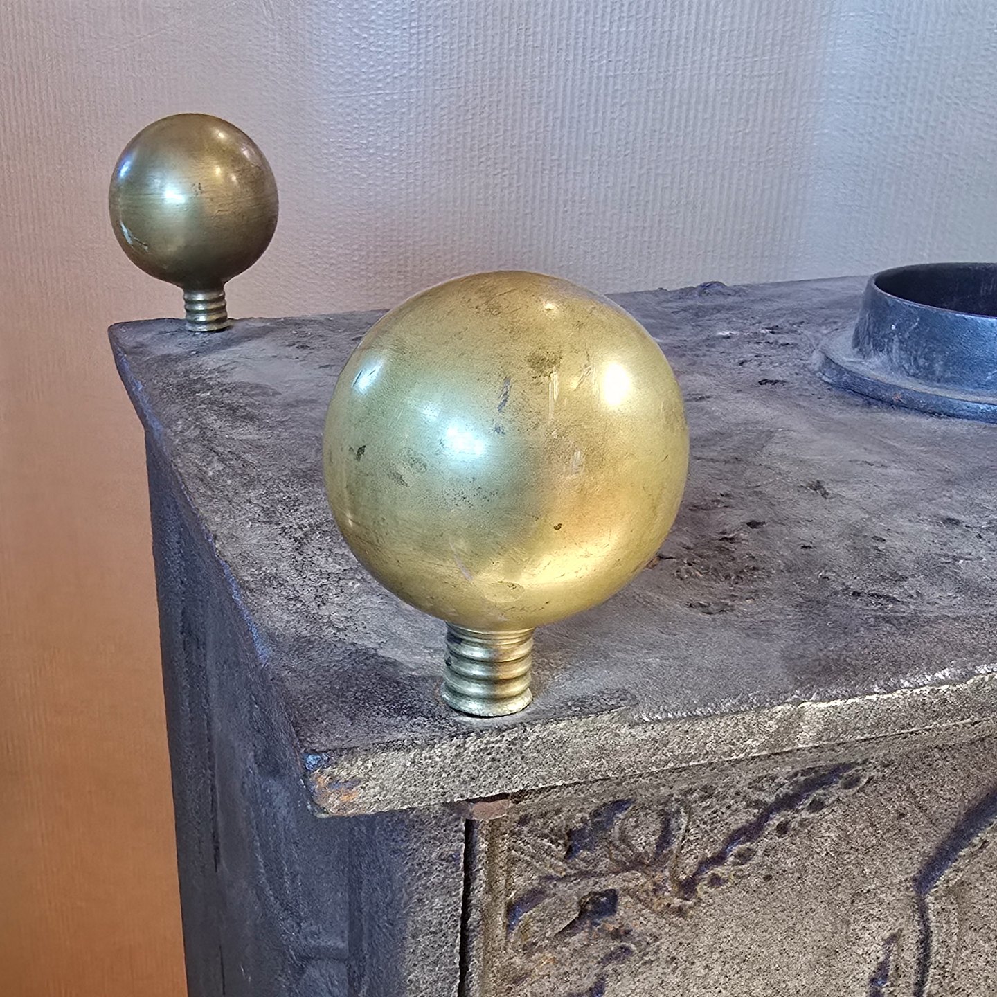 Antik svensk bilæggerovn i støbejern fremstillet i perioden år 1750-1800. Ovnen er dekoreret med motiv af den svenske konge siddende på tronen omgivet af to løver samt den svenske konge til hest. Ovnen har monteret to kugler i messing på toppladen.Producent Diö Bruk jernstøberi, Småland