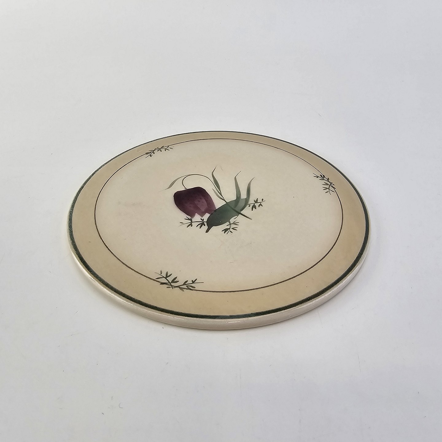 Fajancestel i stelform Viktoria II (Fletværk) med flettet kant og dekoration af en vibeæg blomst i violet og grøn, fremstillet i perioden 1934-1967
