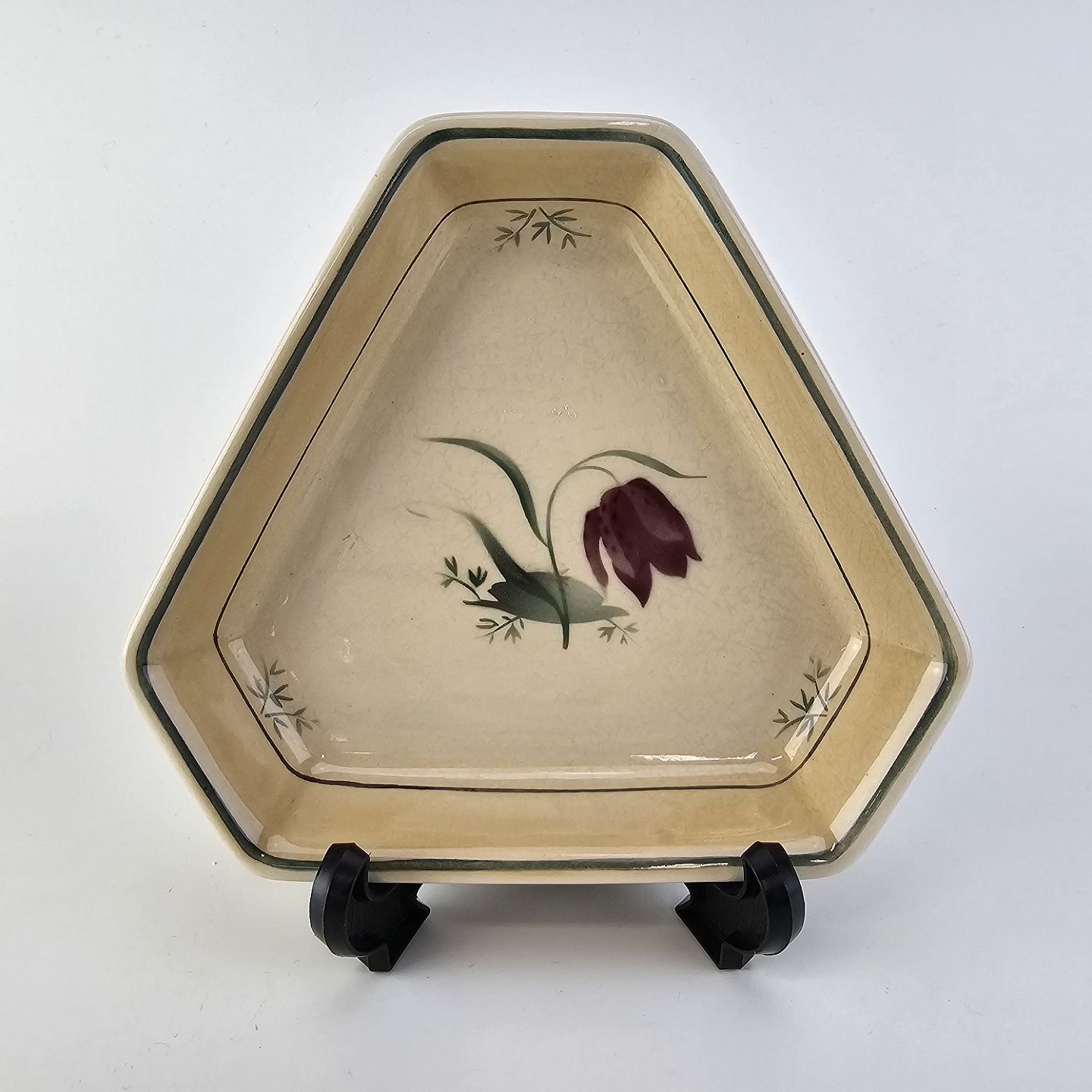 Fajancestel i stelform Viktoria II (Fletværk) med flettet kant og dekoration af en vibeæg blomst i violet og grøn, fremstillet i perioden 1934-1967