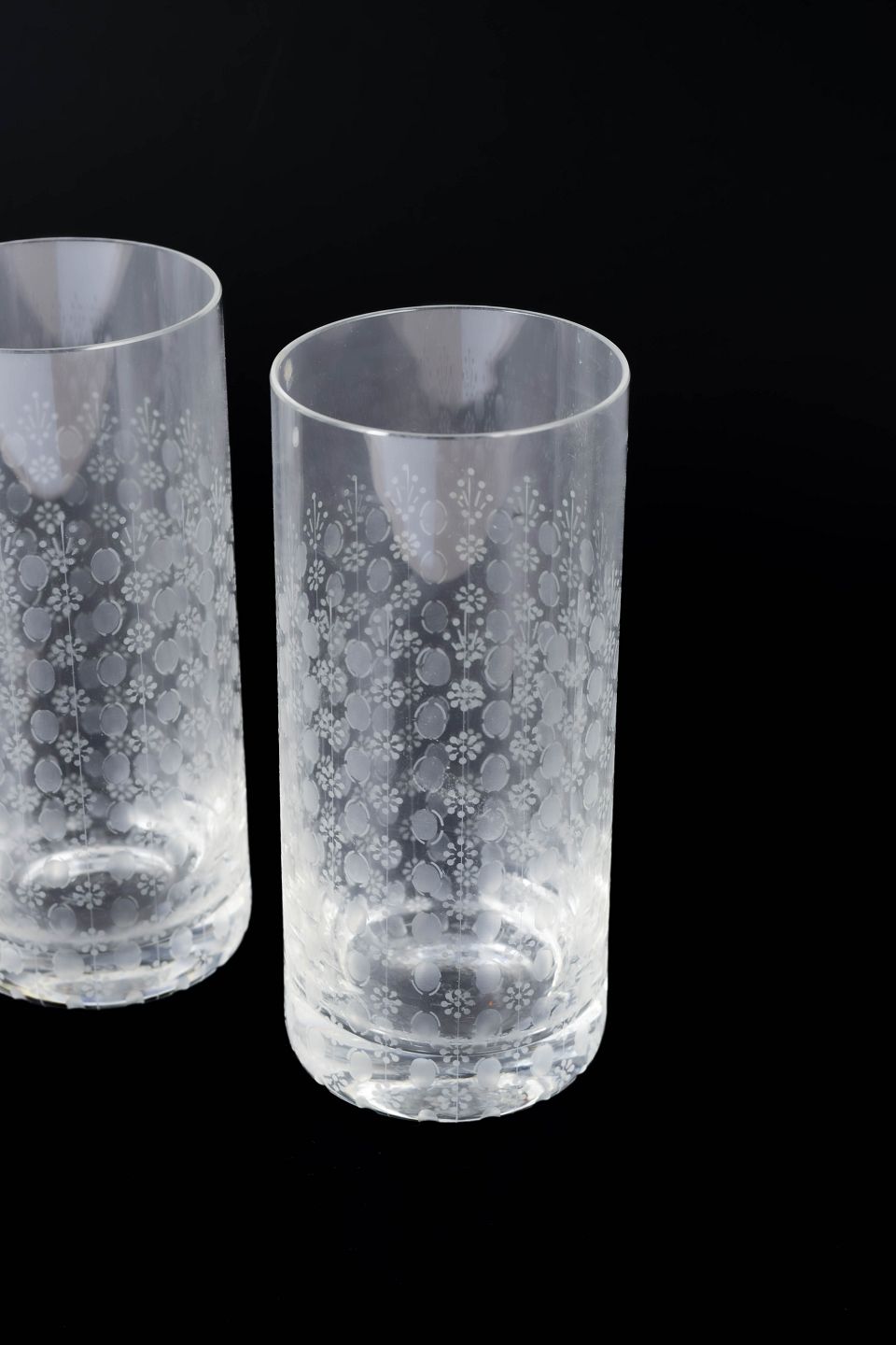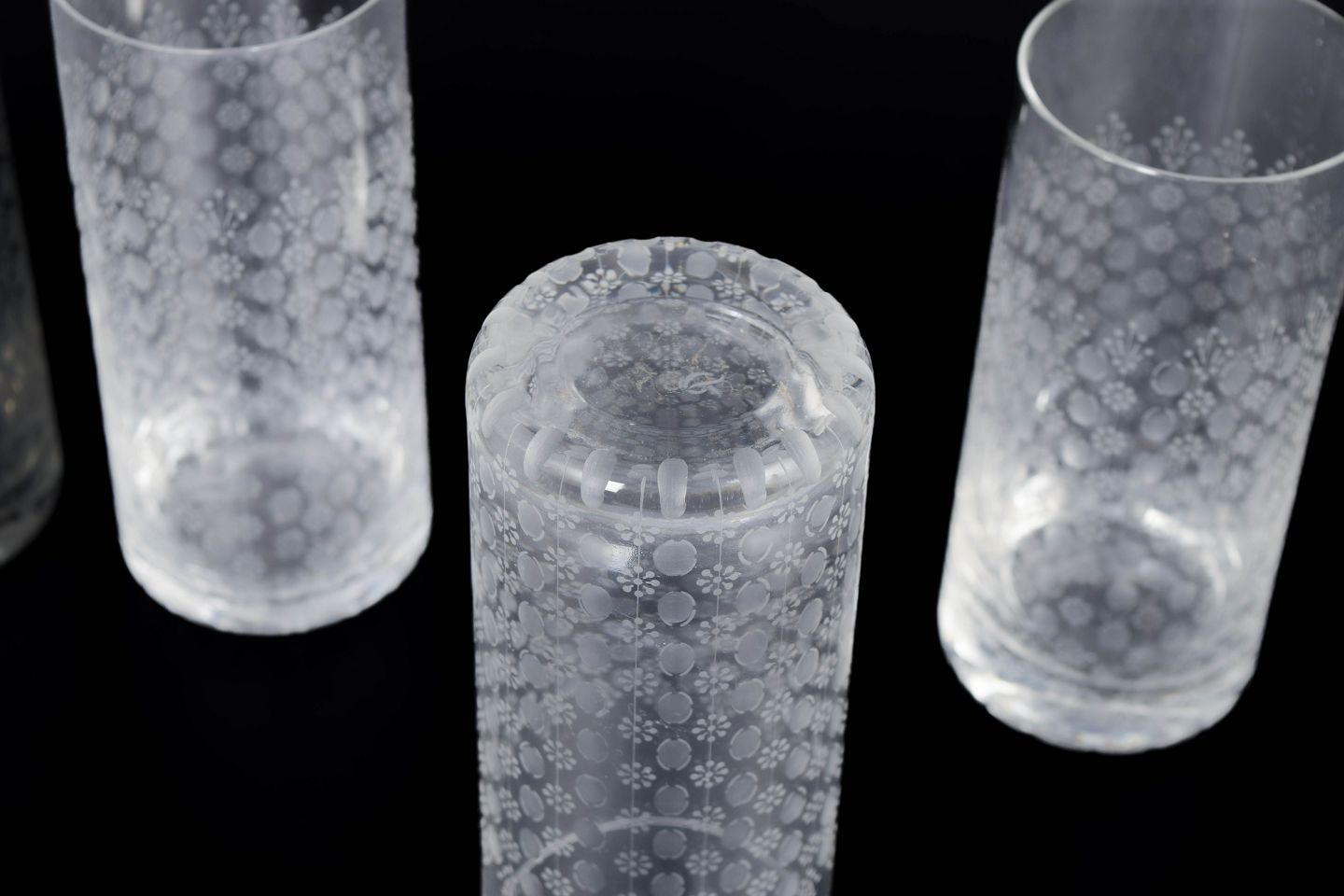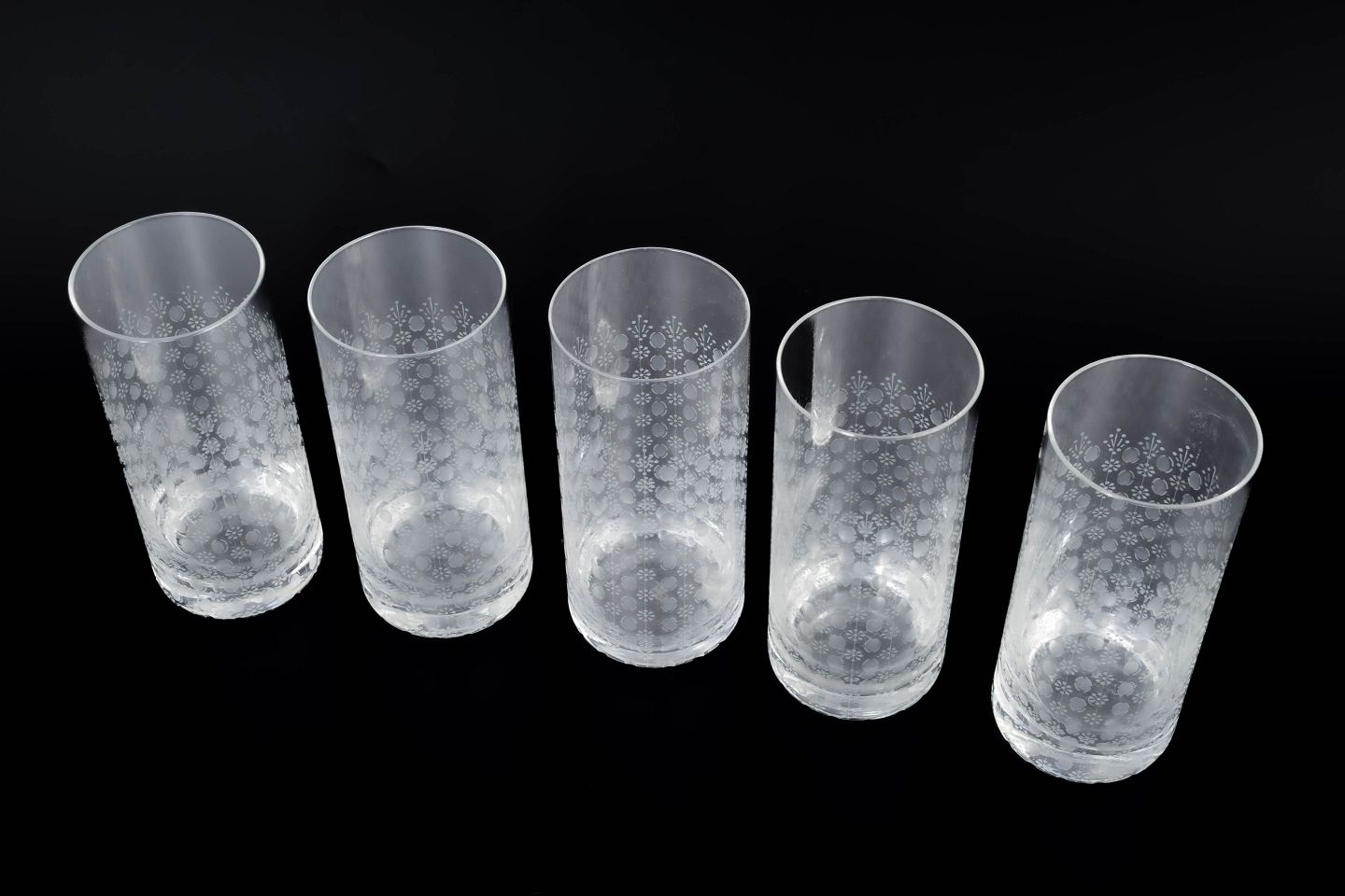 Bjørn Wiinblad for Rosenthal, sæt af fem “Romanze” glas.Elegant sæt af fem høje glas i klart glas med syreætsede dekorative motiver i romantisk og ornamental stil, model “Romanze”.