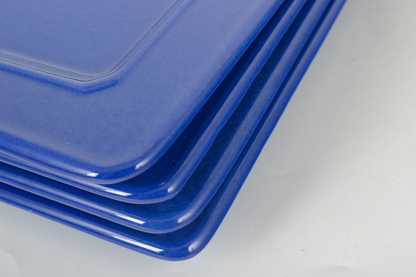 Tiffany Boutique, sæt af fire store tallerkner.Enkelt og stilrent sæt i glaseret keramik bestående af fire store firkantede tallerkner i ensartet blå farve med blank overflade.