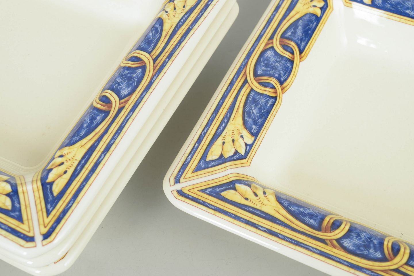 Tiffany Boutique, sæt af fire middagstallerkner.Dekorativt sæt i keramik bestående af fire middagstallerkner med bred kant dekoreret i blå, gule og gyldne toner med ornamentale mønstre.