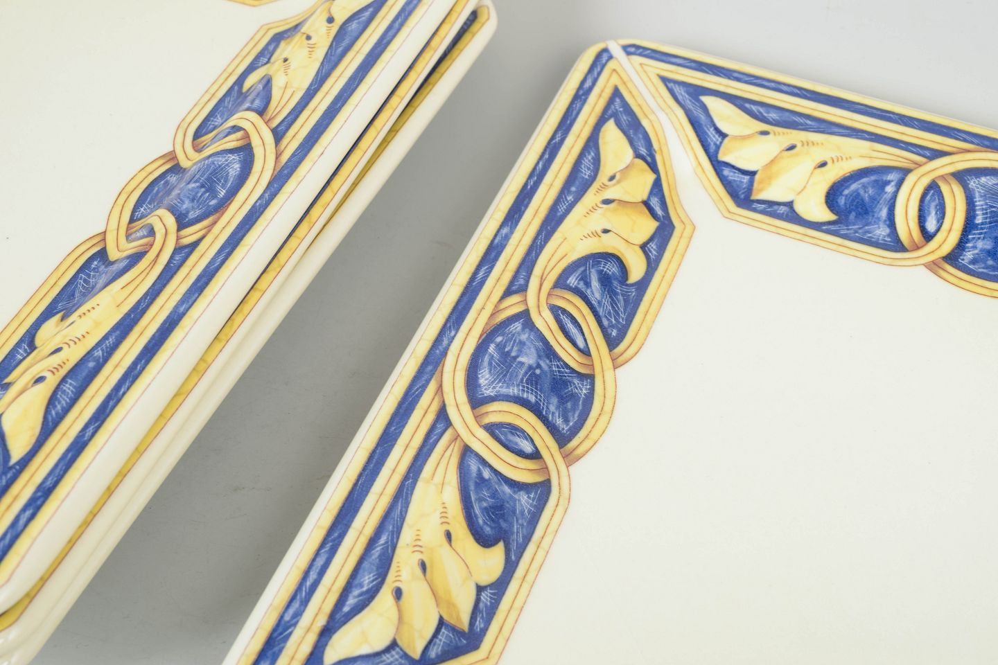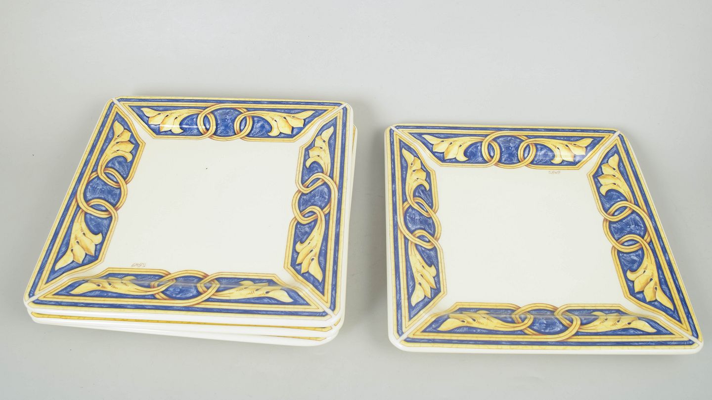 Tiffany Boutique, sæt af fire middagstallerkner.Dekorativt sæt i keramik bestående af fire middagstallerkner med bred kant dekoreret i blå, gule og gyldne toner med ornamentale mønstre.