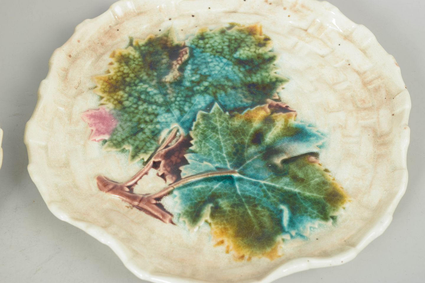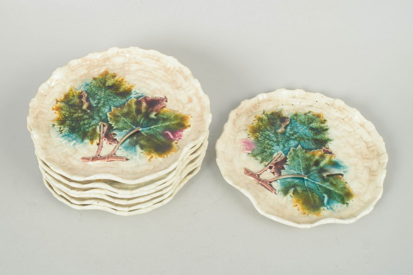 Gustavsberg majolika sæt af syv tallerkener.Dekorative tallerkener i glaseret fajance med reliefpræget og naturalistisk blomsterdekoration i farverig majolika glasur. Stemplet.