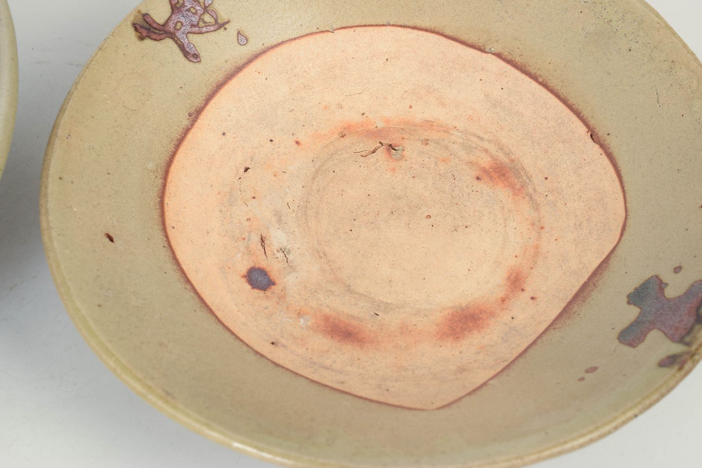 To fade, Qing-dynastiet (1644–1912)To keramiske fade, heraf et større med celadonglasur fra Longquan, med blød grønlig glasur og klassisk enkel form fra perioden.