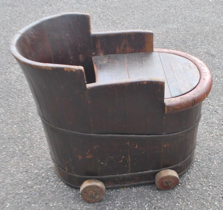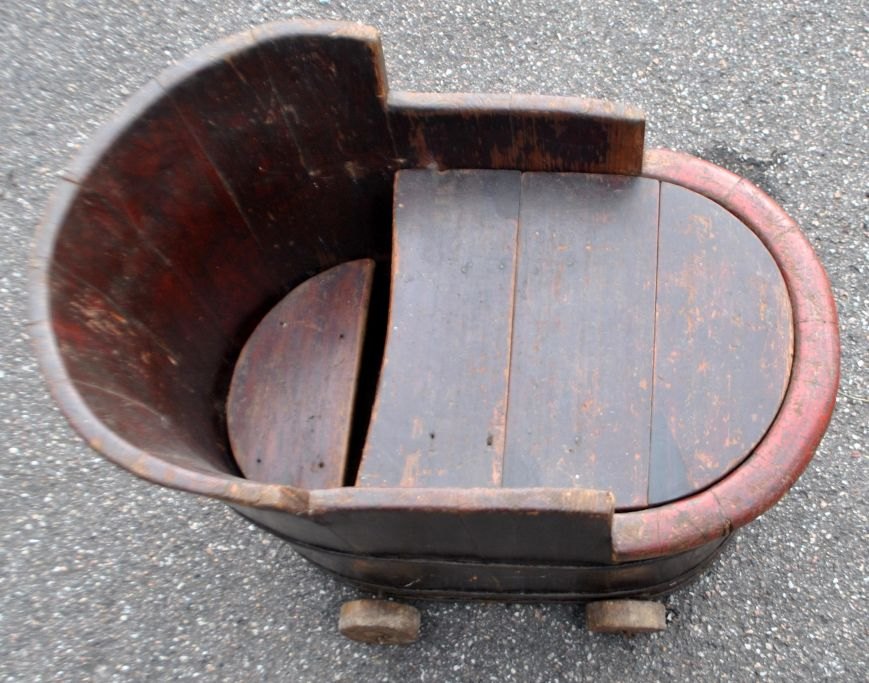 Barne badekar, 19. årh. Stavlimet bemalet træ. Med tøndebånd. På 4 hjul. H: 51 cm. L: 61 cm. B: 39 cm.Emne nummer: 29186