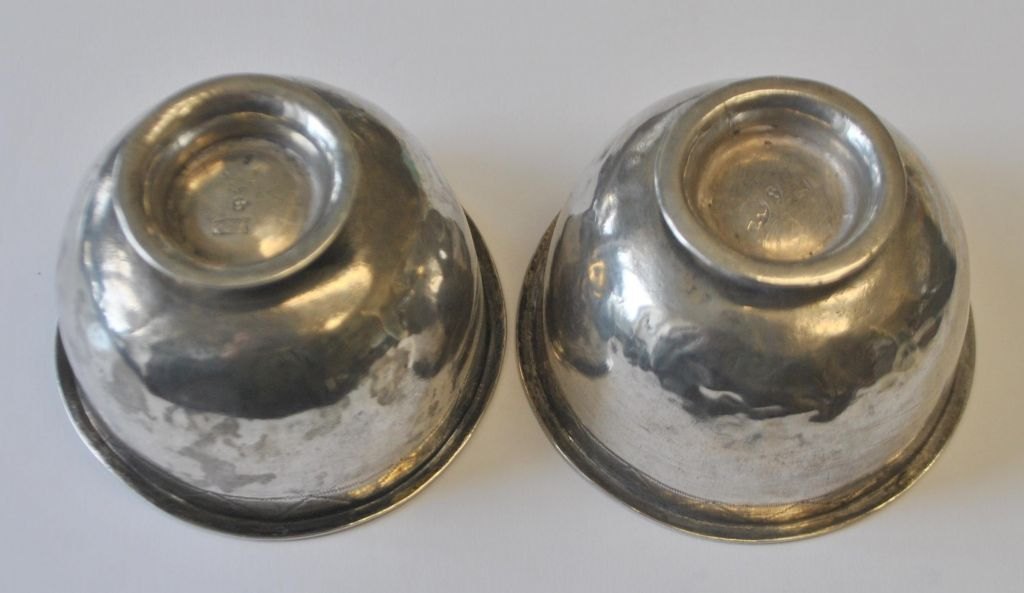 Par svenske sølvbægre, Peter Neiindorff, Lidköping (1797 - 1835). På standrand. Med dekorationer på kumme. Stemplet. H.: 4 cm. Dia.: 6 cm.NB: Sælges kun som par!