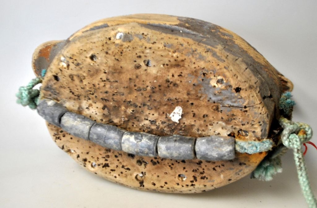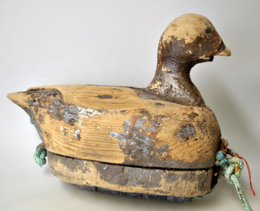 Lokkeand i træ og kork, ca. 1900. Danmark. Tidiligere med bemaling. Med blylodder som vægt. L.: 30 cm. H: 24 cm.NB: Der ydes ingen rabat på dette lot.