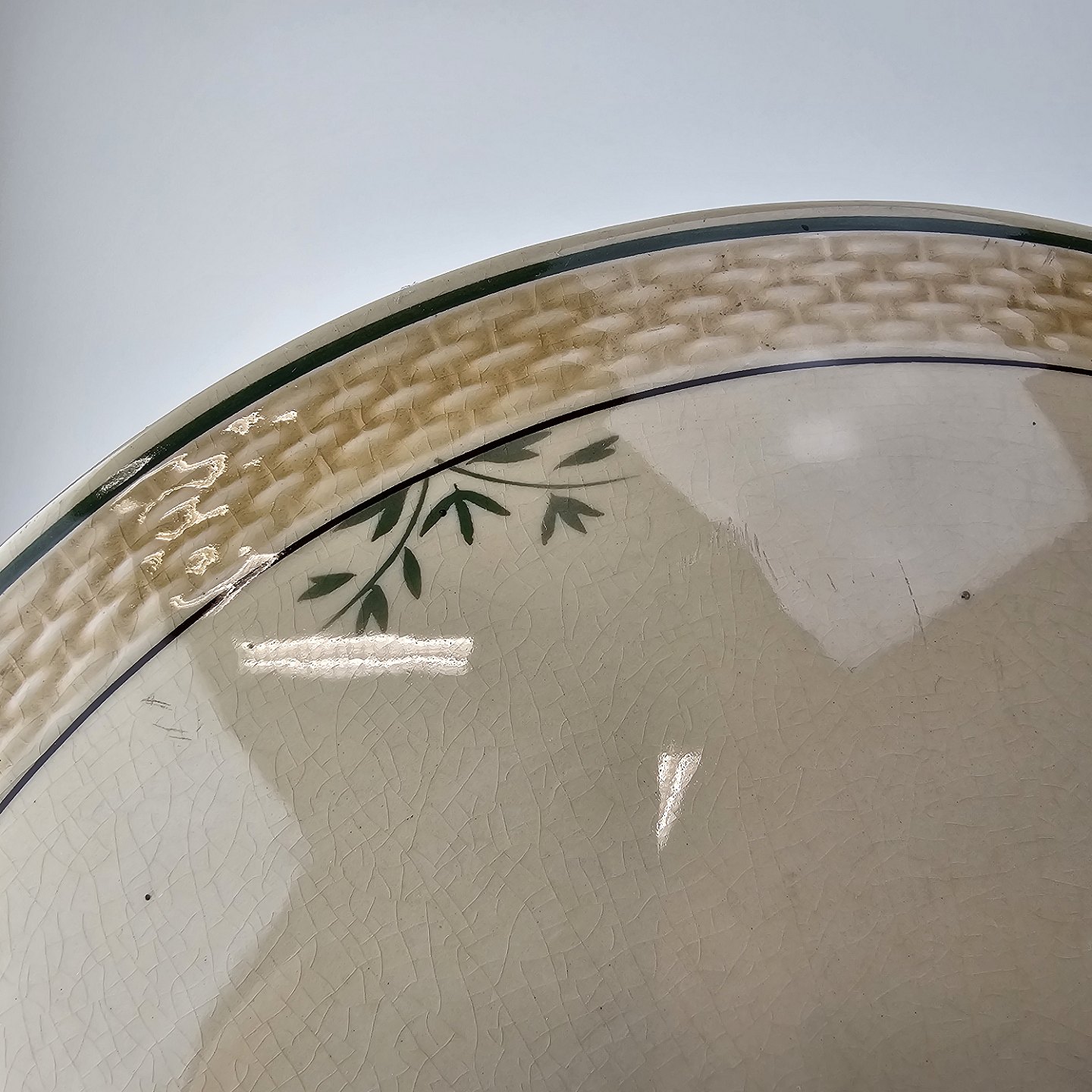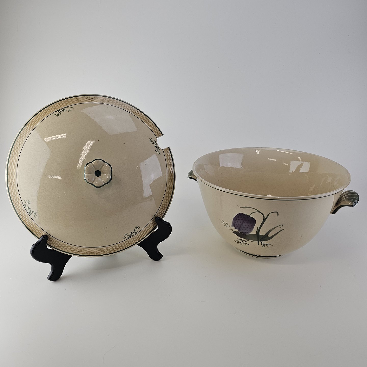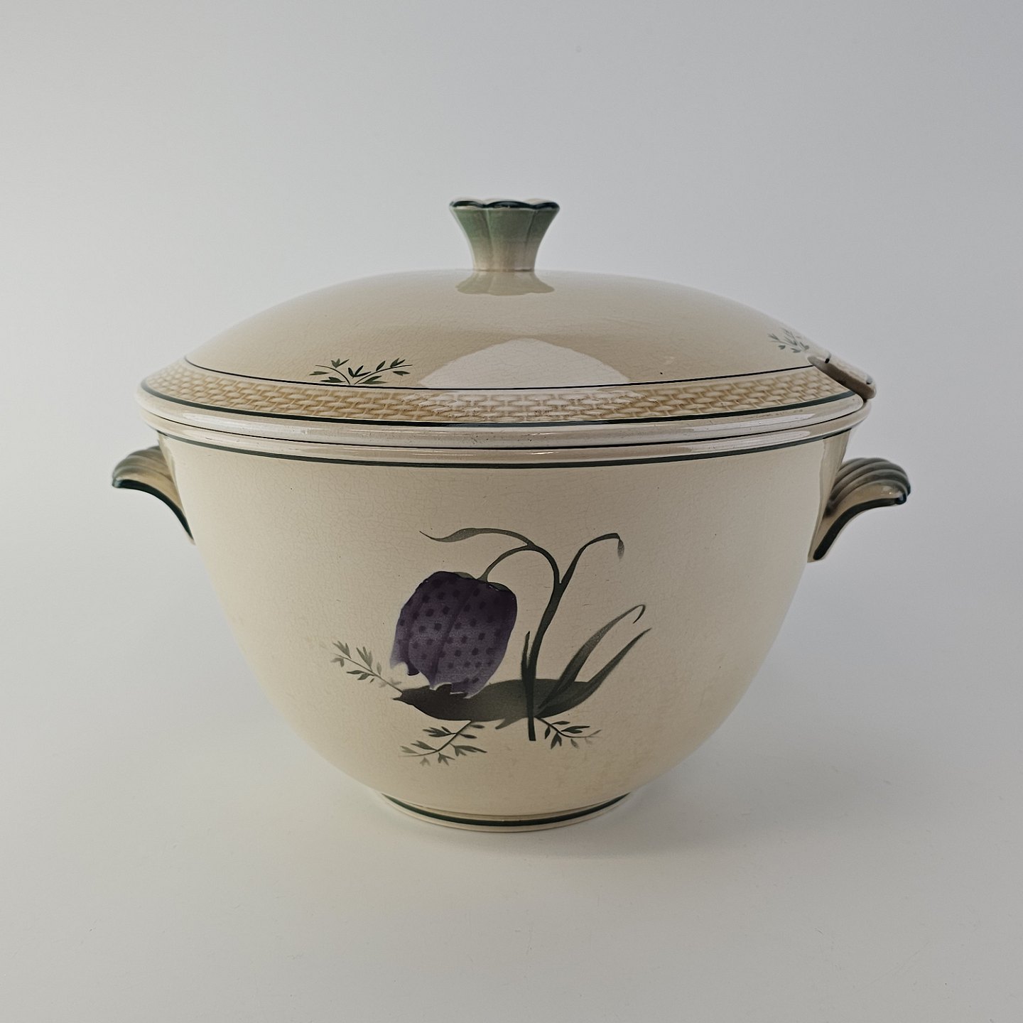 Fajancestel i stelform Viktoria II (Fletværk) med flettet kant og dekoration af en vibeæg blomst i violet og grøn, fremstillet i perioden 1934-1967