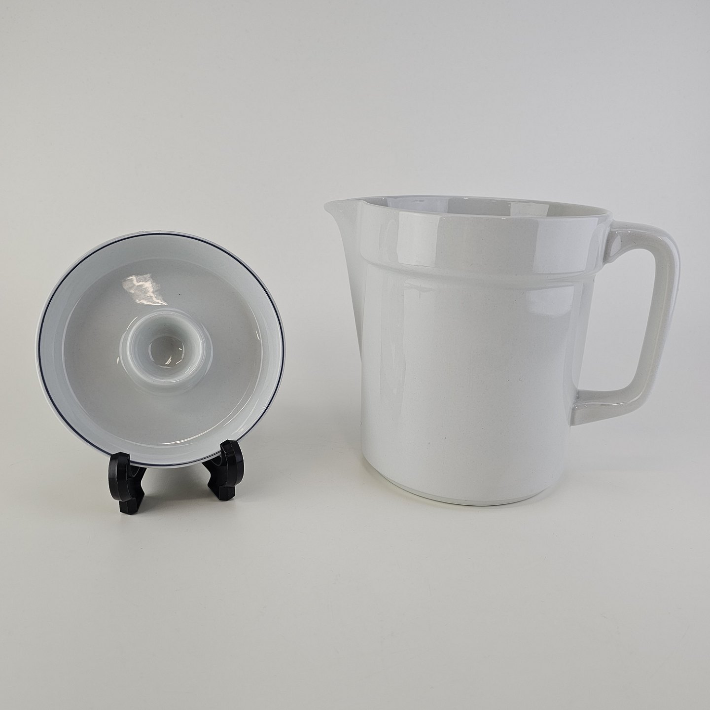 Blåkant er stel i hvid fajance med dekoration af en blå streg på kanten