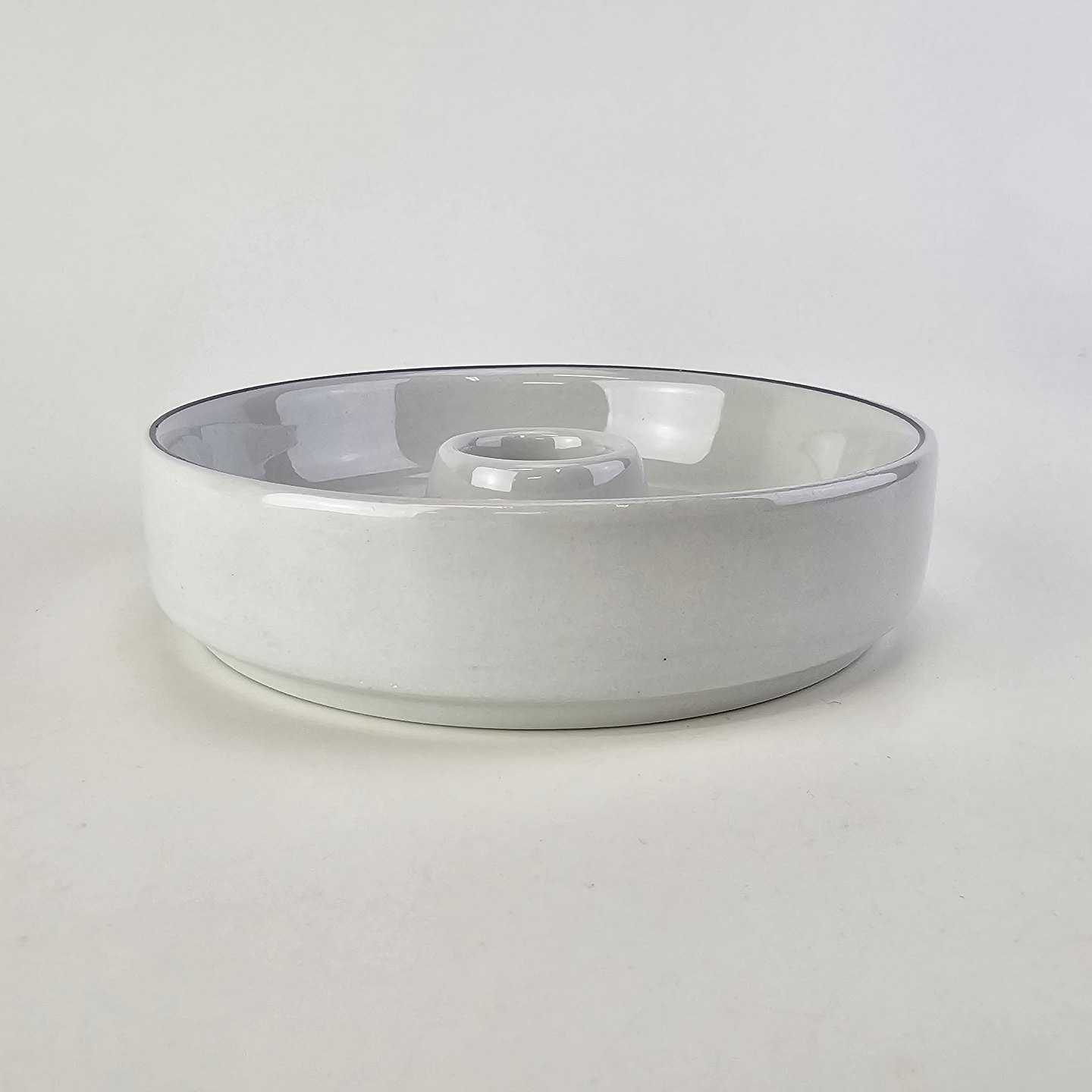 Blåkant er stel i hvid fajance med dekoration af en blå streg på kanten