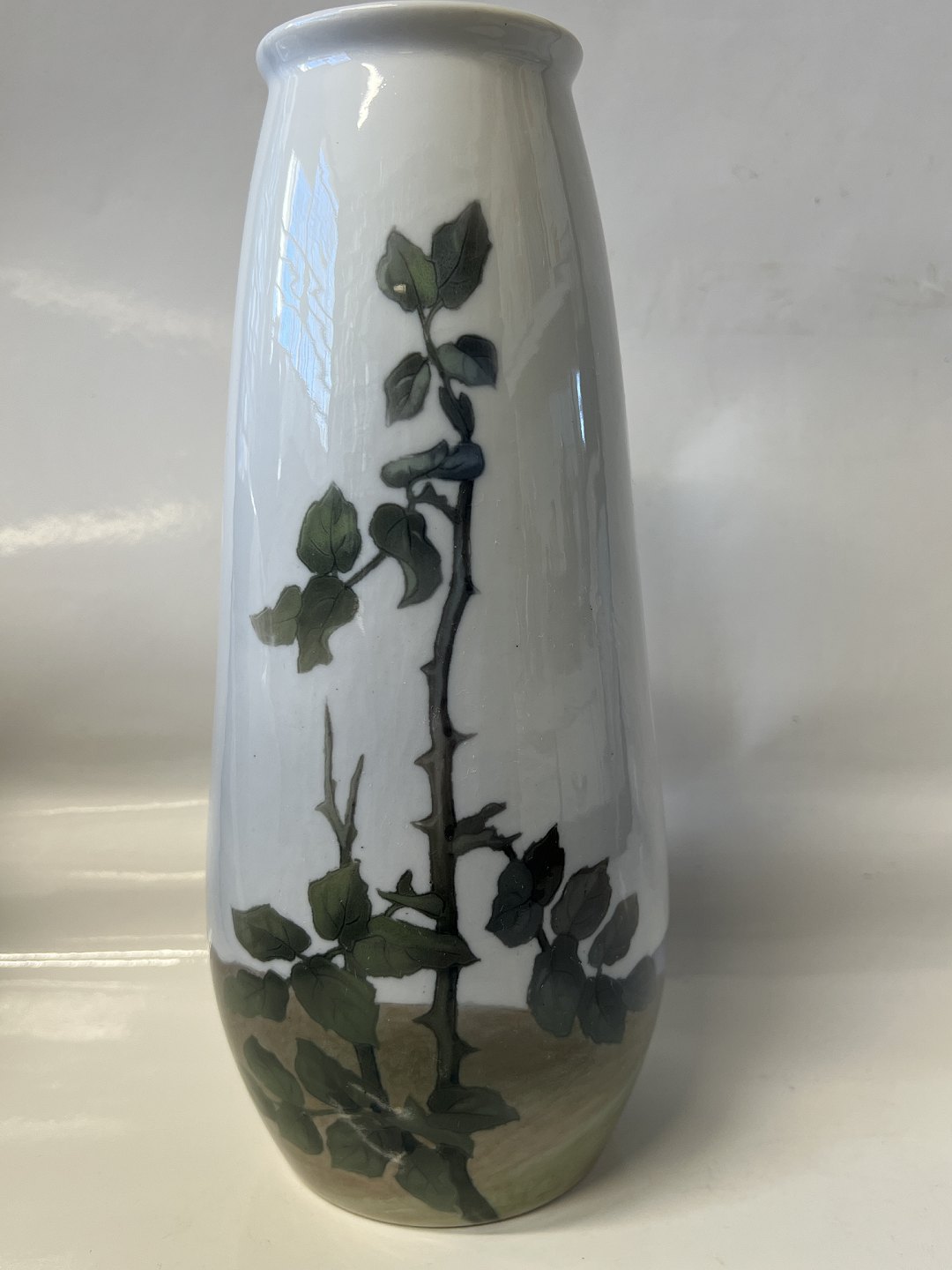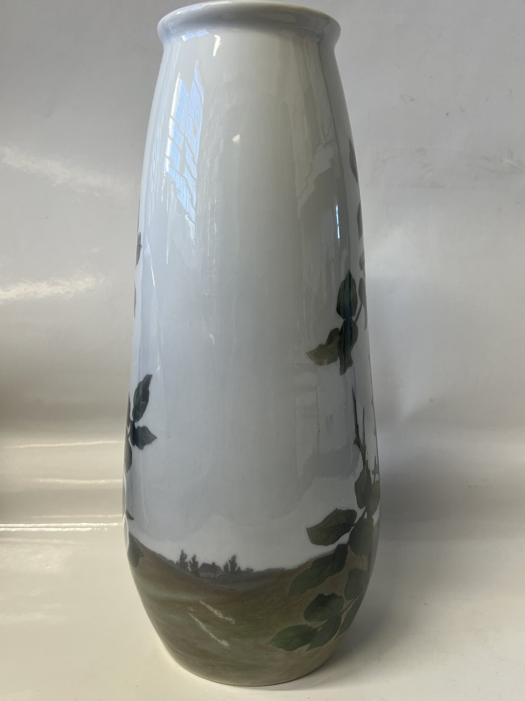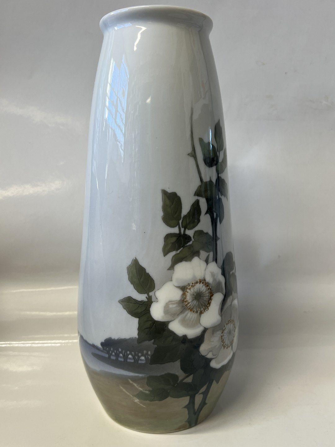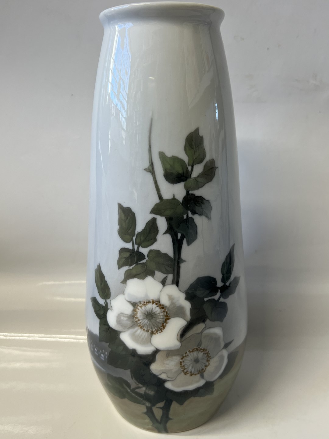 Royal Copenhagen Art nouveau vase dekoreret med hvide roser. Vasen er dekoreret hele vejen rundt.Stemplerne viser, at denne er produceret mellem 1898 og 1923.