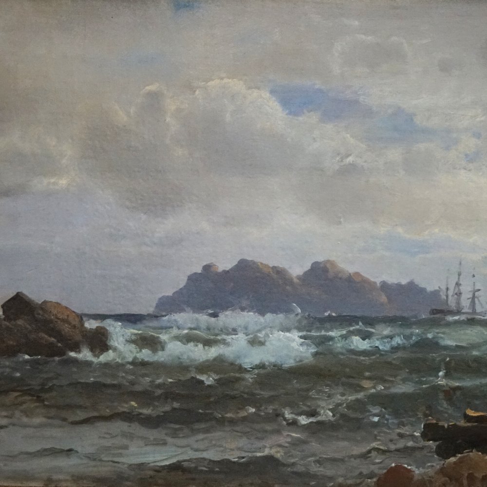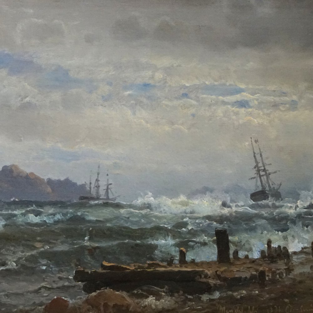 Mariner maleri af Carl Frederik Sørensen, motiv ved Mandal i Norge, juli 1873. Olie på lærred. Signeret "C. F. Sørensen" derudover indridset "Mandal Norge juli 1973".Med guldramme.