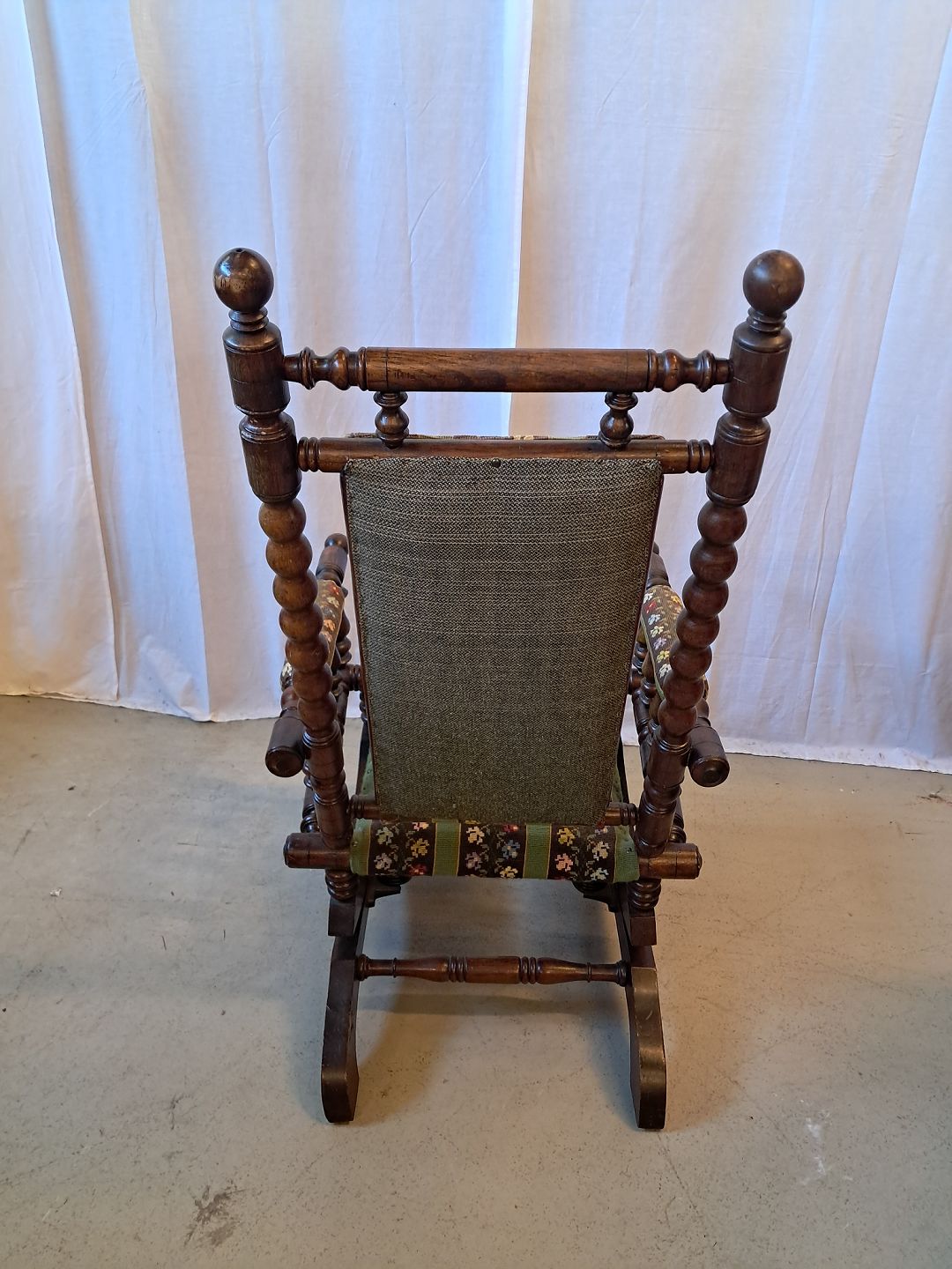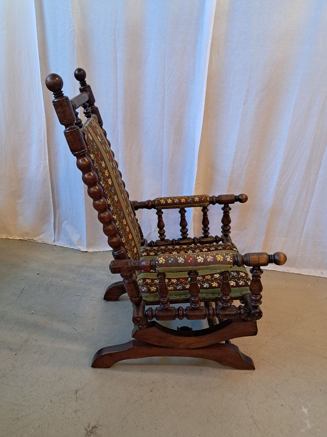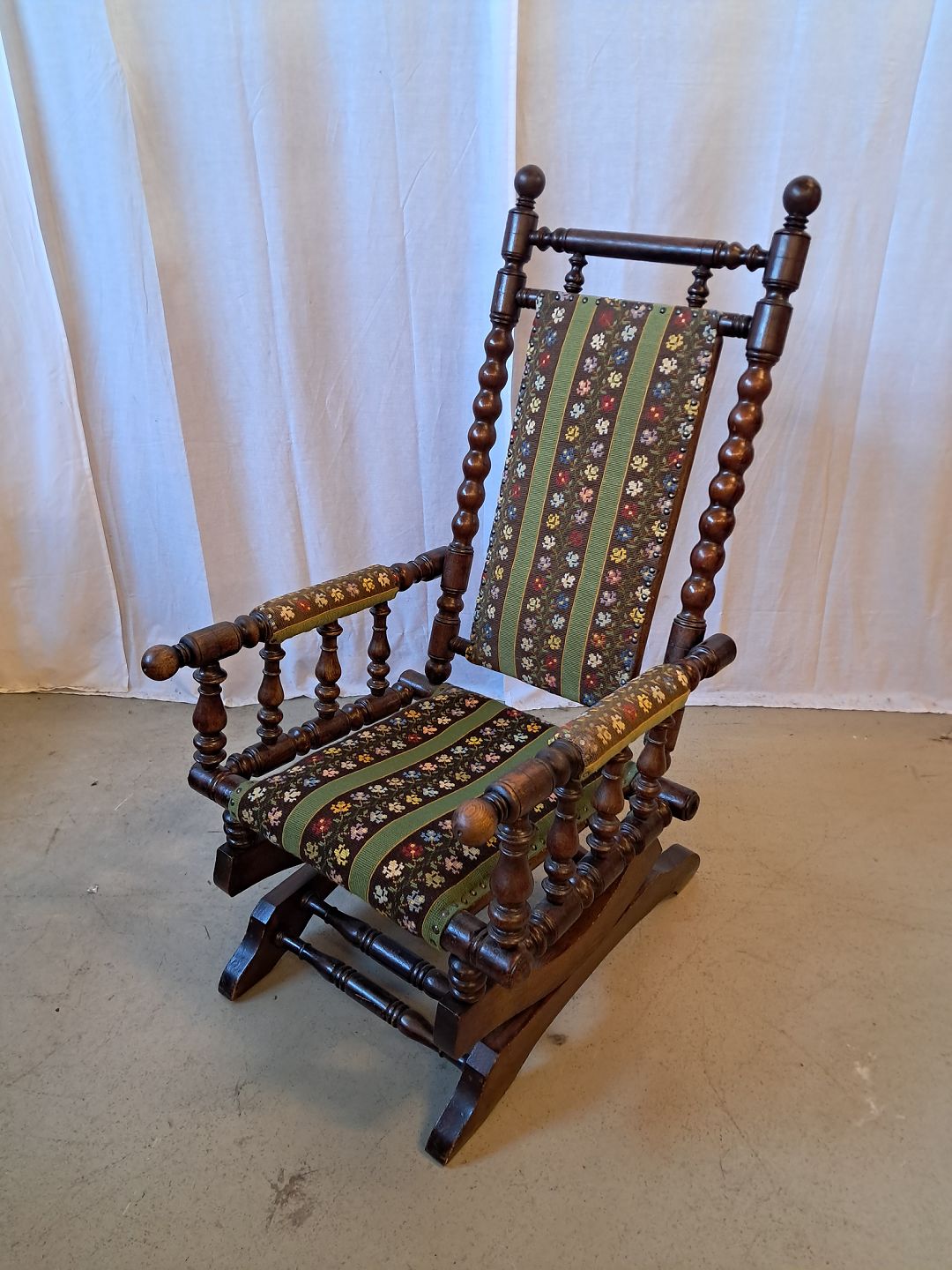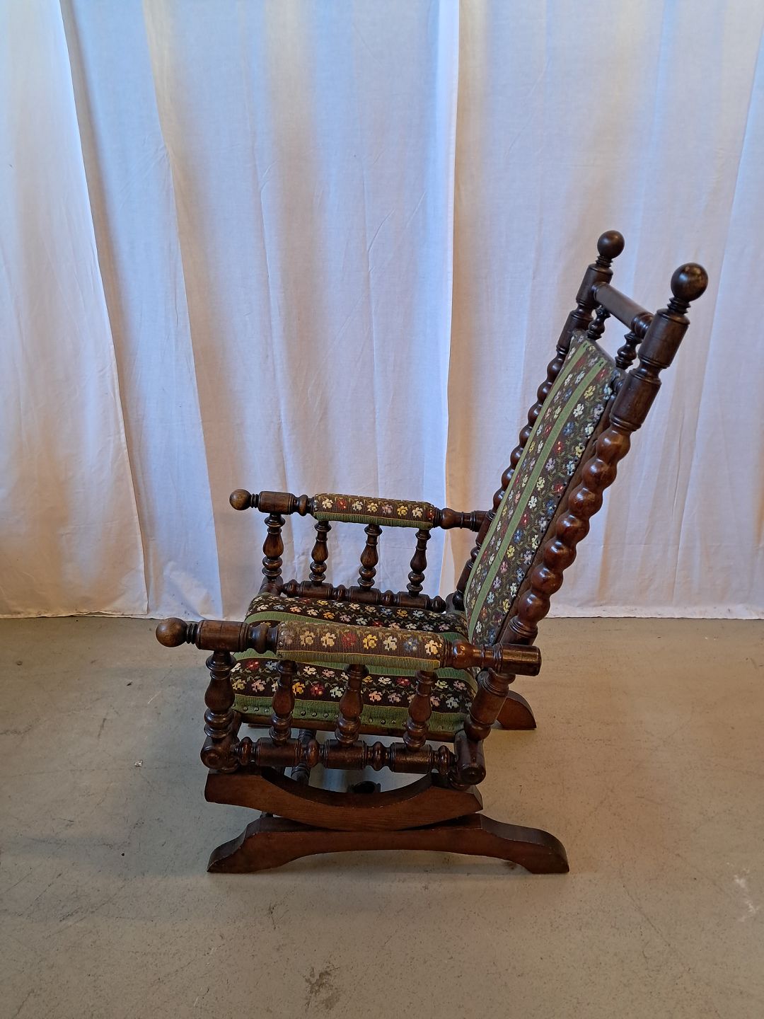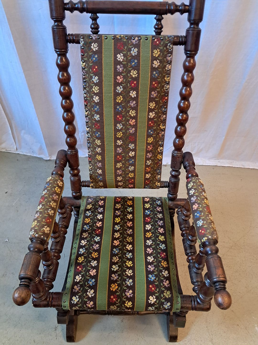 Rokkestol i massivt egetræ med broderet betræk, fra 1940erne.Den har brugsspor.