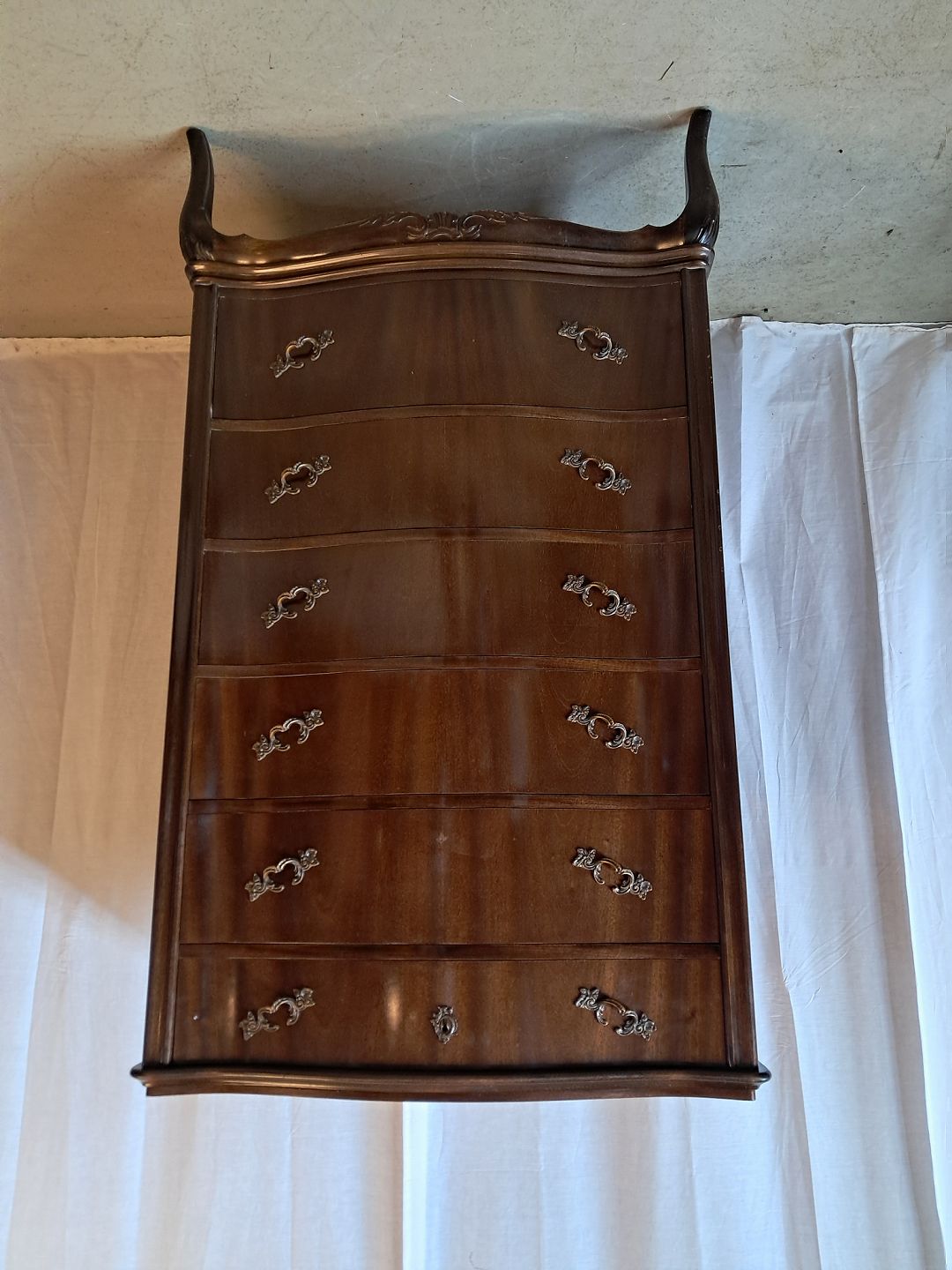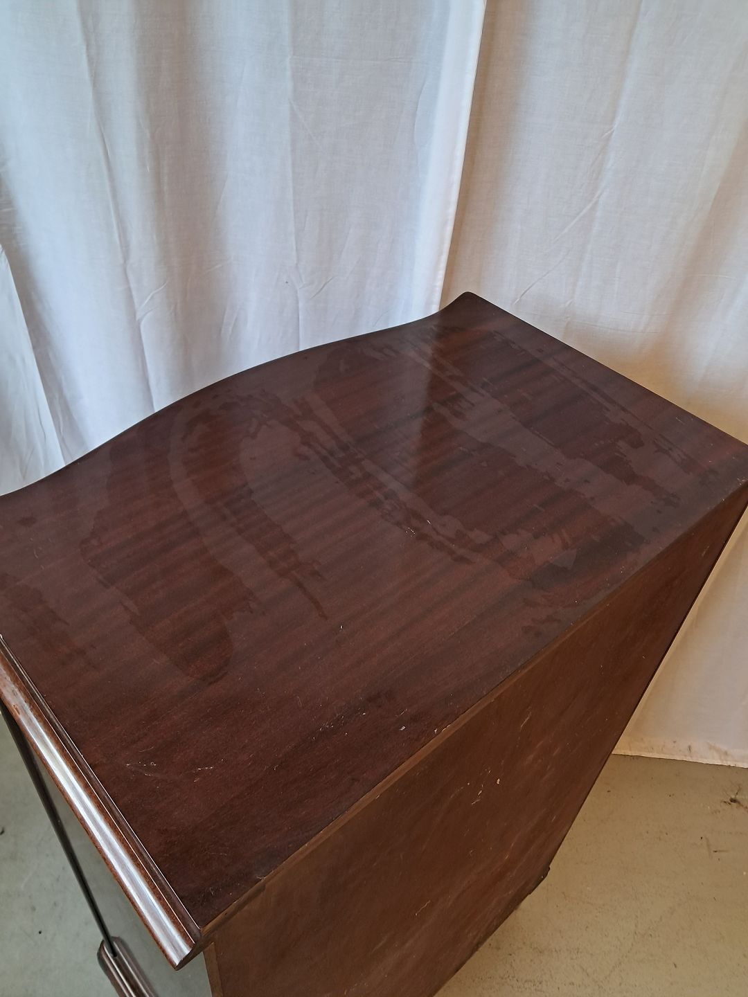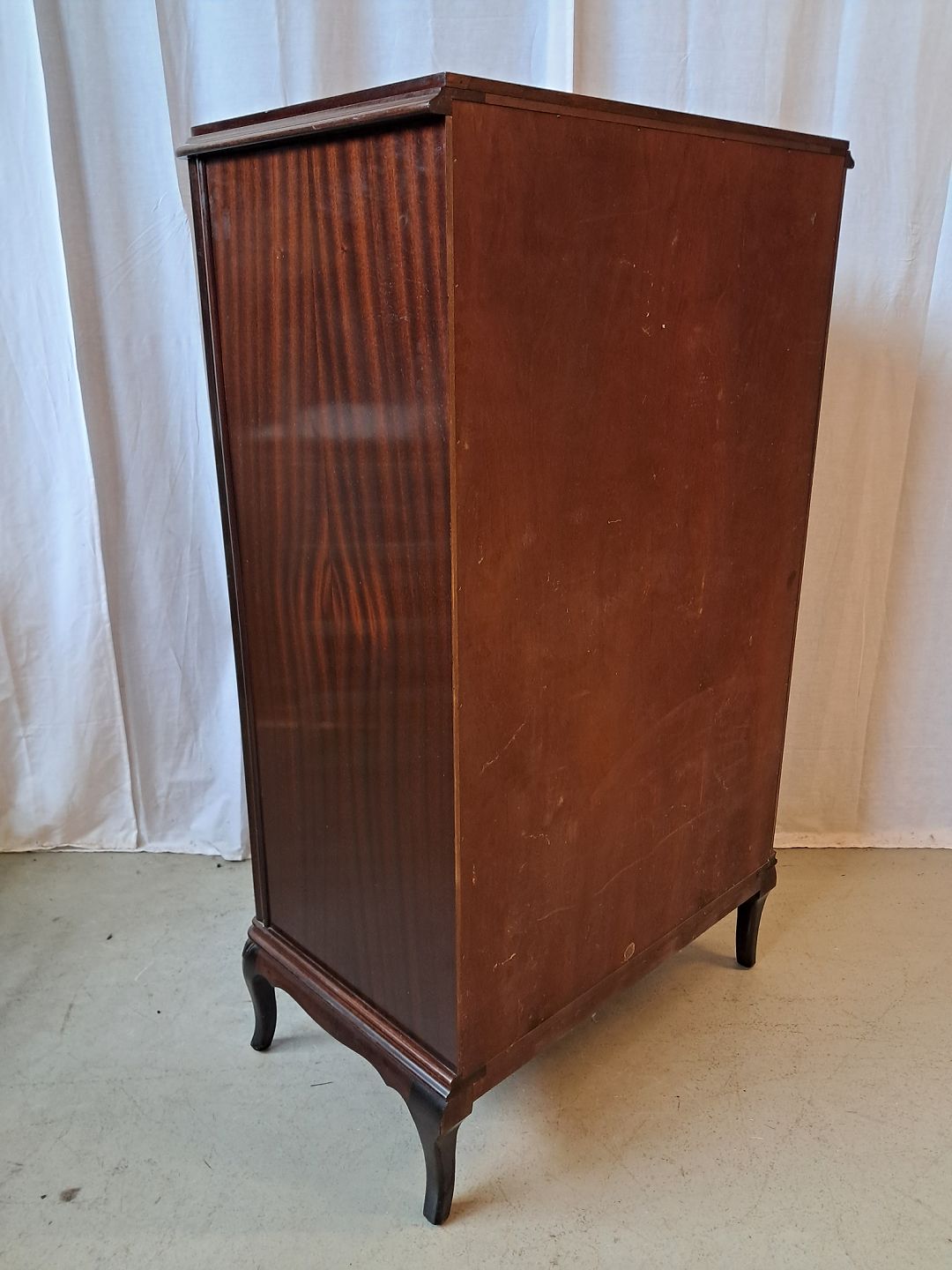 Kommode i fineret nødetræ, fra 1950erne.Den har brugsspor.