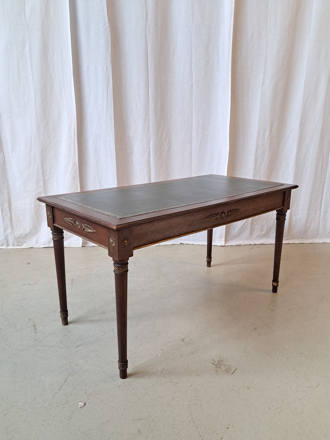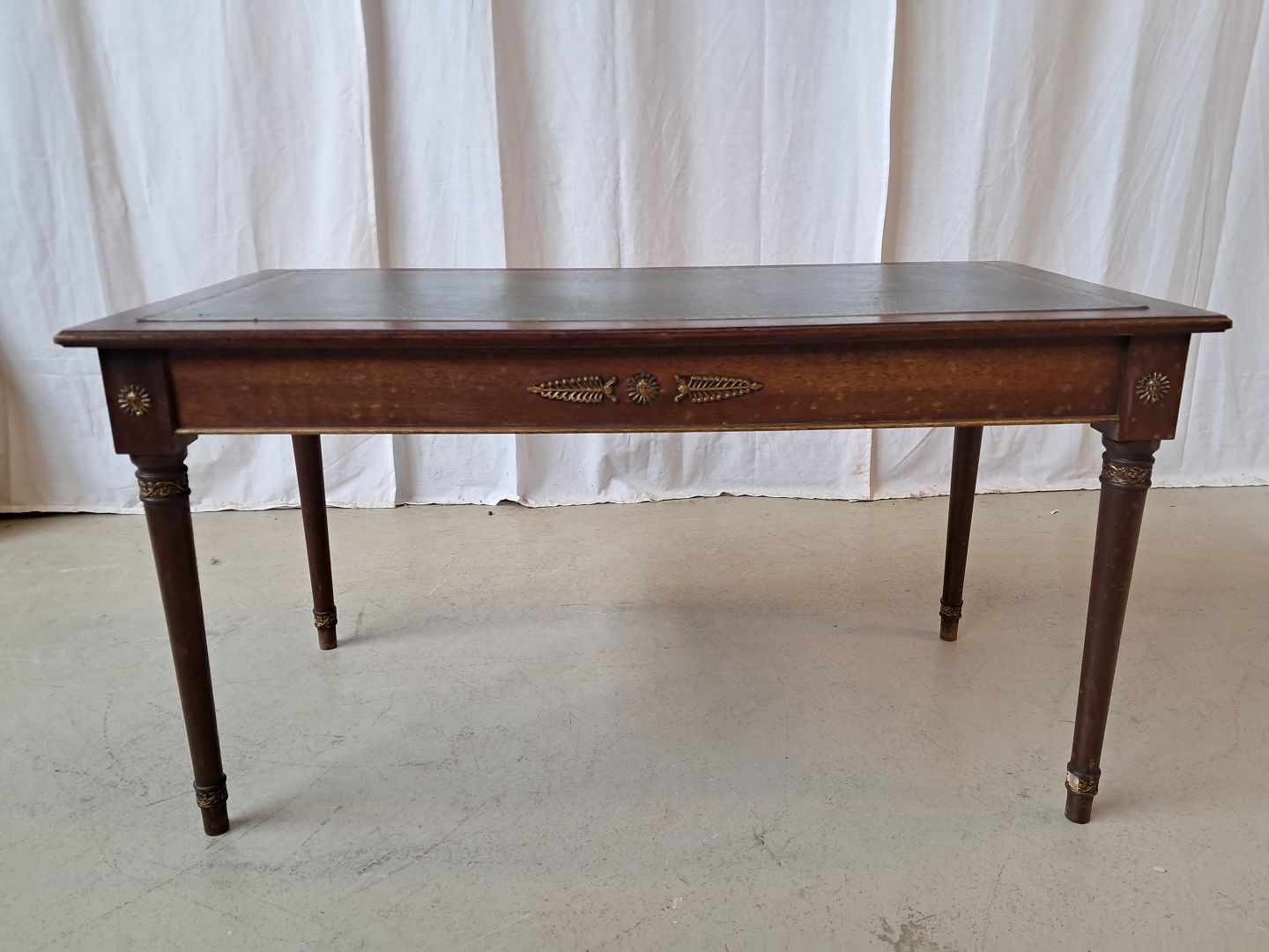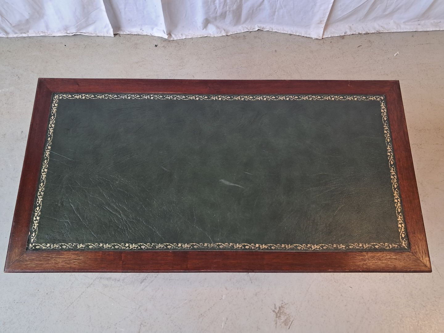Sofabord i fineret mahogni med kunstlæder indlæg, fra 1980erne.Det har brugsspor.