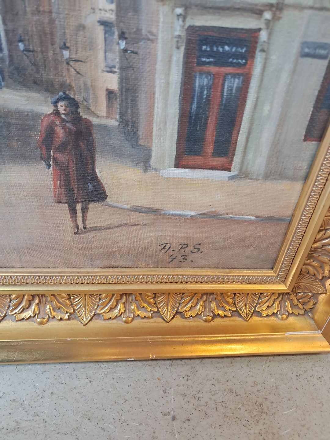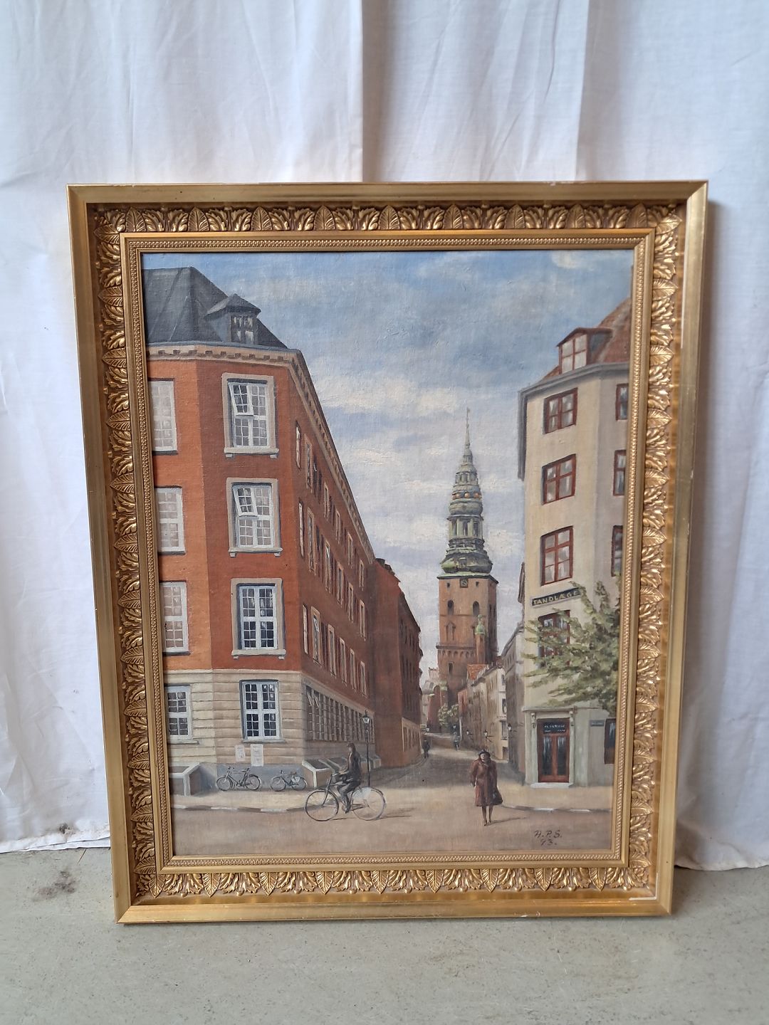 Maleri af Nikolaj kirke i guldmalet ramme, fra 1950erne.Det har brugsspor.