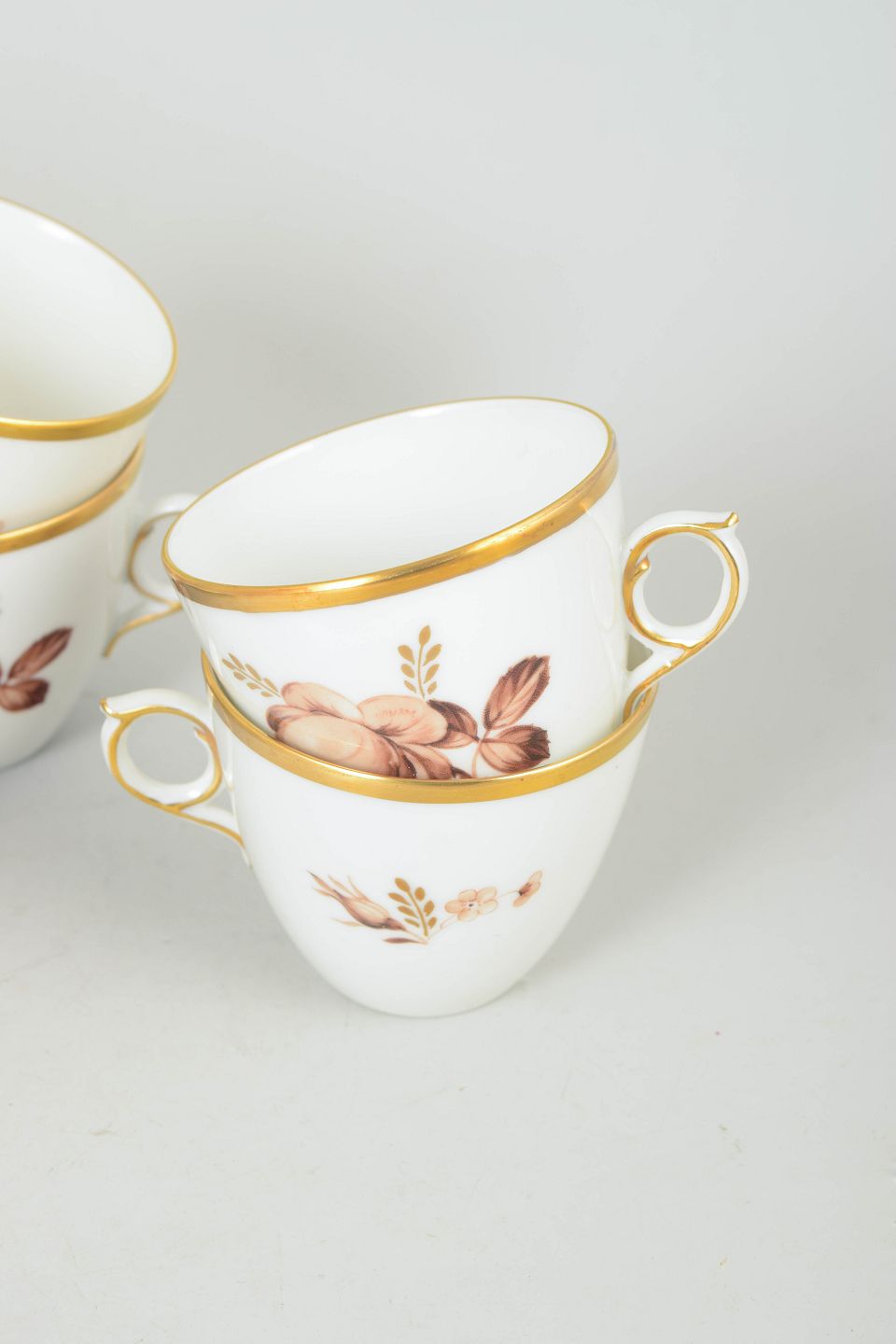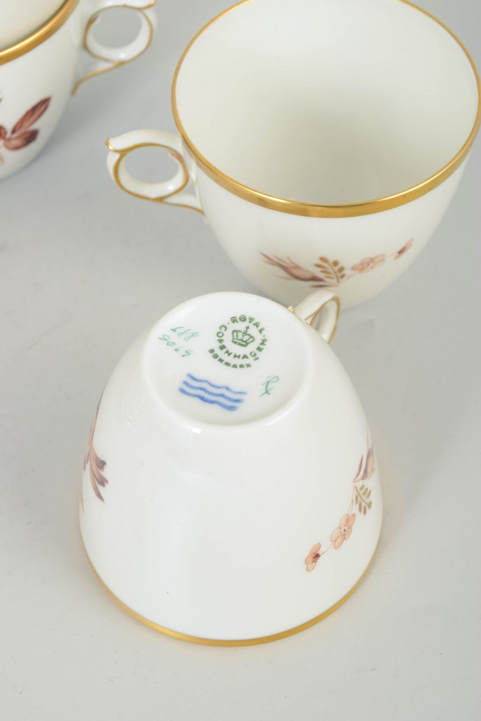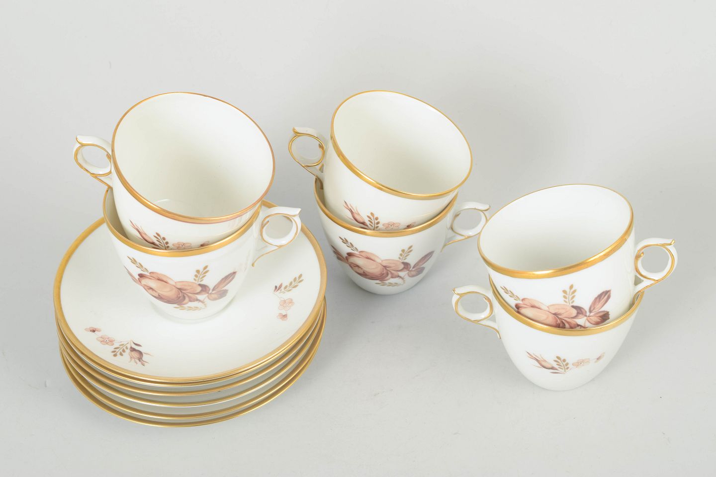 Royal Copenhagen brun rose, sæt af seks kaffekopper med underkopper.Elegant stel i hvidt porcelæn dekoreret med brun blomsterdekoration og guldkant. Model 688/9069. Første sortering.