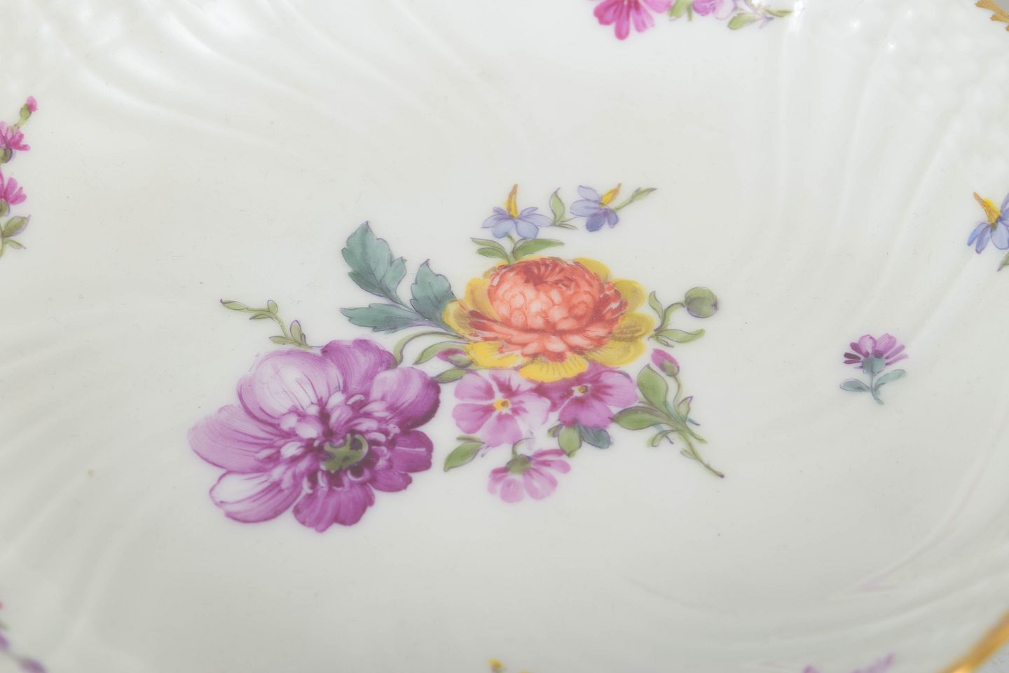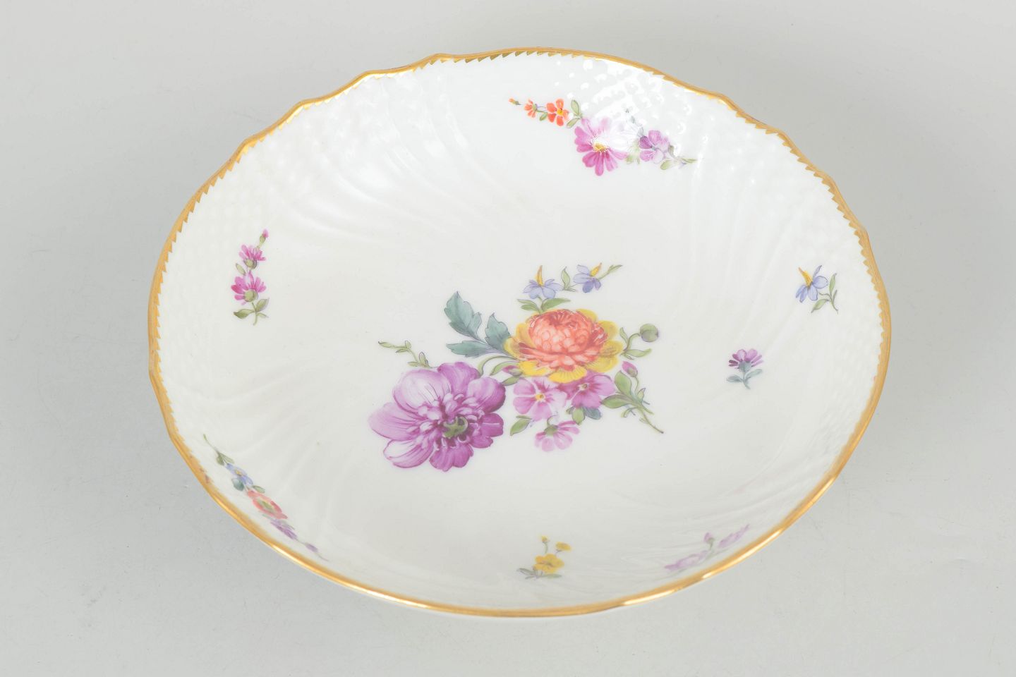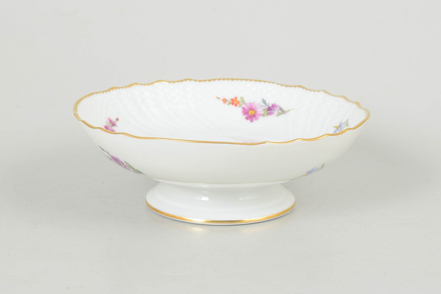 Opsats i porcelæn med polykrom blomsterdekoration i saksisk blomst og bølget kant med guldrand. Hævet på fod med klassisk profil. Model 4/1532, 1. sortering.
