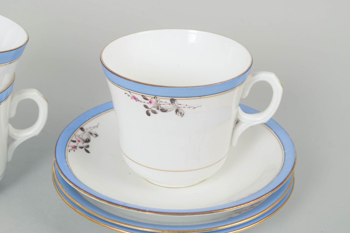 Carlstad, sæt af tre store kaffekopper med underkopper.Elegant porcelænssæt med lyseblå kant og fin blomsterdekoration. Model “Carlstad” fremstår med klassisk formsprog fra perioden.