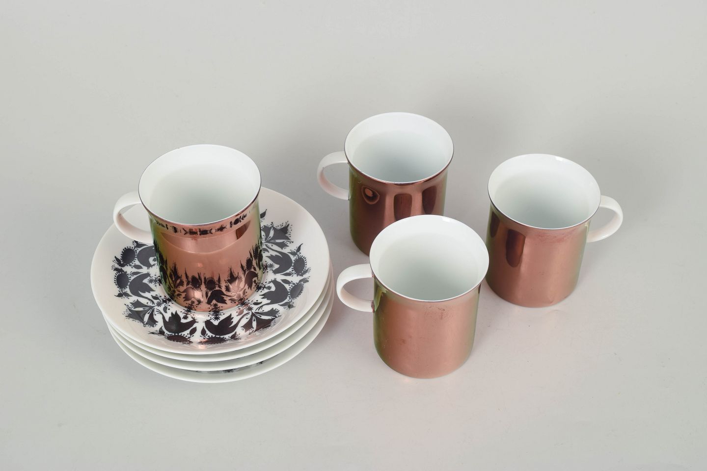 Bjørn Wiinblad for Rosenthal, sæt af fire kaffekopper med underkopper.Kaffesæt fra Hilton-serien bestående af fire kopper med tilhørende underkopper i porcelæn.