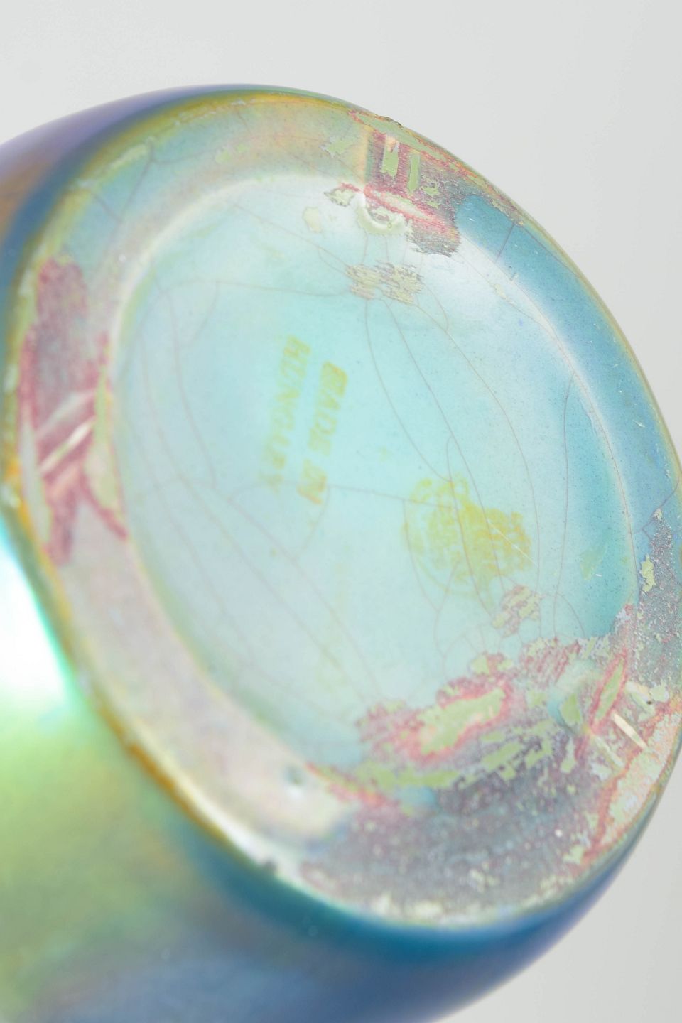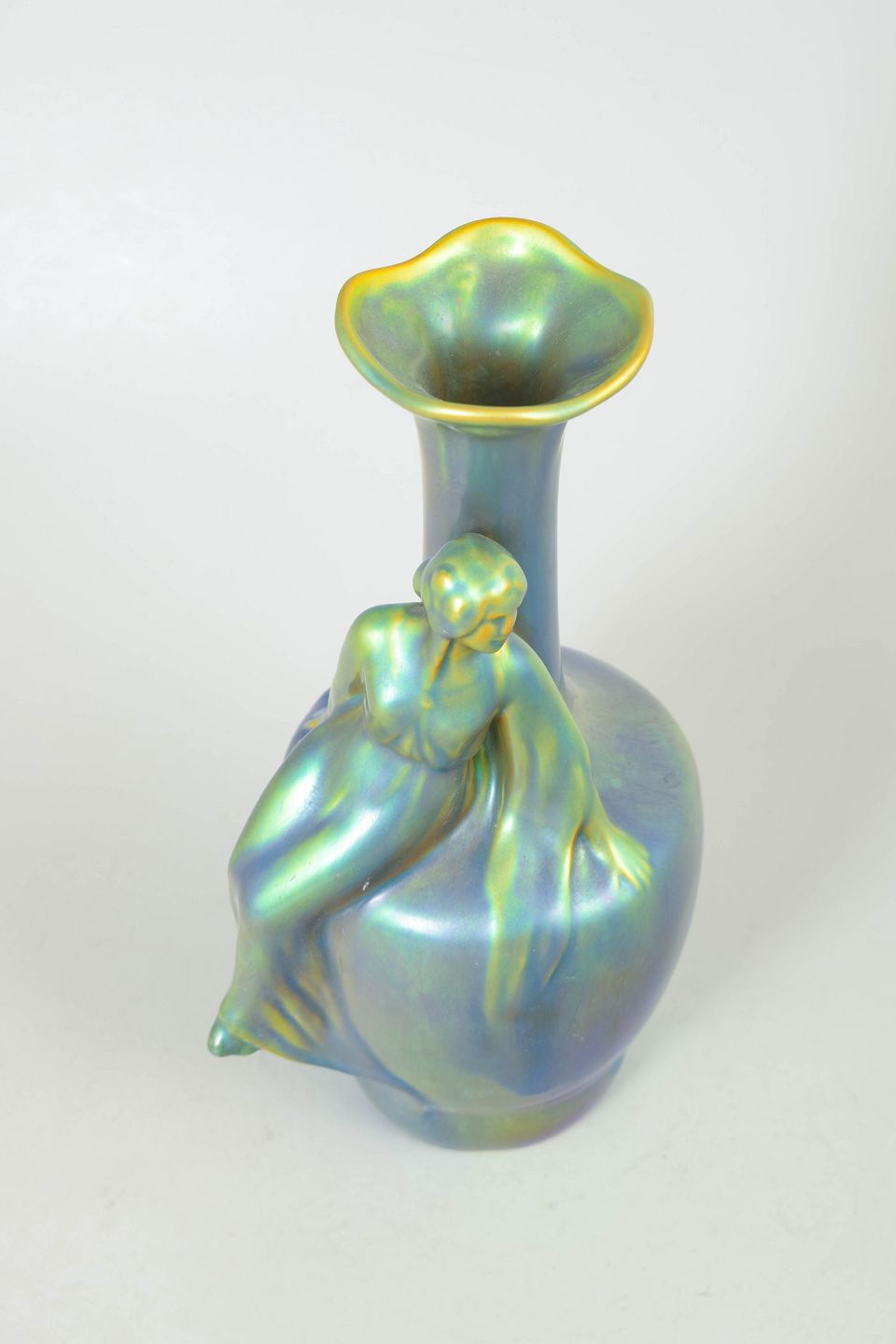 Art nouveau vase med integreret kvindefigur i flydende, organisk form. Udført i karakteristisk iriserende eosin glasur med skiftende grønne, blå og gyldne nuancer.