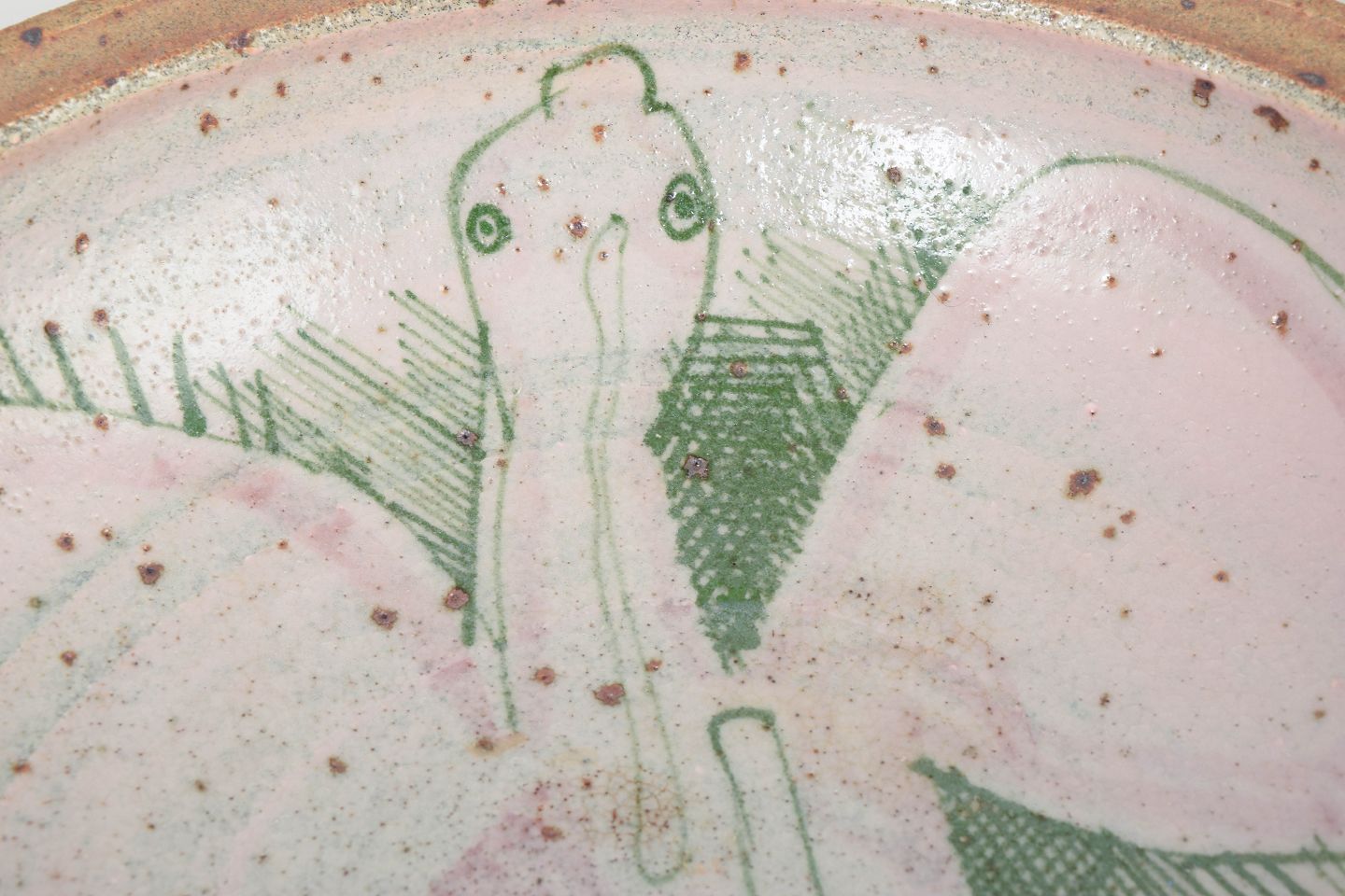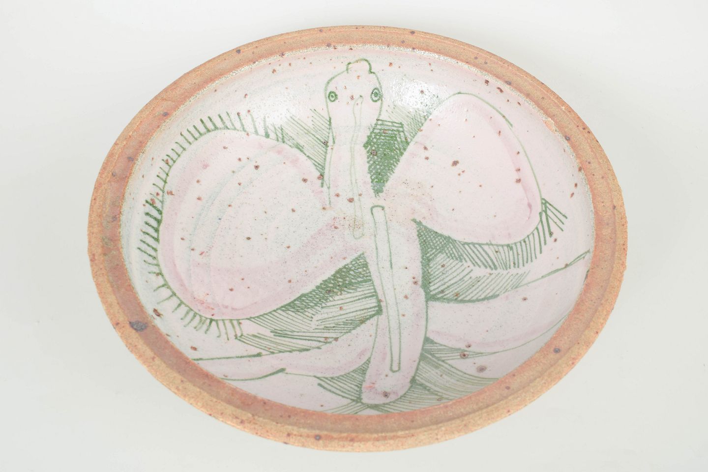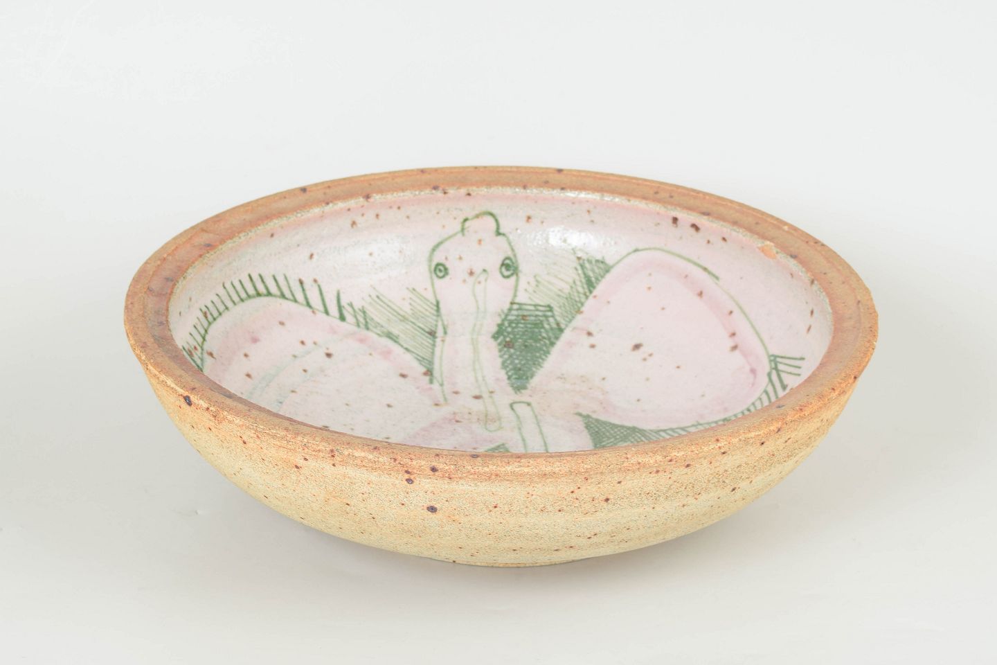 Sten Lykke Madsen for Bing & Grøndahl, unika skål.Hånddrejet og signeret kunstkeramisk skål med dekorativ figurativ udsmykning i bløde grønne og rosa nuancer på lys bund. Et unika med tydeligt kunstnerisk udtryk fra Sten Lykke Madsens arbejde hos Bing & Grøndahl.