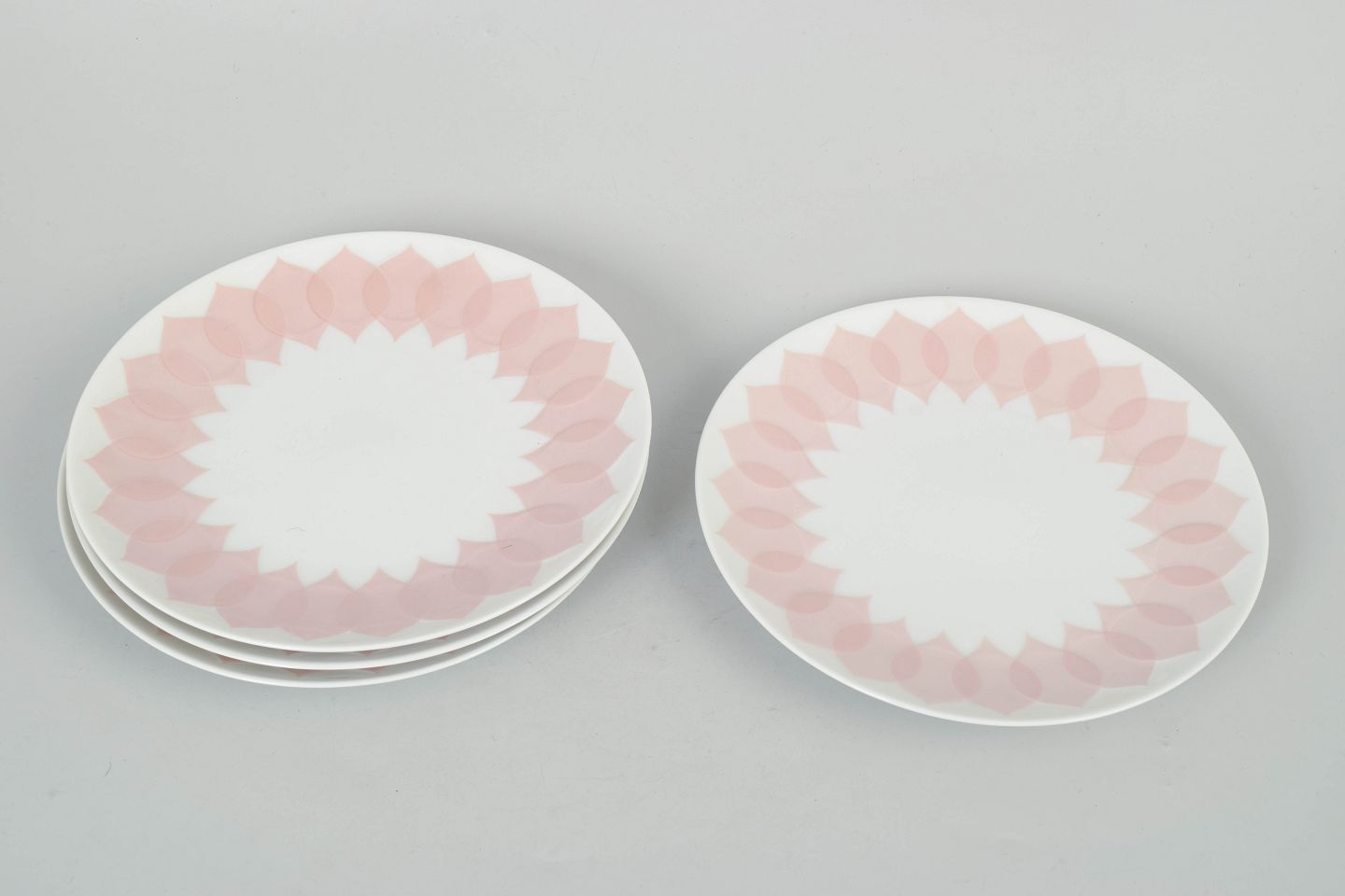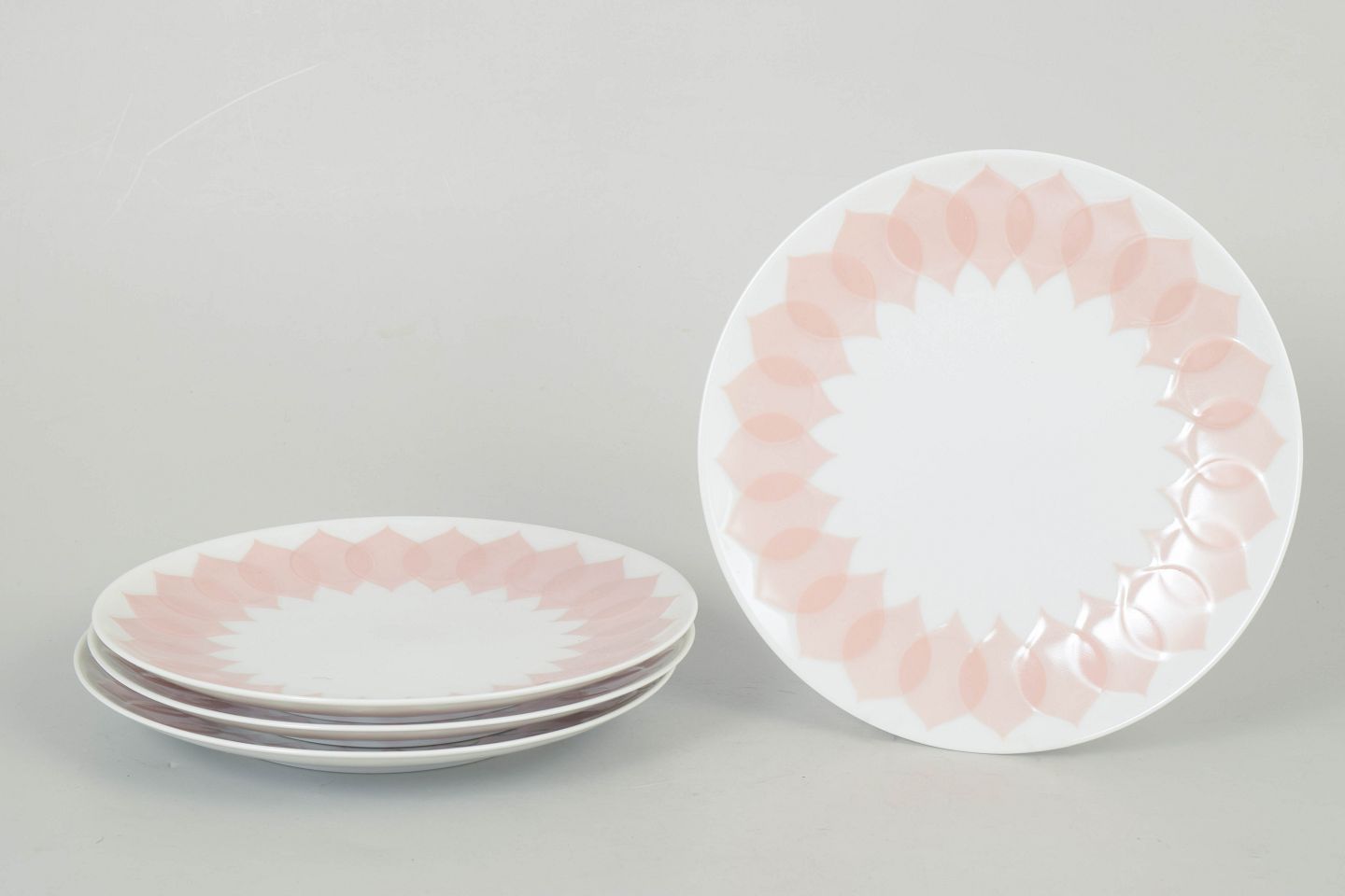 Bjørn Wiinblad for Rosenthal, sæt af fire tallerkener.Fire tallerkener i porcelæn med rosa “Lotus” dekoration, udført med gentaget bladmotiv langs kanten i bløde nuancer og et karakteristisk dekorativt udtryk.