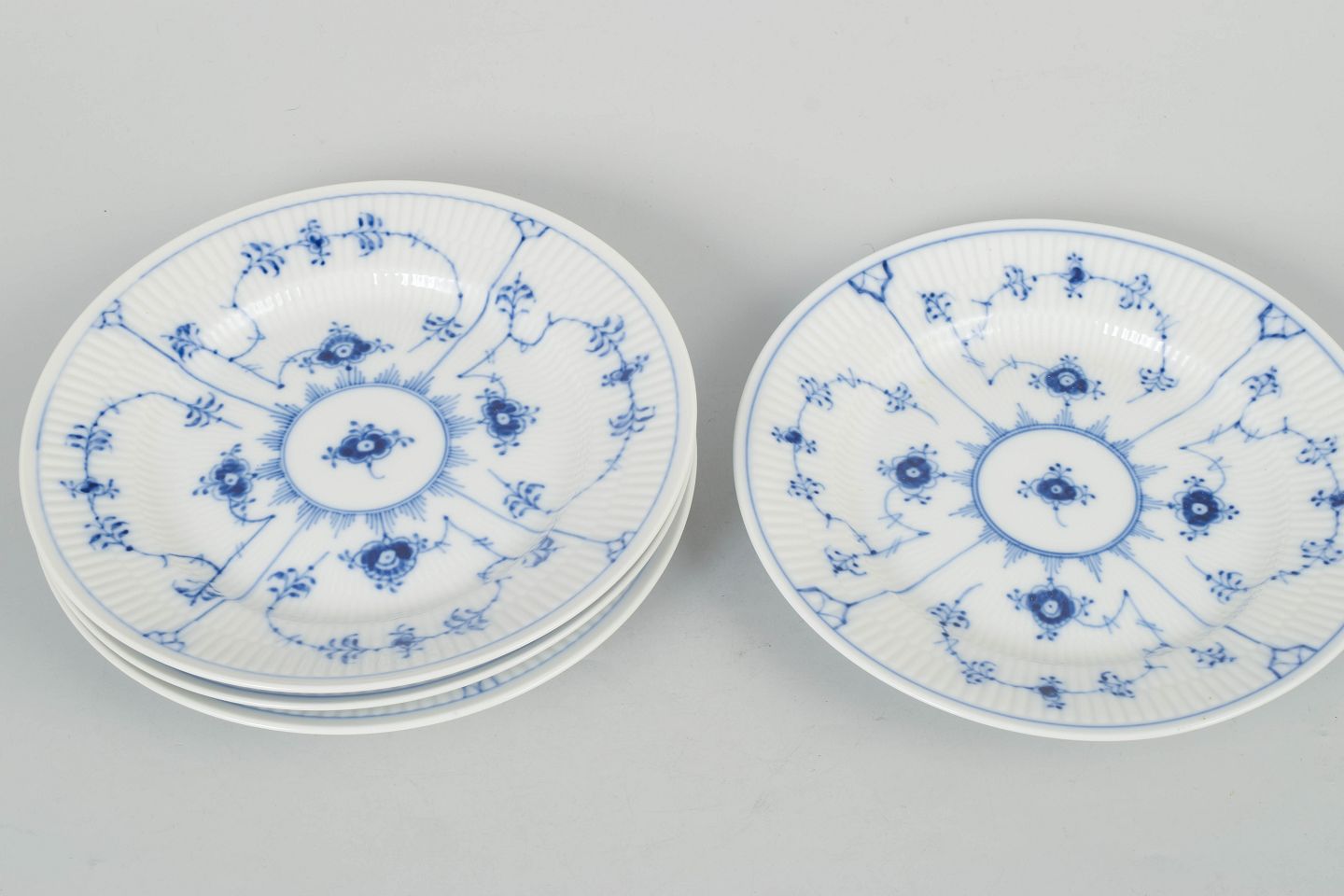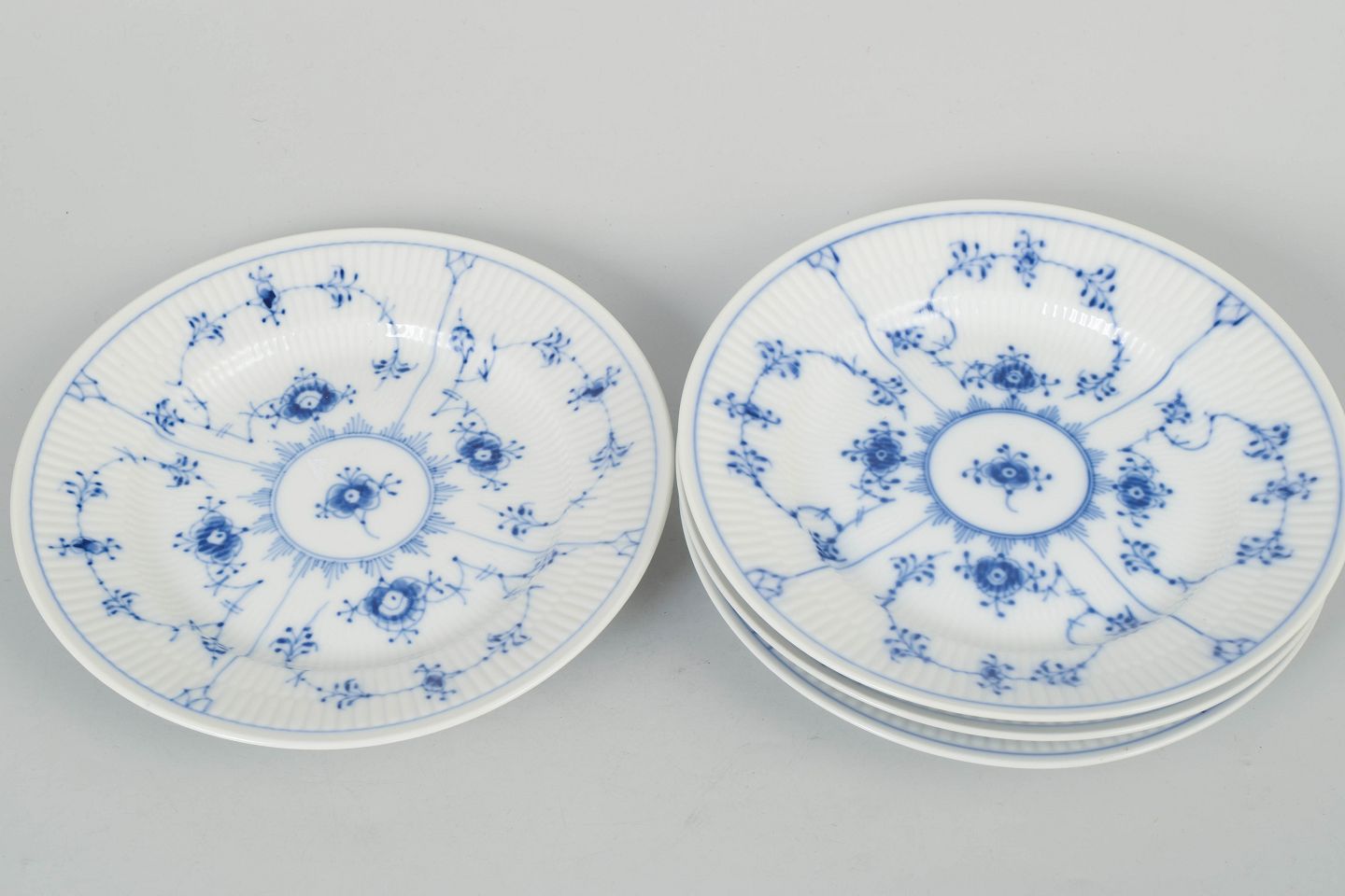 Royal Copenhagen Musselmalet Riflet, sæt af fire tallerkener.Klassisk sæt af fire tallerkener i Royal Copenhagens Musselmalet Riflet stel, model 1/179, udført i håndmalet porcelæn med det ikoniske blå dekorerede mønster. Alle tallerkener er 1. sortering fra 1980’erne og repræsenterer stellets tidløse elegance og høje håndværksmæssige kvalitet.