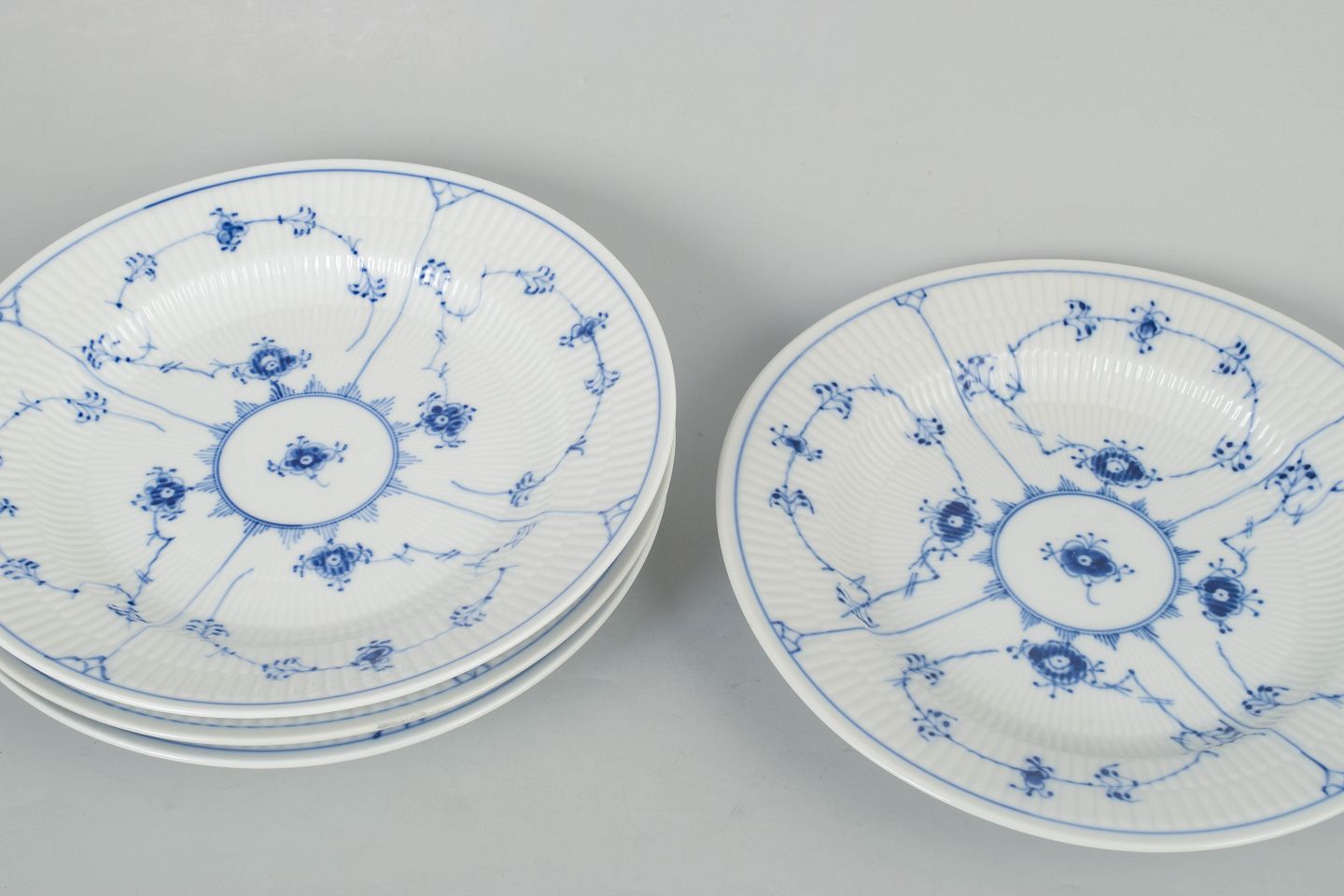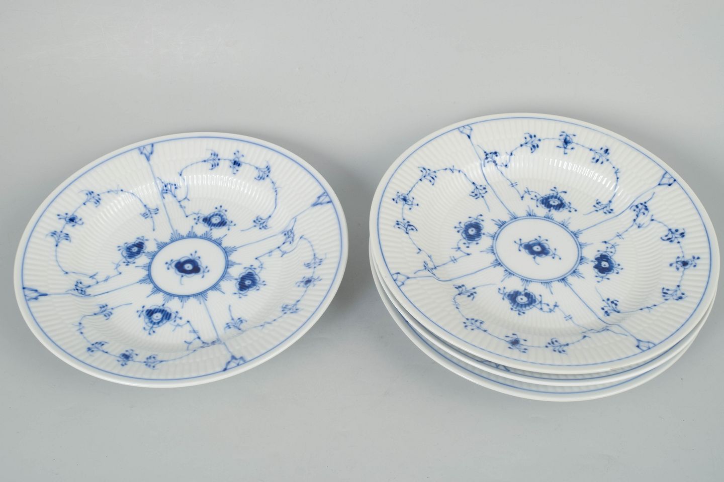 Royal Copenhagen Musselmalet Riflet, sæt af fire middagstallerkener.Klassisk sæt af fire middagstallerkener i Royal Copenhagens Musselmalet Riflet stel, model 1/175, udført i håndmalet porcelæn med det ikoniske blå dekorerede mønster. Tallerkenerne repræsenterer forskellige fabrikssorteringer og fremviser den tidløse elegance, der har gjort stellet til en dansk designklassiker.